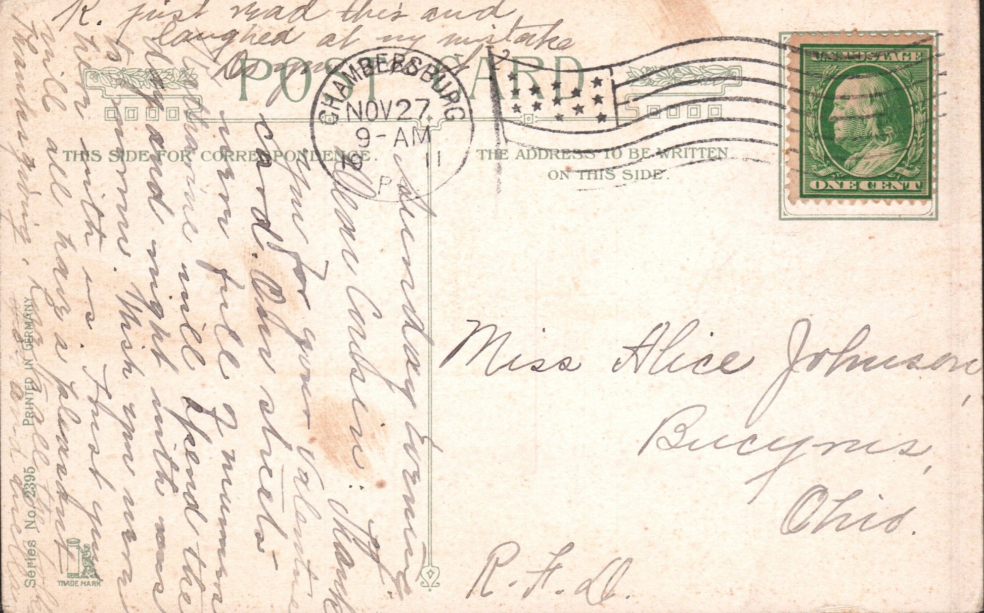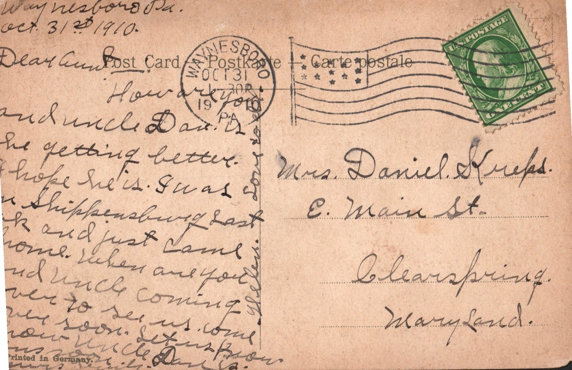 Rouzerville 1907 cds on post card overstruck with Waynesboro Flag cancel