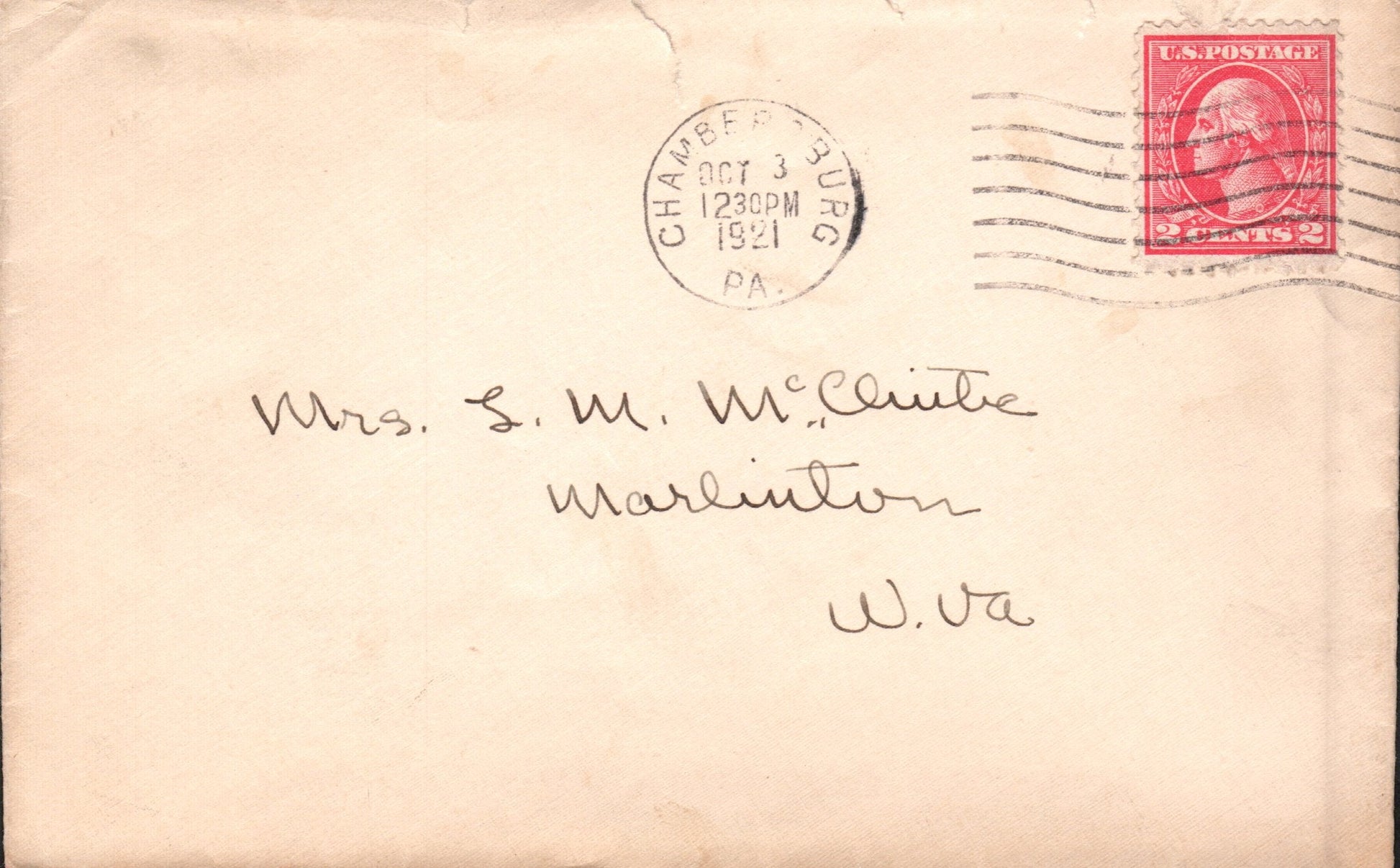 Chambersburg 1911 Flag cancel on post card; 1921 machine cancel on cover; 1921` date-out duplex on cover