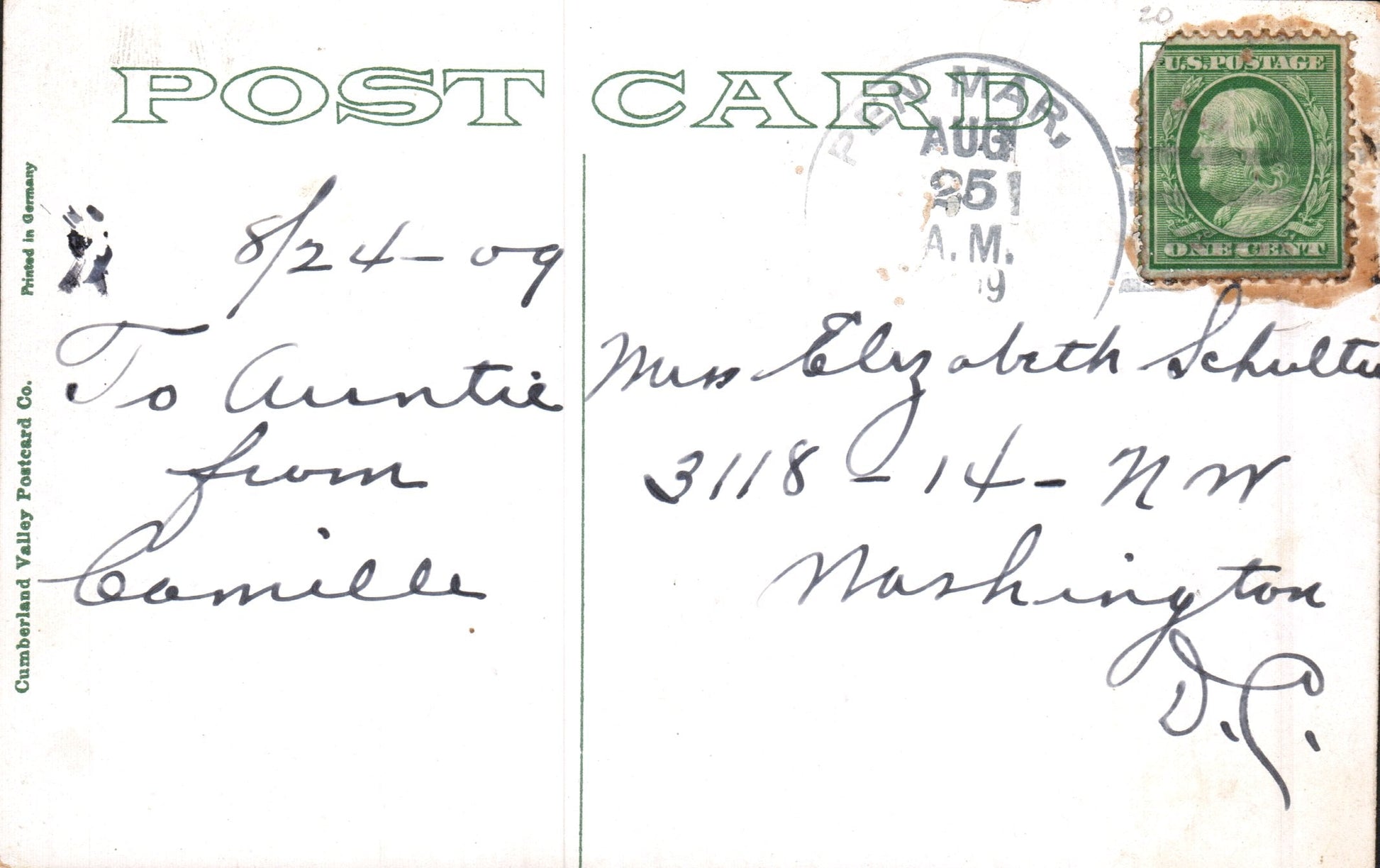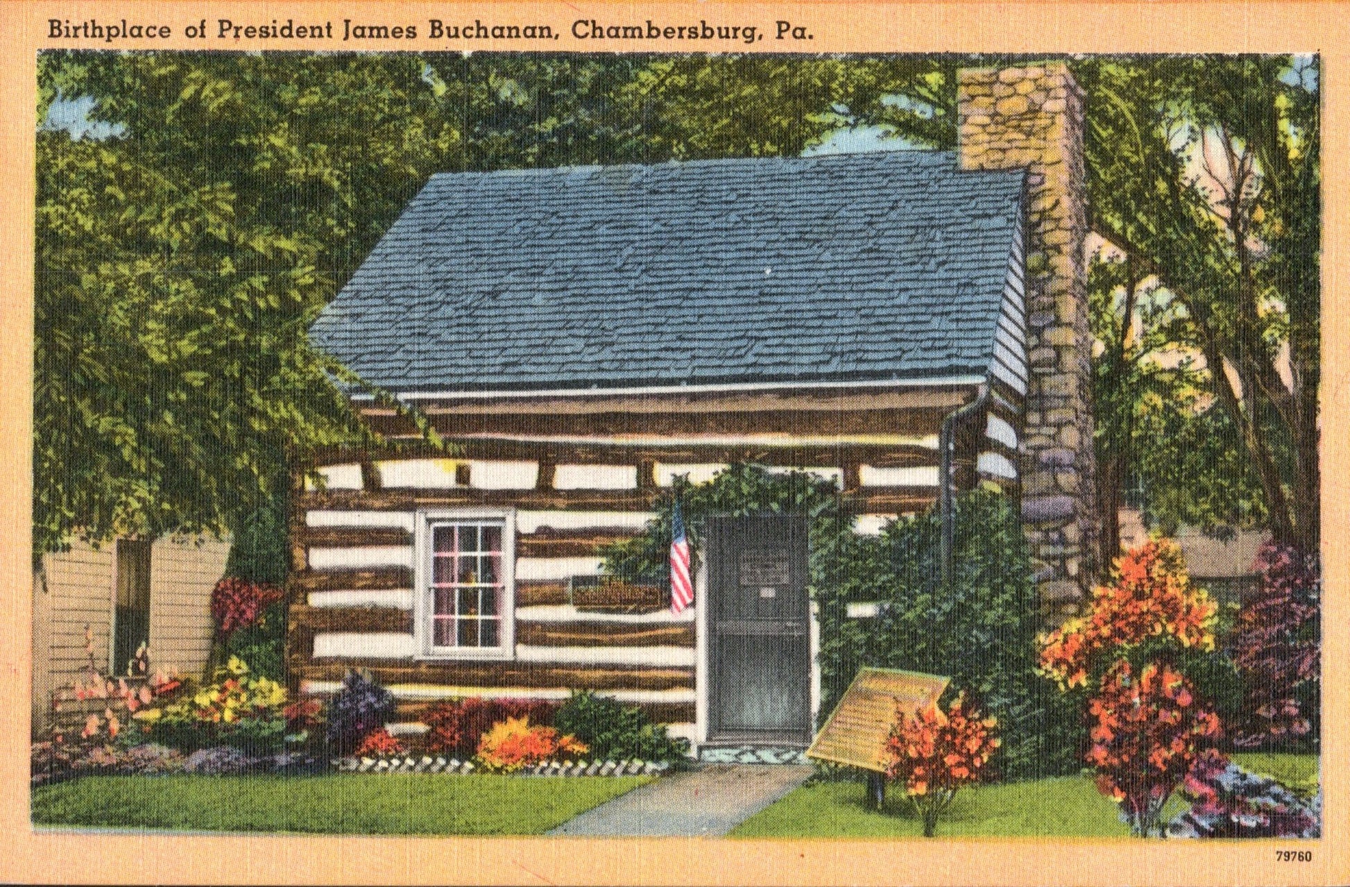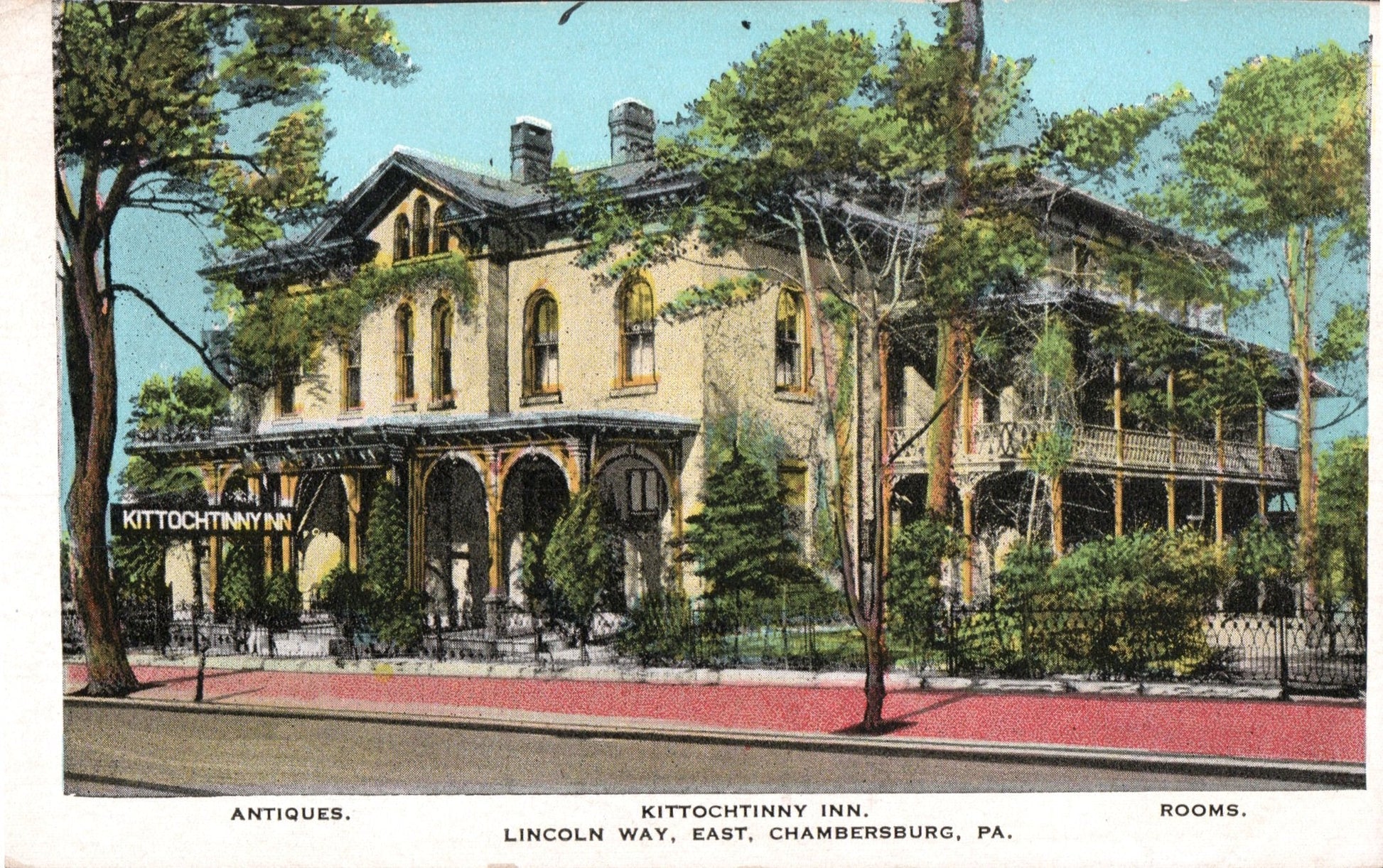 Post cards: Kittochtinny Inn [date?]; Hotel Washington lobby, town name mis-spelled; Memorial Square and Court House; Birthplace of James Buchanan [linen]
