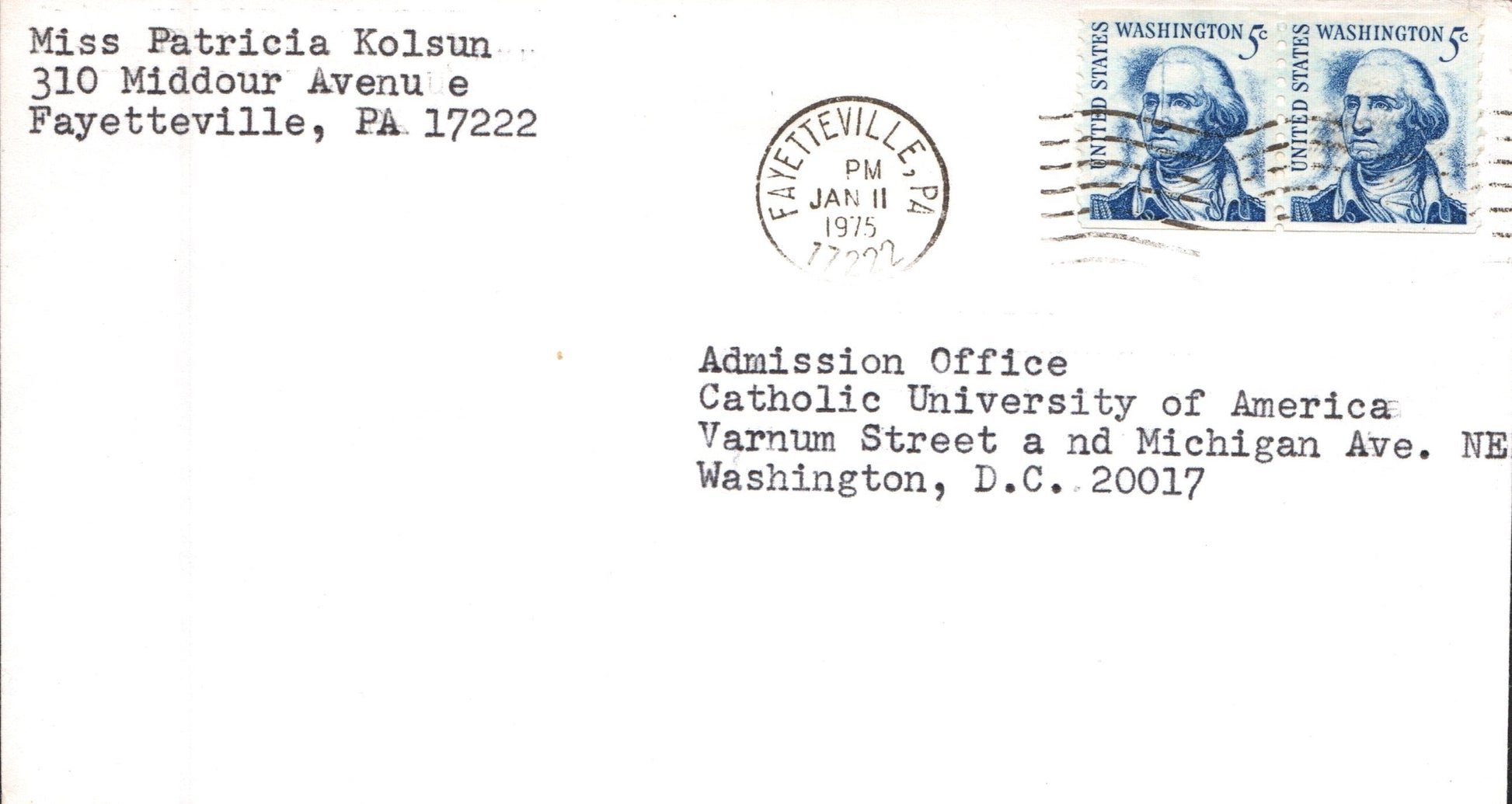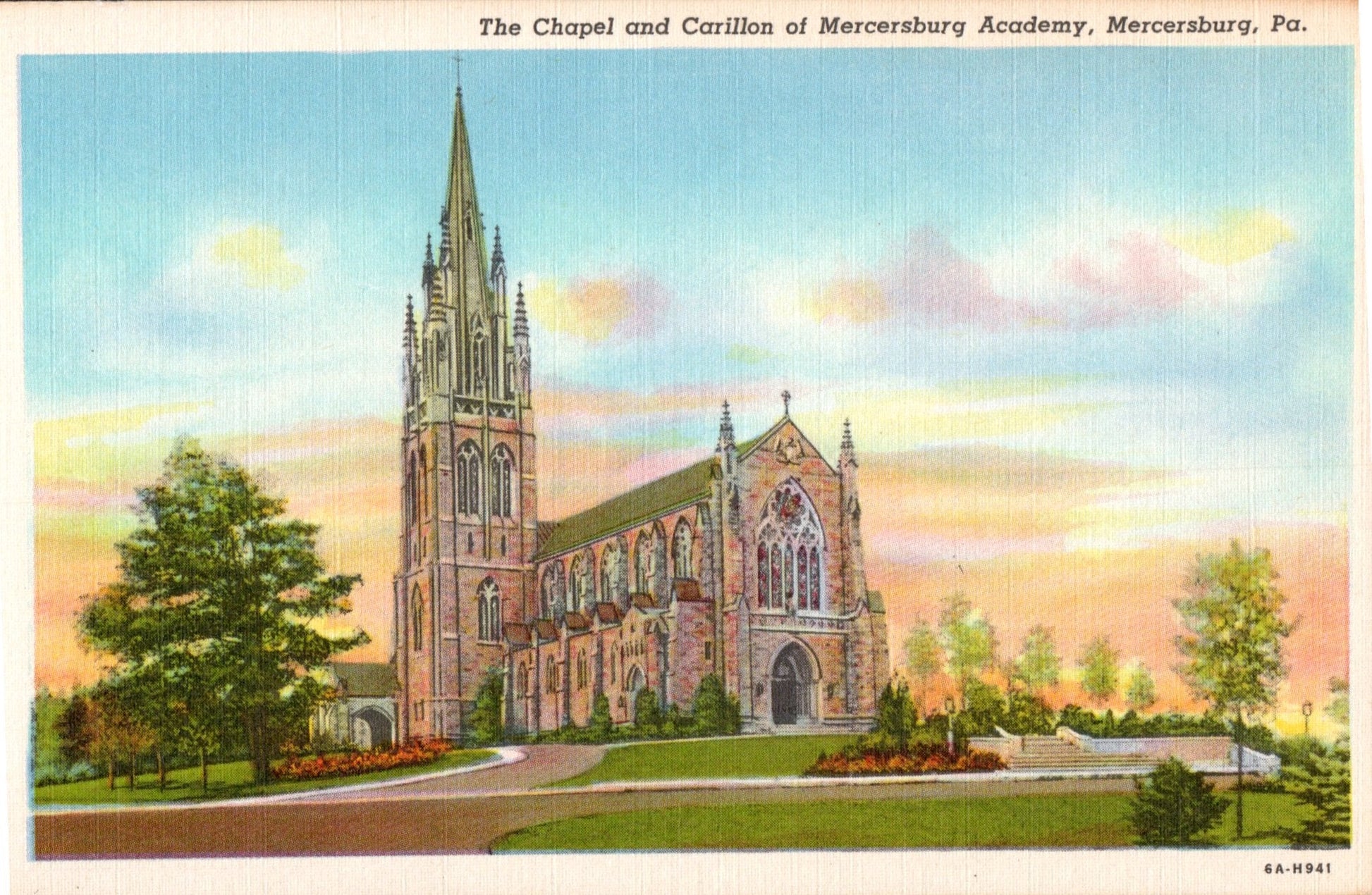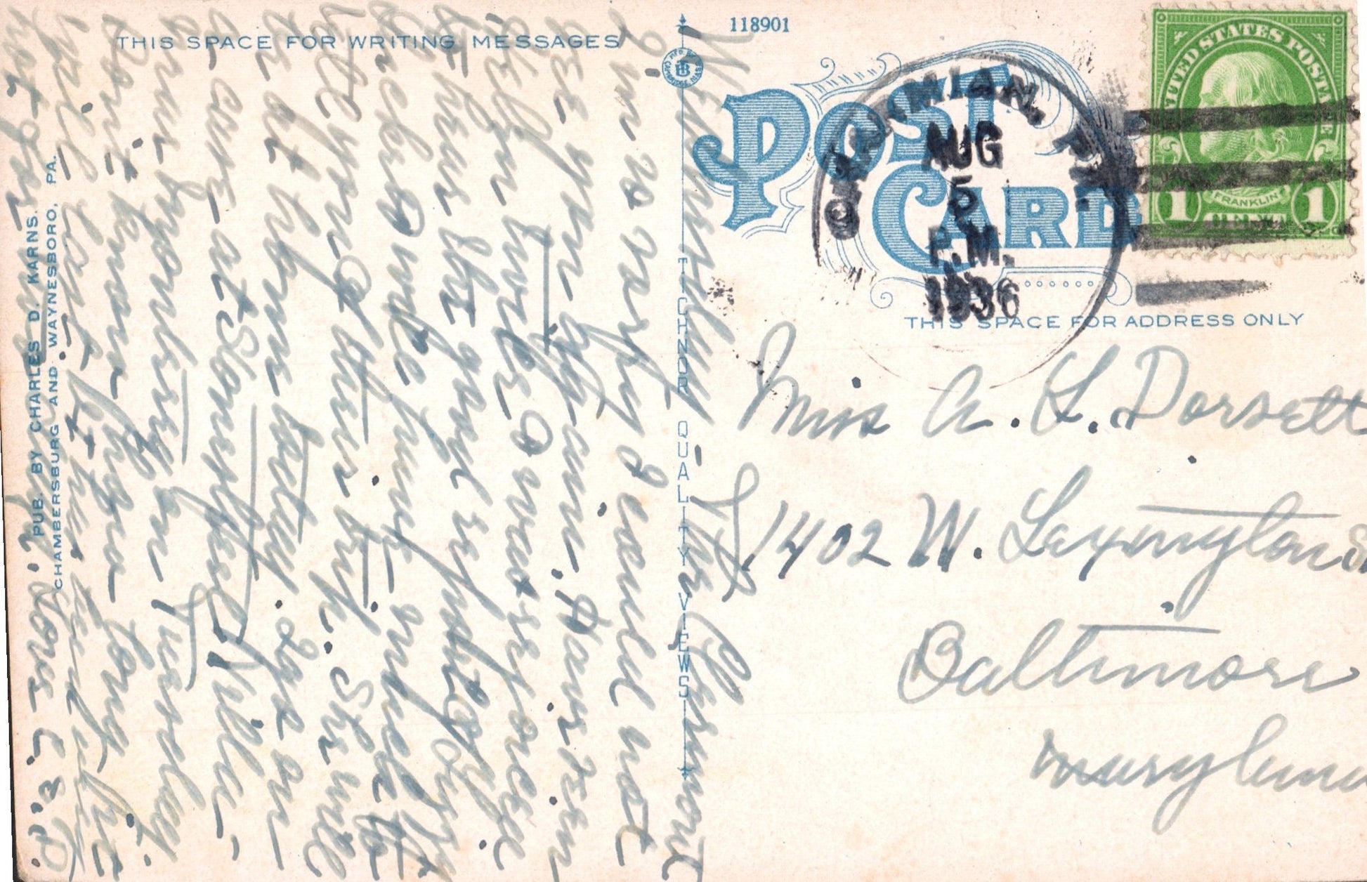 Charmian (1892-1972) 1936 4-bar on post card, view of Waynesboro Catholic Church