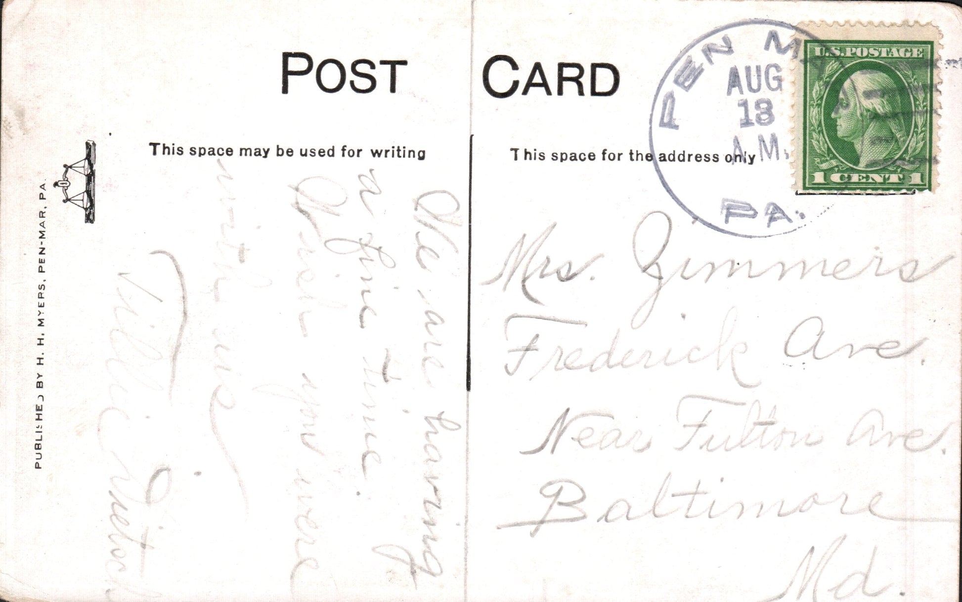 Pen Mar (1883-1967) poor 1909 4-bar on post card; undated large-letter 4-bar on post card