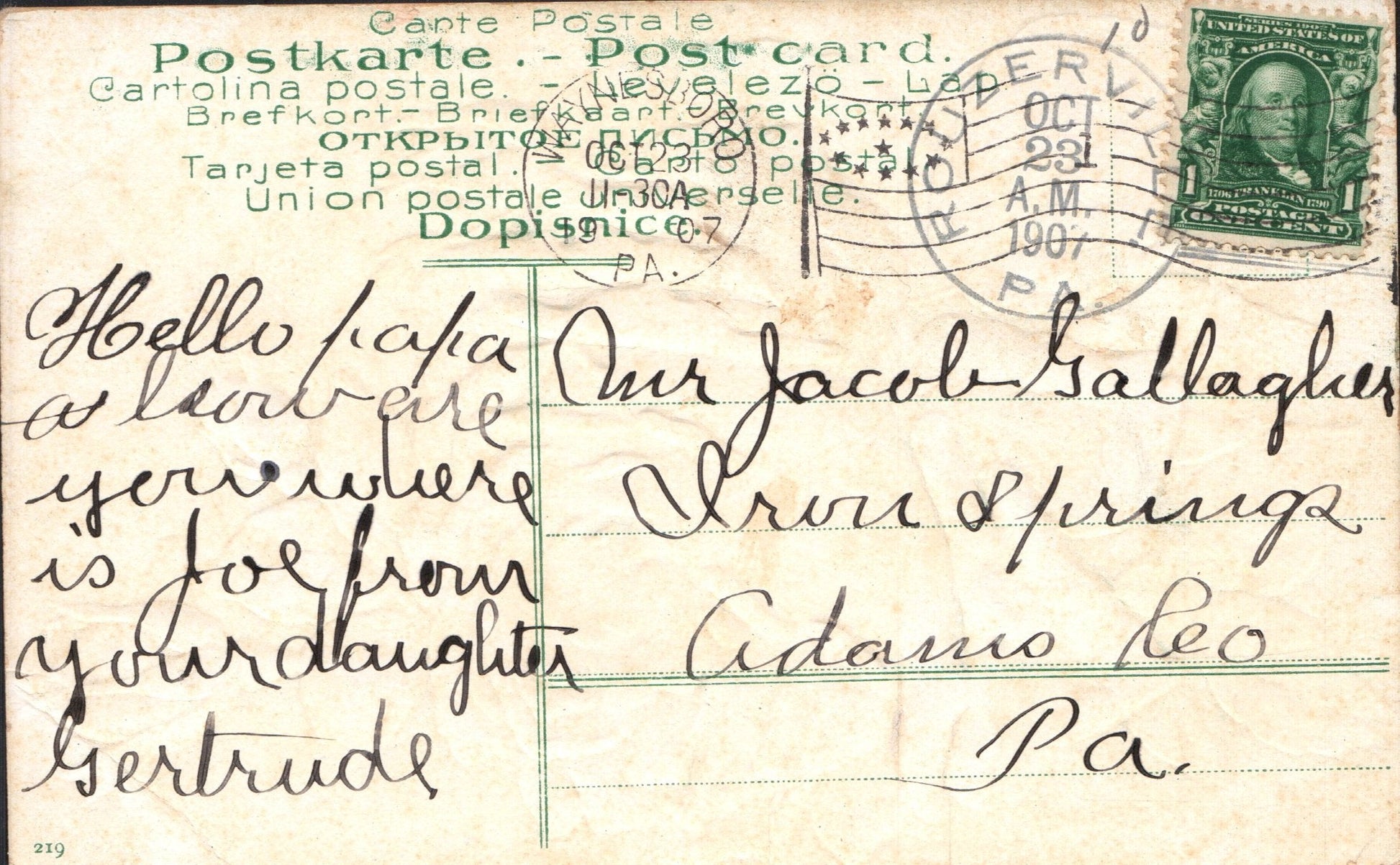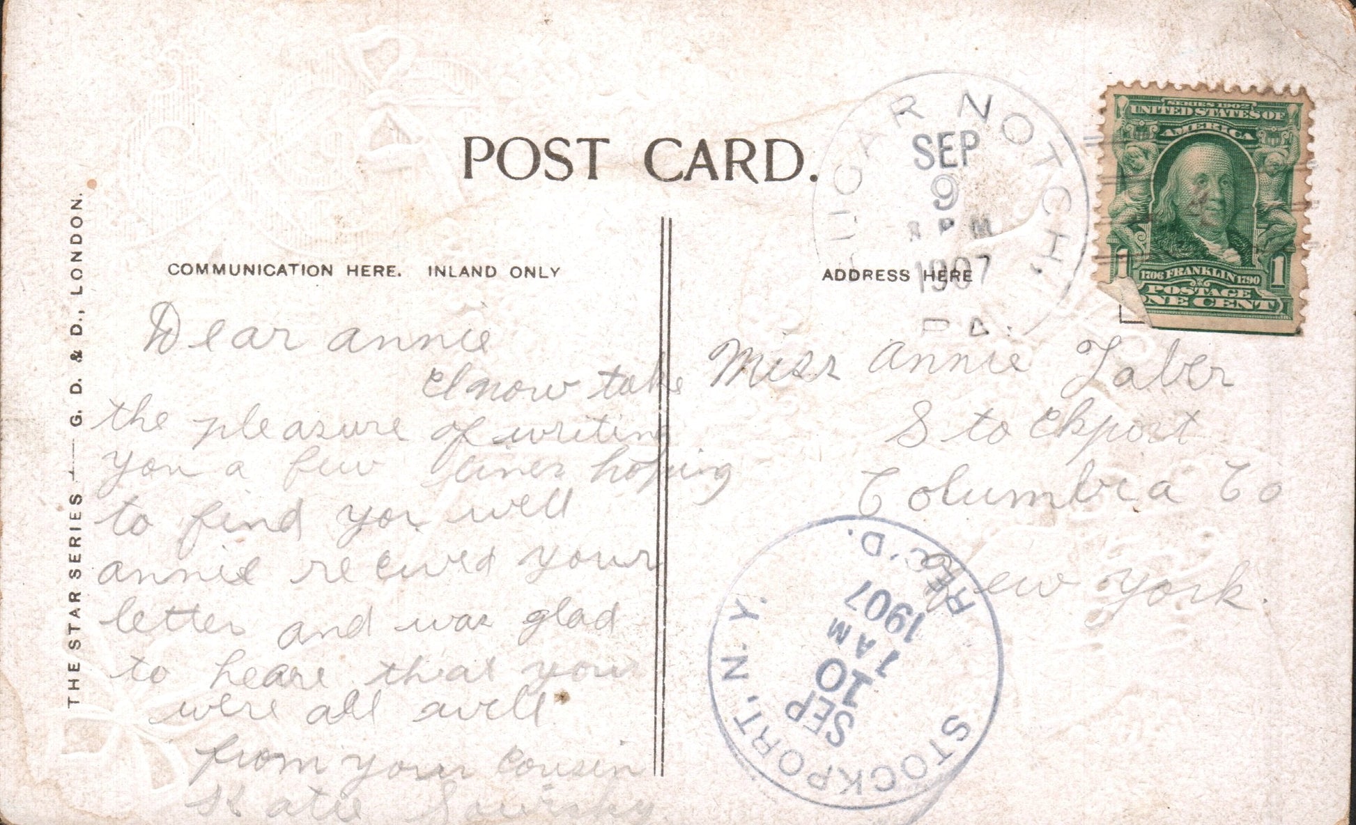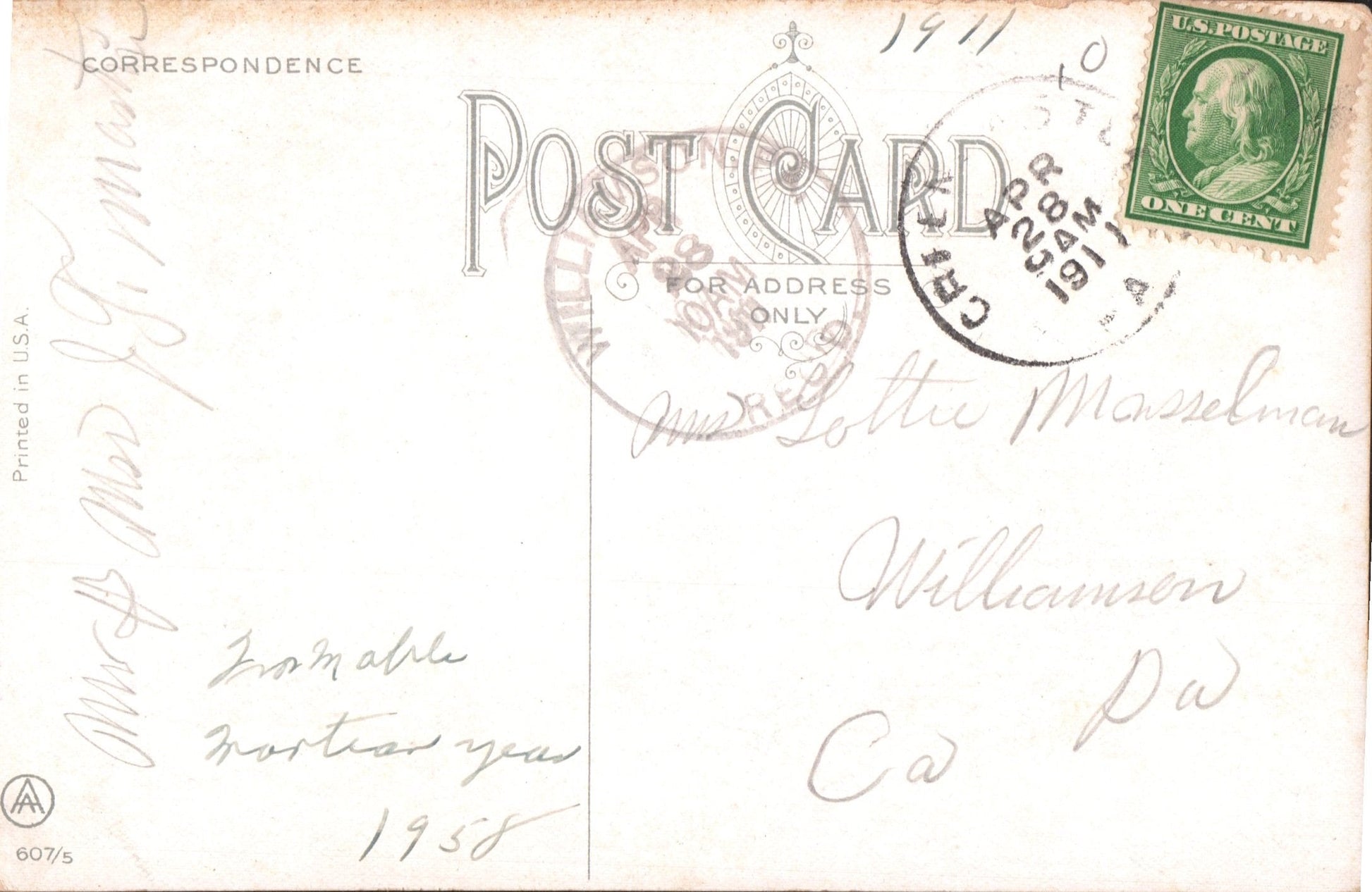 Williamson 1906 4-bar on post card; 1911 Rec’d mark on post card