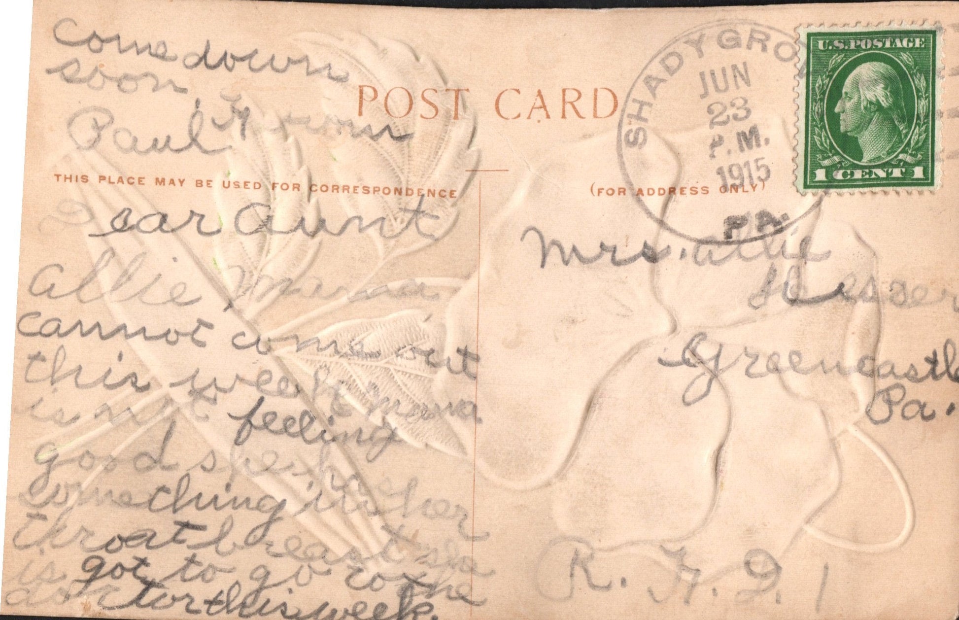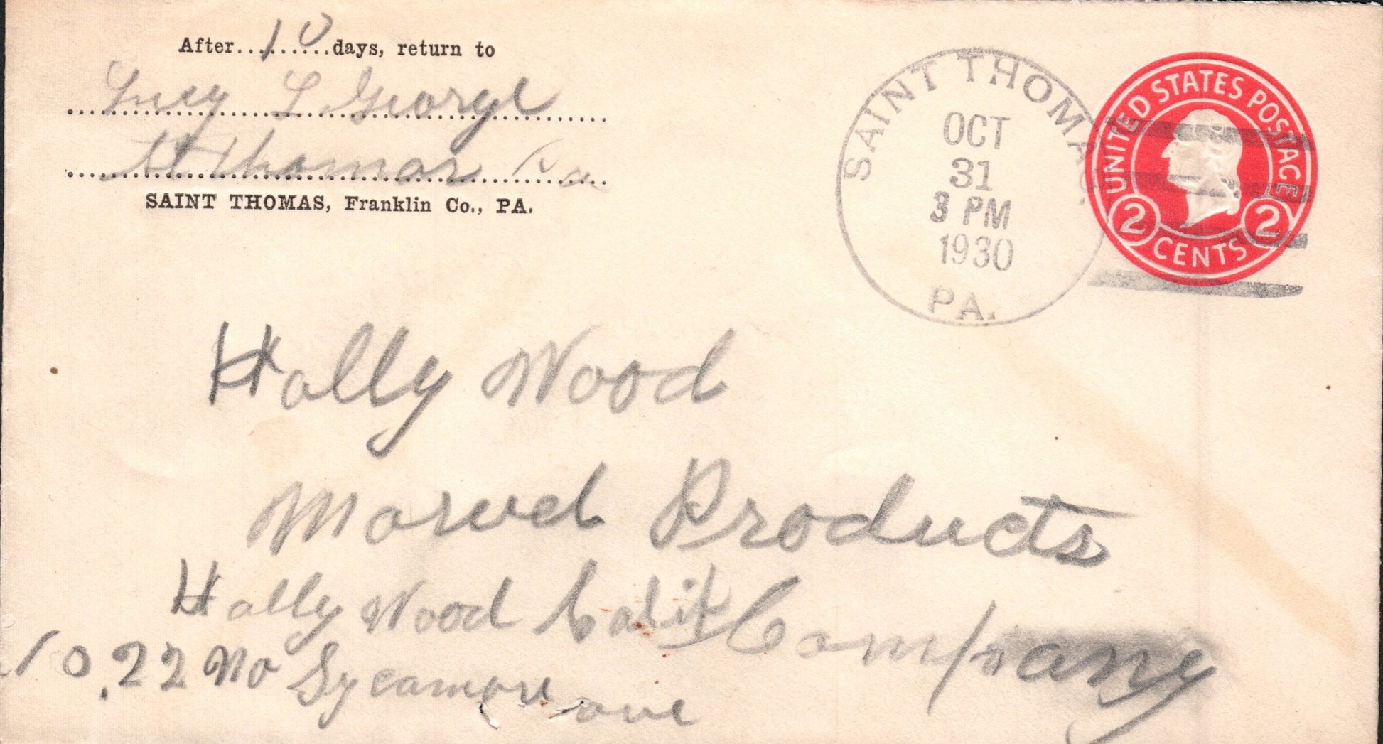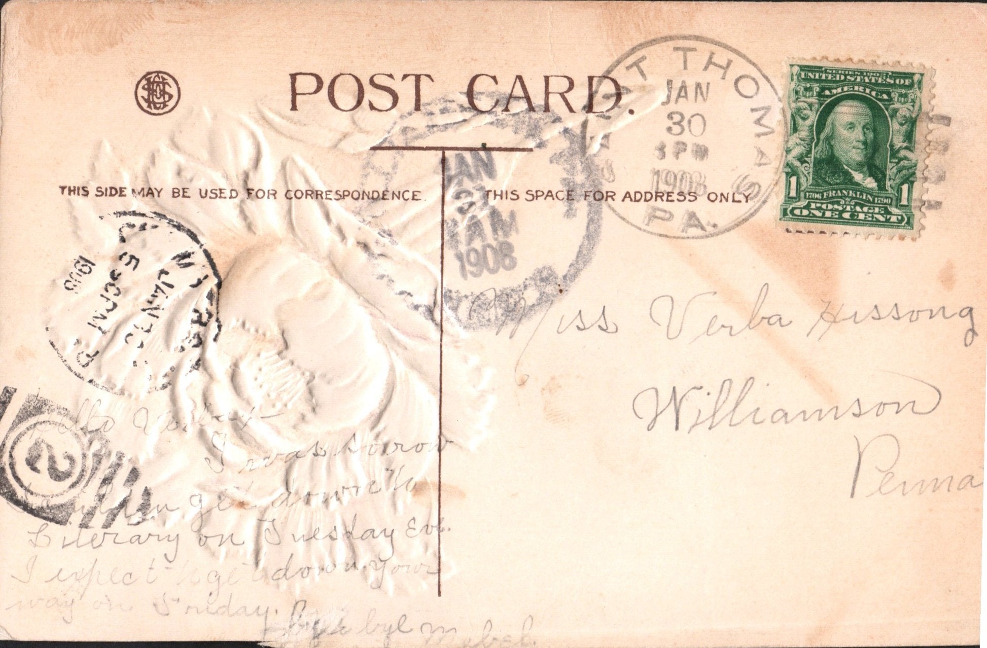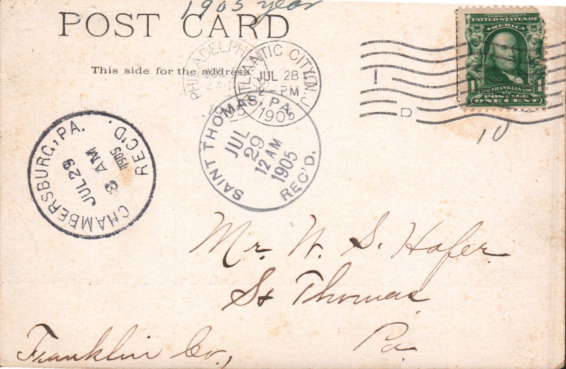 Saint Thomas 1905 Rec’d mark on post card from Atlantic City, also nice Chambersburg Rec’d as transit mark; 1908 Doane on post card, also [poor Williamson Rec’d; 1930 4-bar on cover
