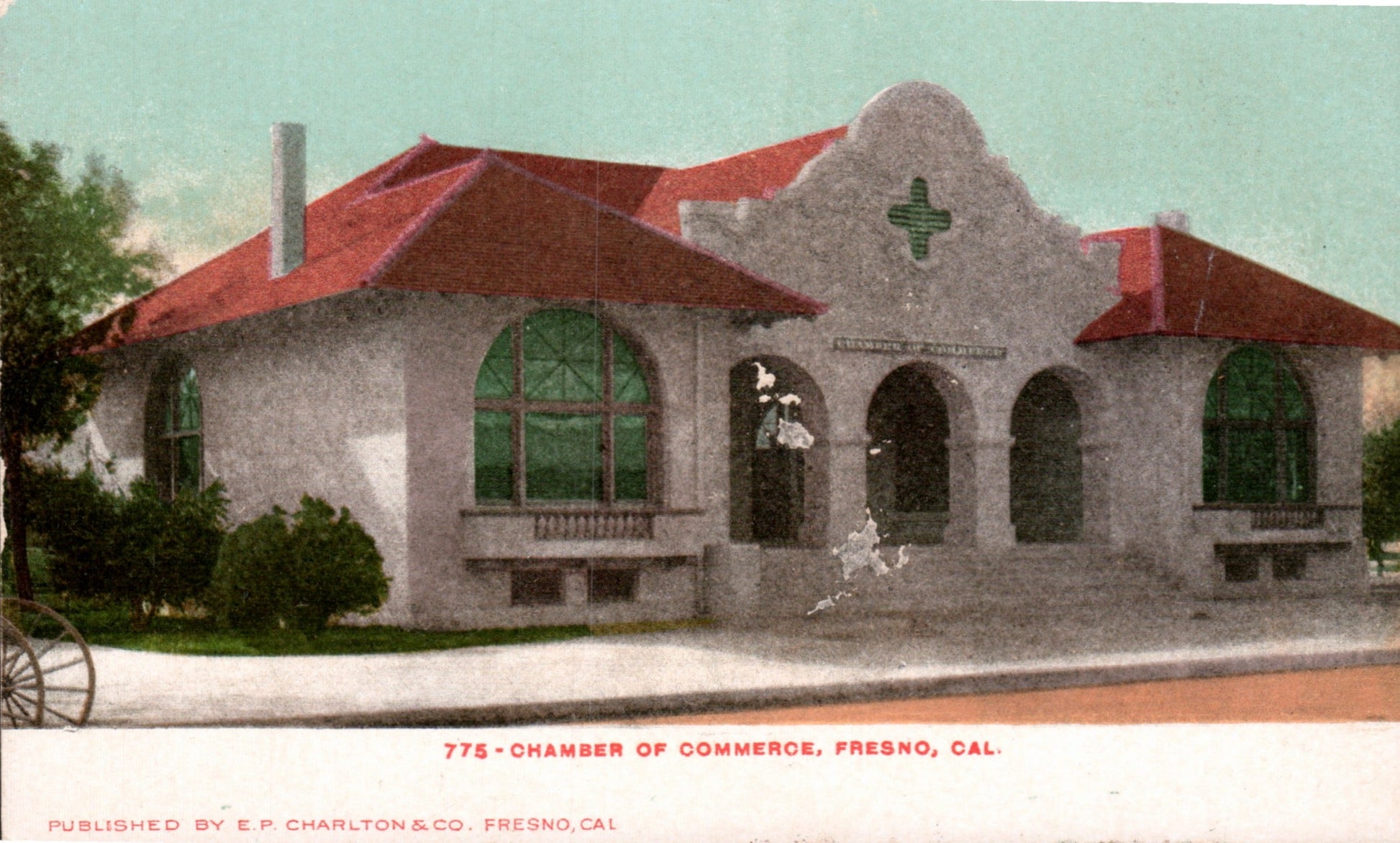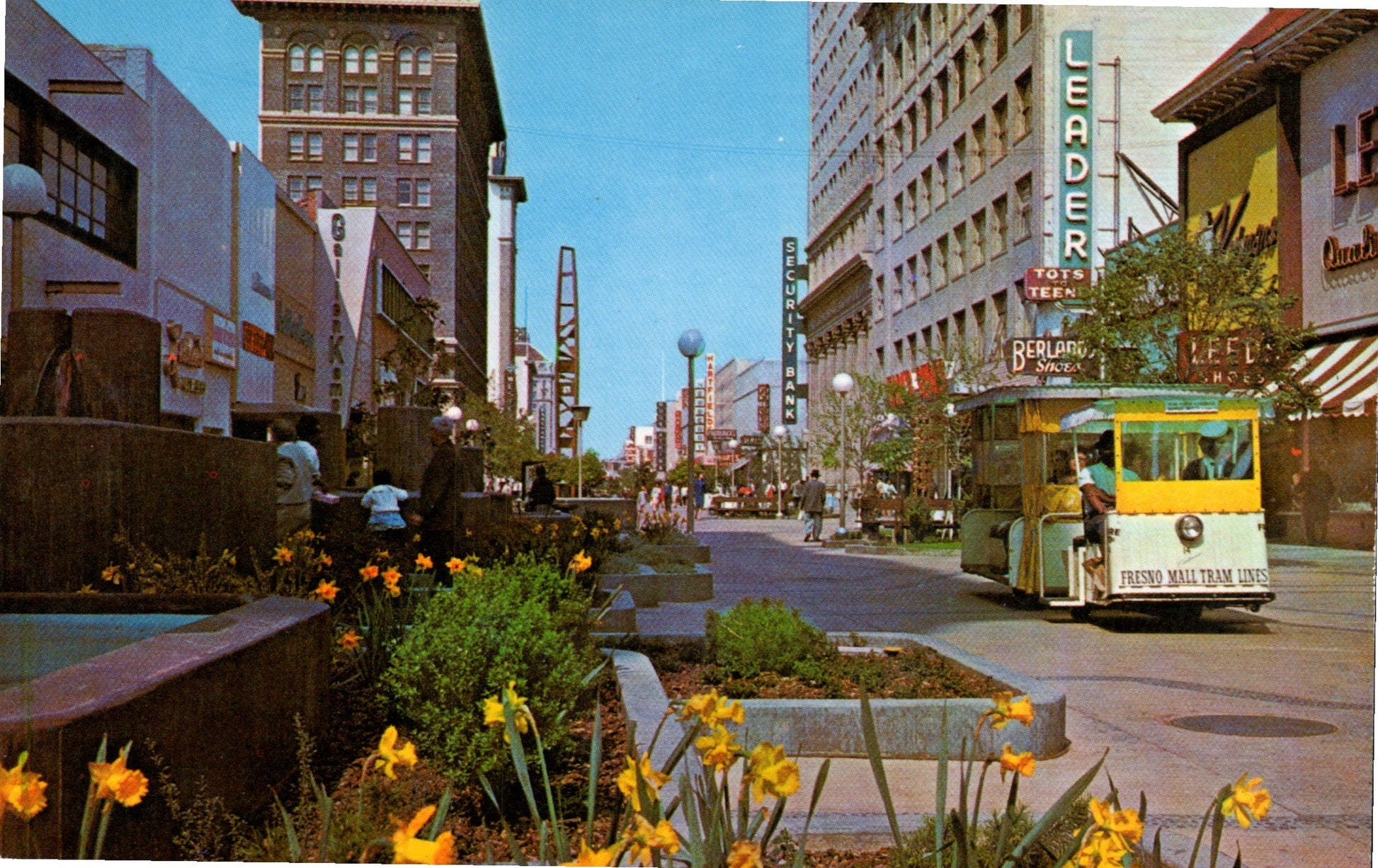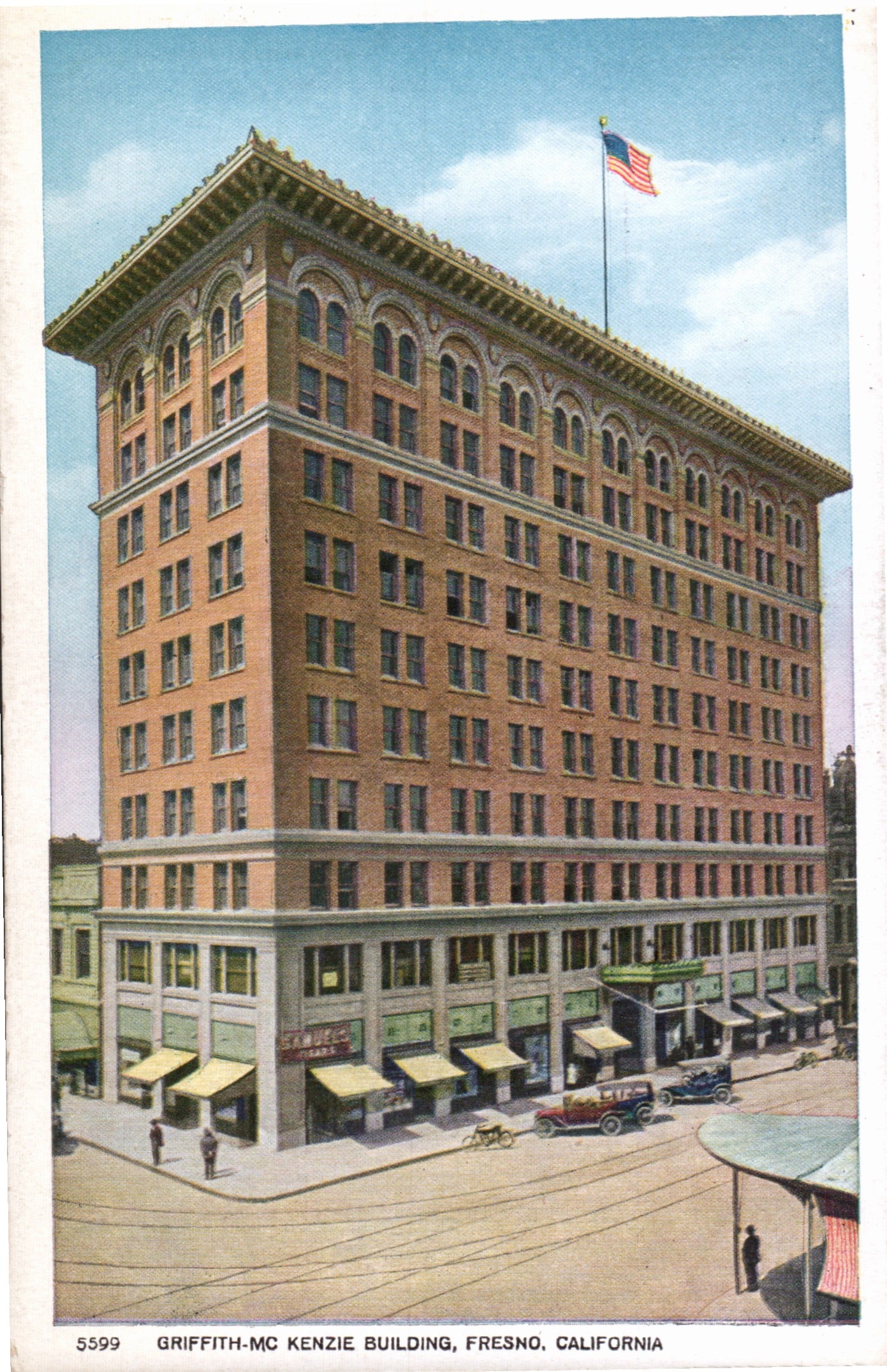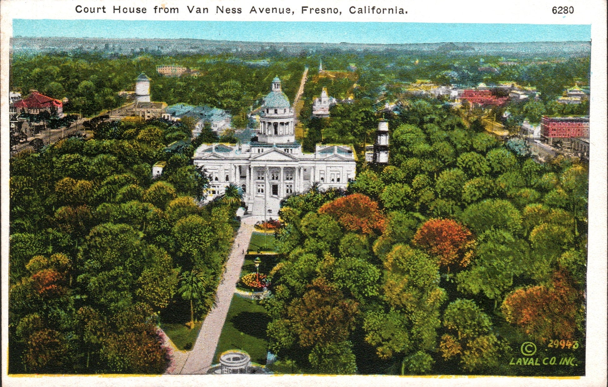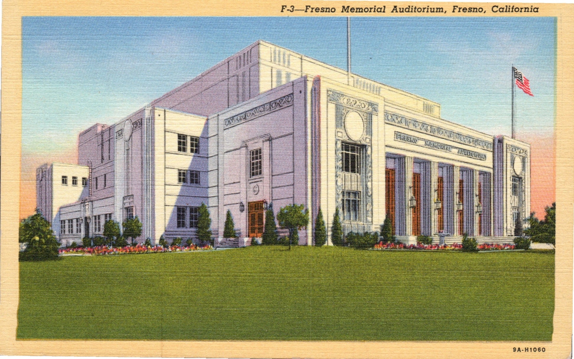 Post card: “Fresno’s Mall” [chrome]; Griffith-McKenzie building [1920s]; “Motel California” [chrome]; “Court House from Van Ness Avenue” [bird’s-eye view, 1920]; Chamber of Commerce [c.1920, front damage]; Memorial Auditorium [linen]