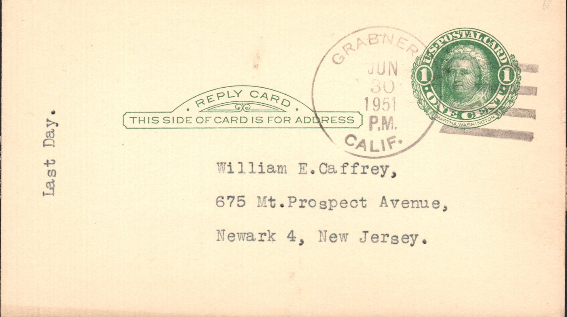Grabner (1914-1951) 1951 4-bar on LD Postal Card