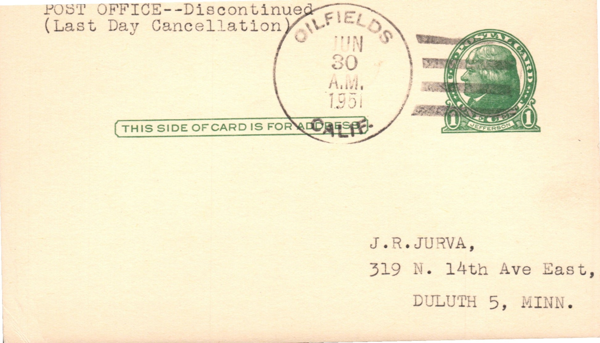 Oilfields (1908-1951) 1909 4-bar on post card; 1951 4-bar on LD Postal Card