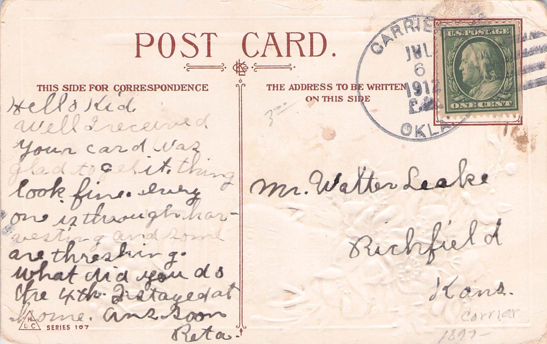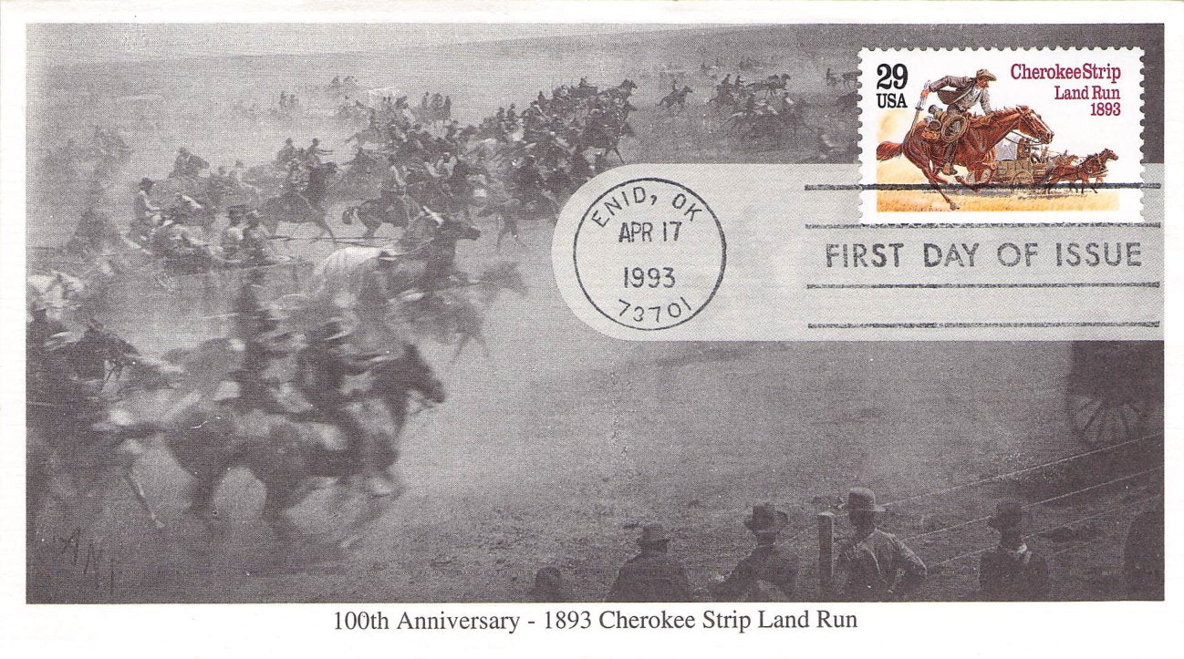Enid 1912 Flag cancel on post card [real photo “Public Square, Enid”]; 1935 machine cancel on cover, cachet for Cherokee Strip Celebration; 1940 machine cancel on cover, “Carter’s” corner; 1993 machine cancel on cover, FD 29¢ Cherokee Strip stamp .
