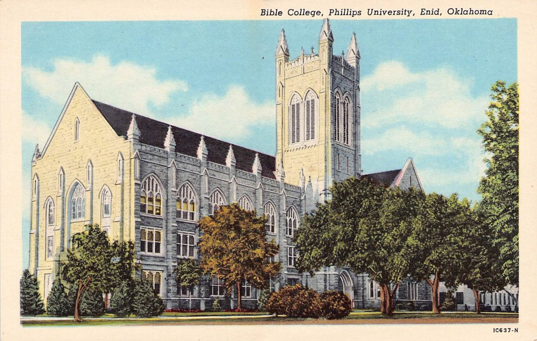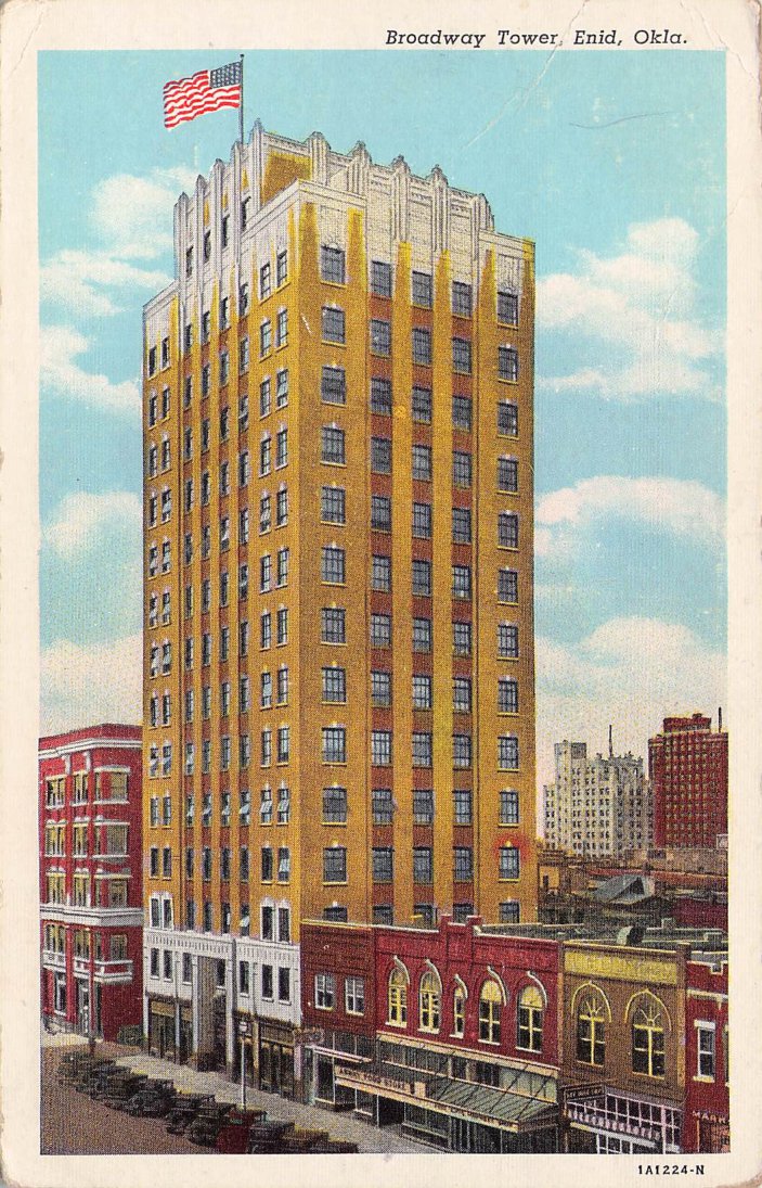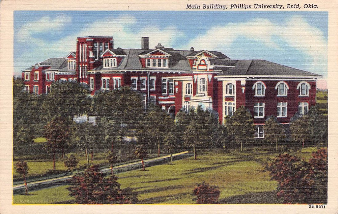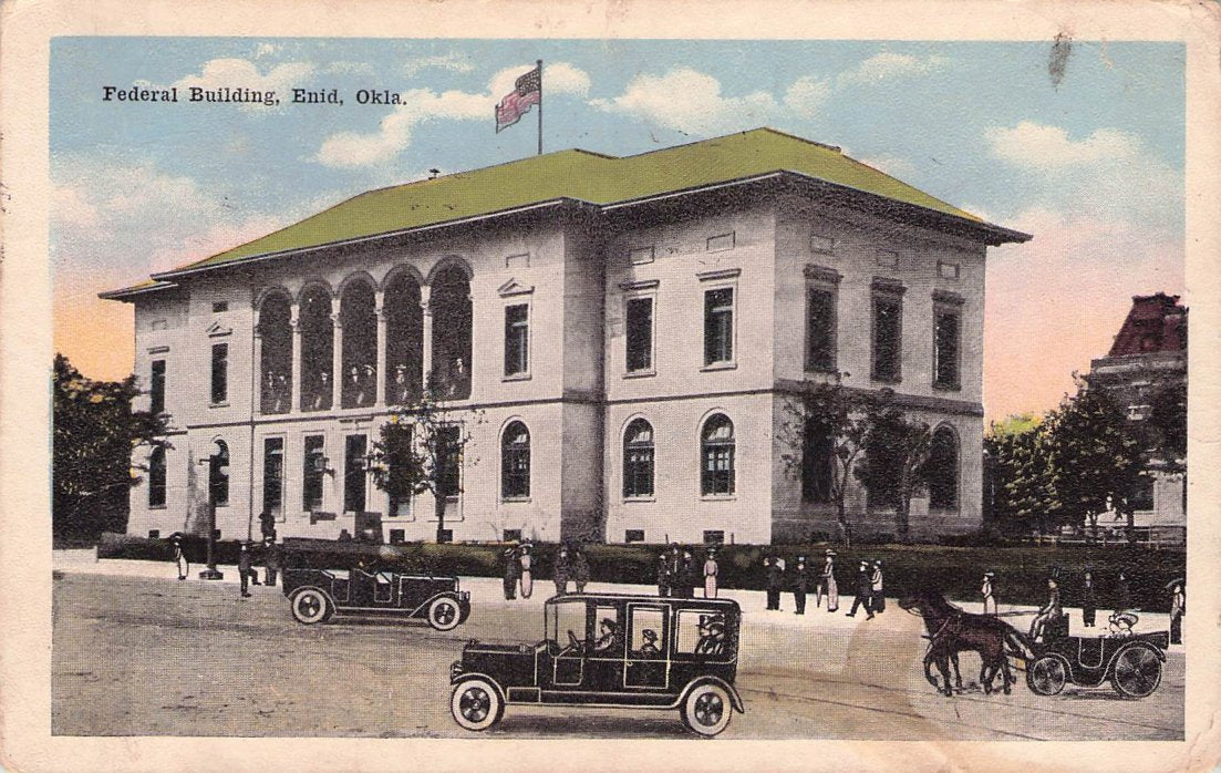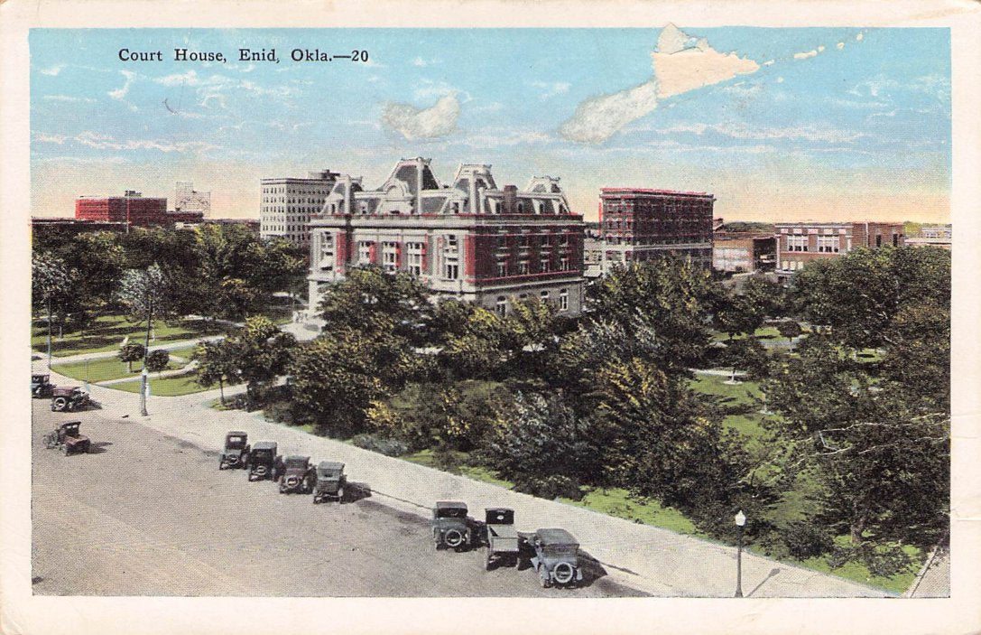 Post cards: Bass Building [white border, 1940]; Broadway Tower [white border, 1940]; Enid National Bank [1915]; Youngblood Hotel [c.1930]; Grain elevators [chrome]; Federal Building [1917]; Court House [white border, 1930s]; Court House [linen]; Enid Springs Hospital [c.1930]; Phillips University Main Building [linen]; “Bible College” [linen]; First Presbyterian church [linen]; Springs Park [1939]; “Sunken Gardens at Springs Park” [c.1930]