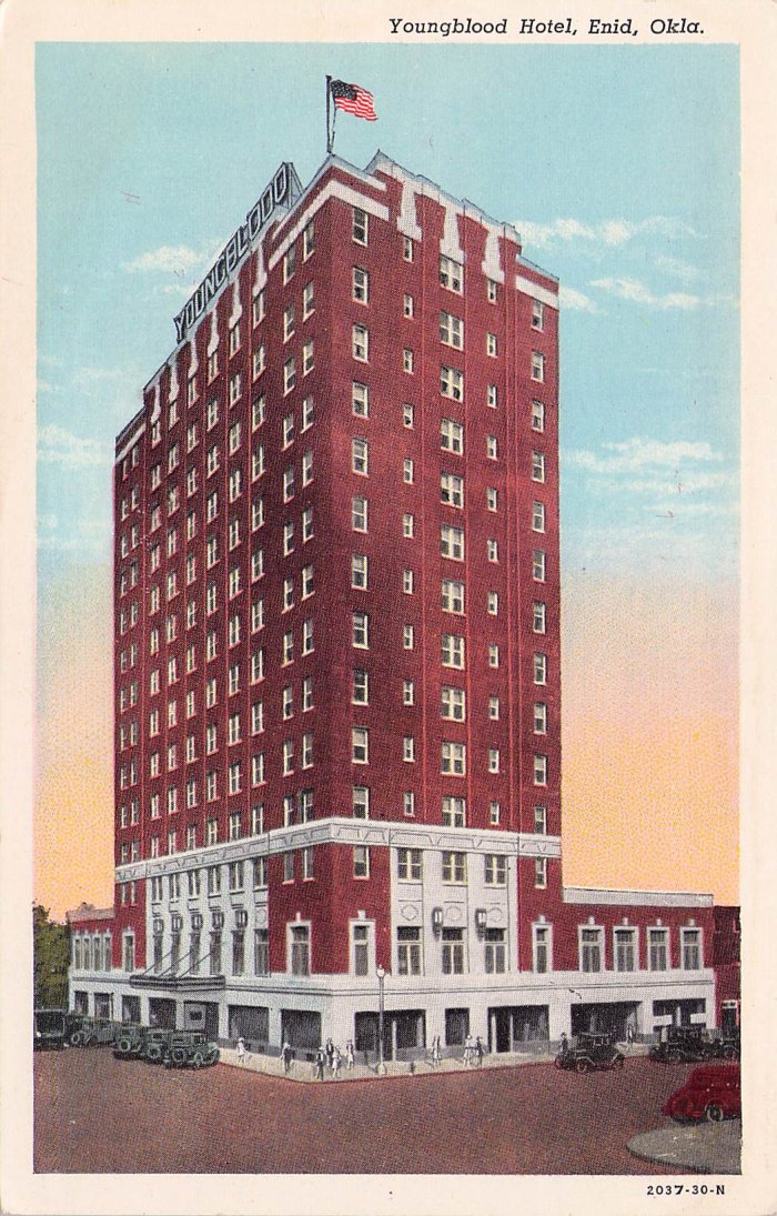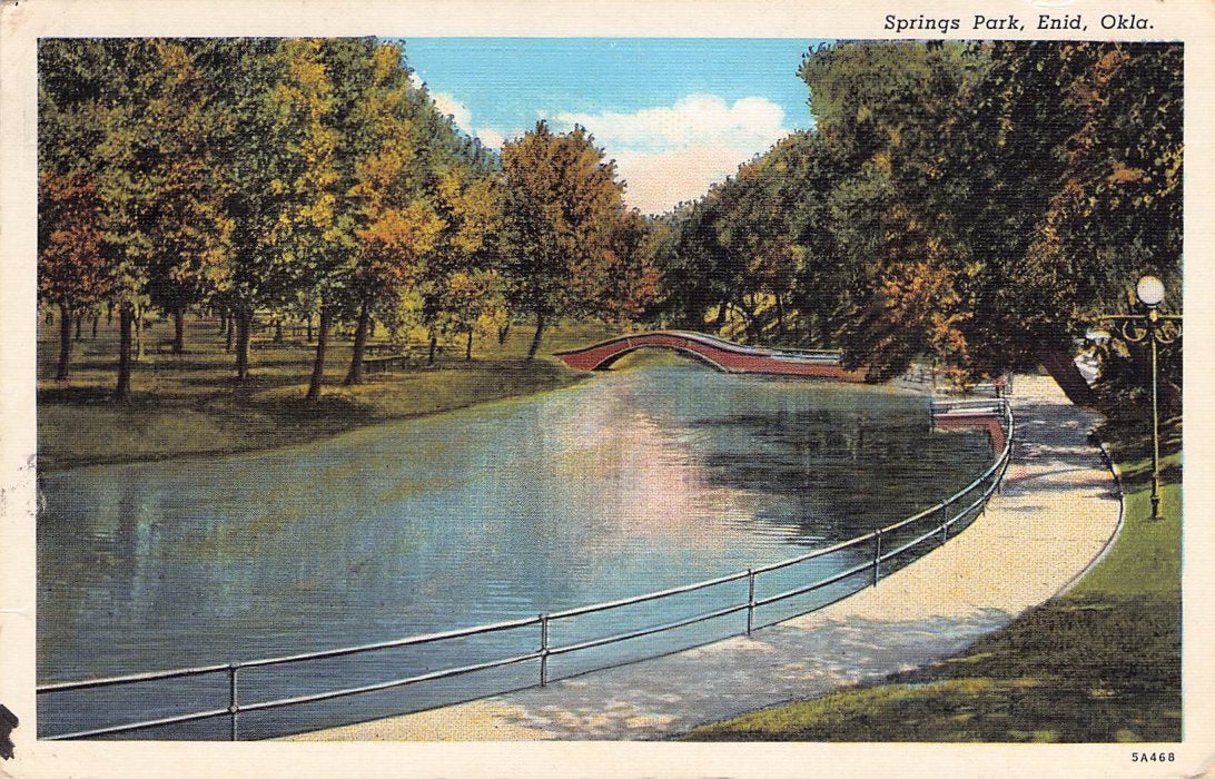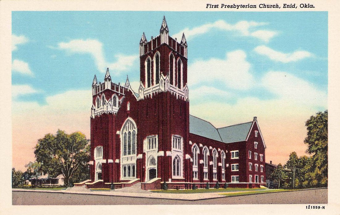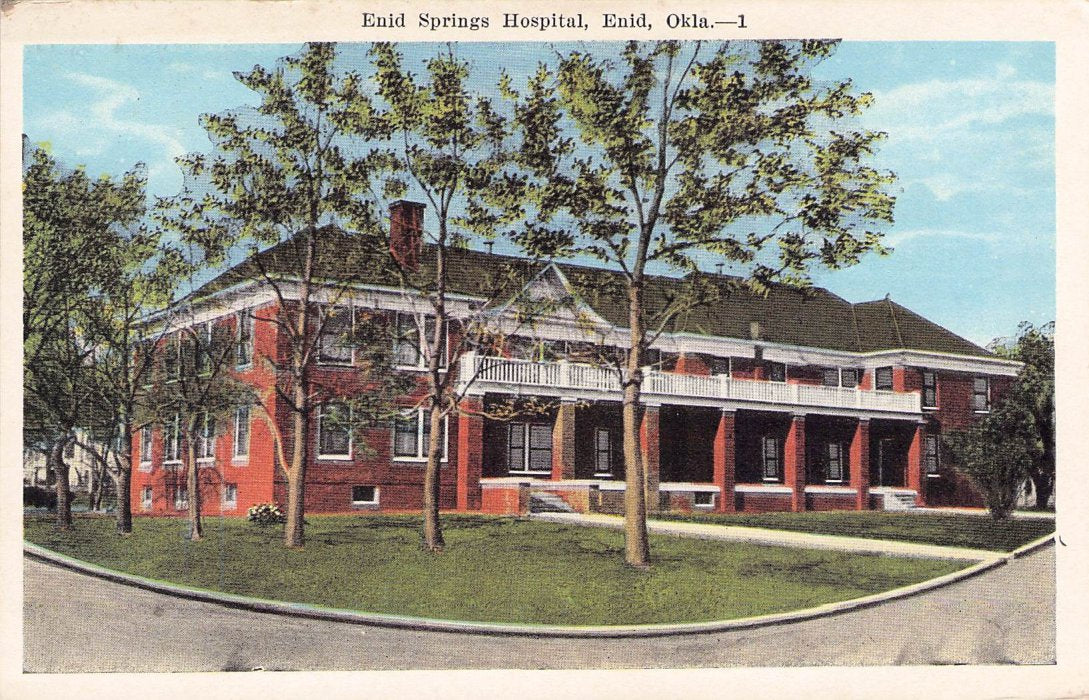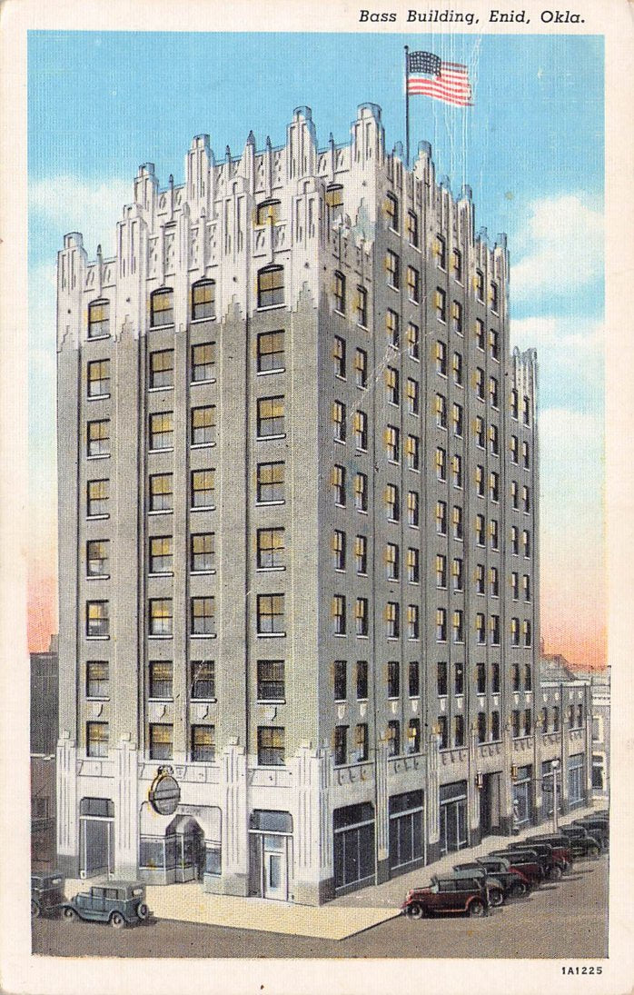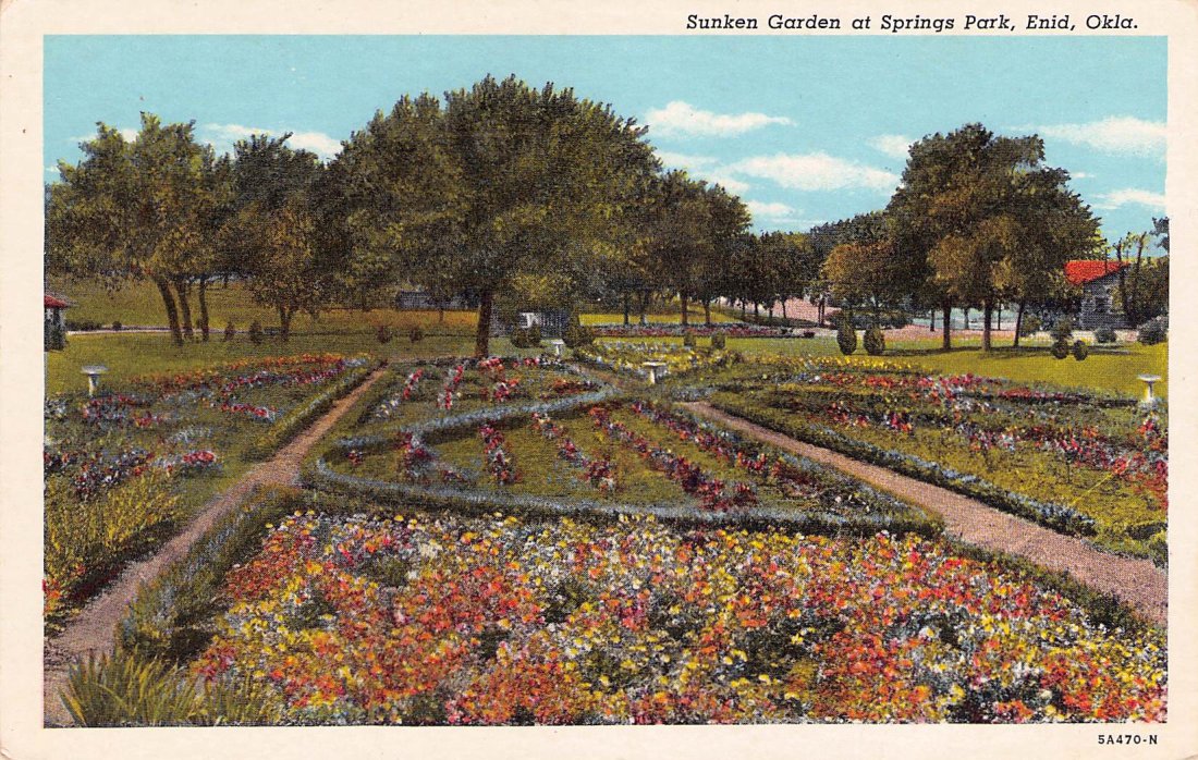 Post cards: Bass Building [white border, 1940]; Broadway Tower [white border, 1940]; Enid National Bank [1915]; Youngblood Hotel [c.1930]; Grain elevators [chrome]; Federal Building [1917]; Court House [white border, 1930s]; Court House [linen]; Enid Springs Hospital [c.1930]; Phillips University Main Building [linen]; “Bible College” [linen]; First Presbyterian church [linen]; Springs Park [1939]; “Sunken Gardens at Springs Park” [c.1930]