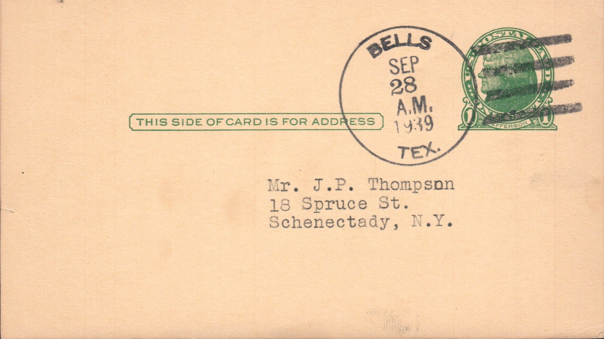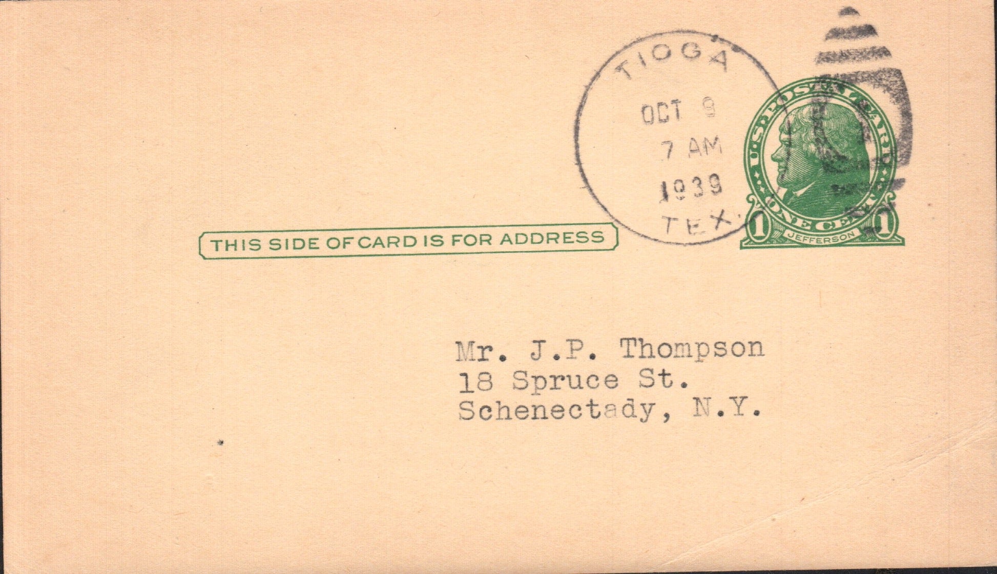 - Tioga 1911 4-bar on post card; 1915 duplex on Postal Card; 1939 duplex on Postal Card:
