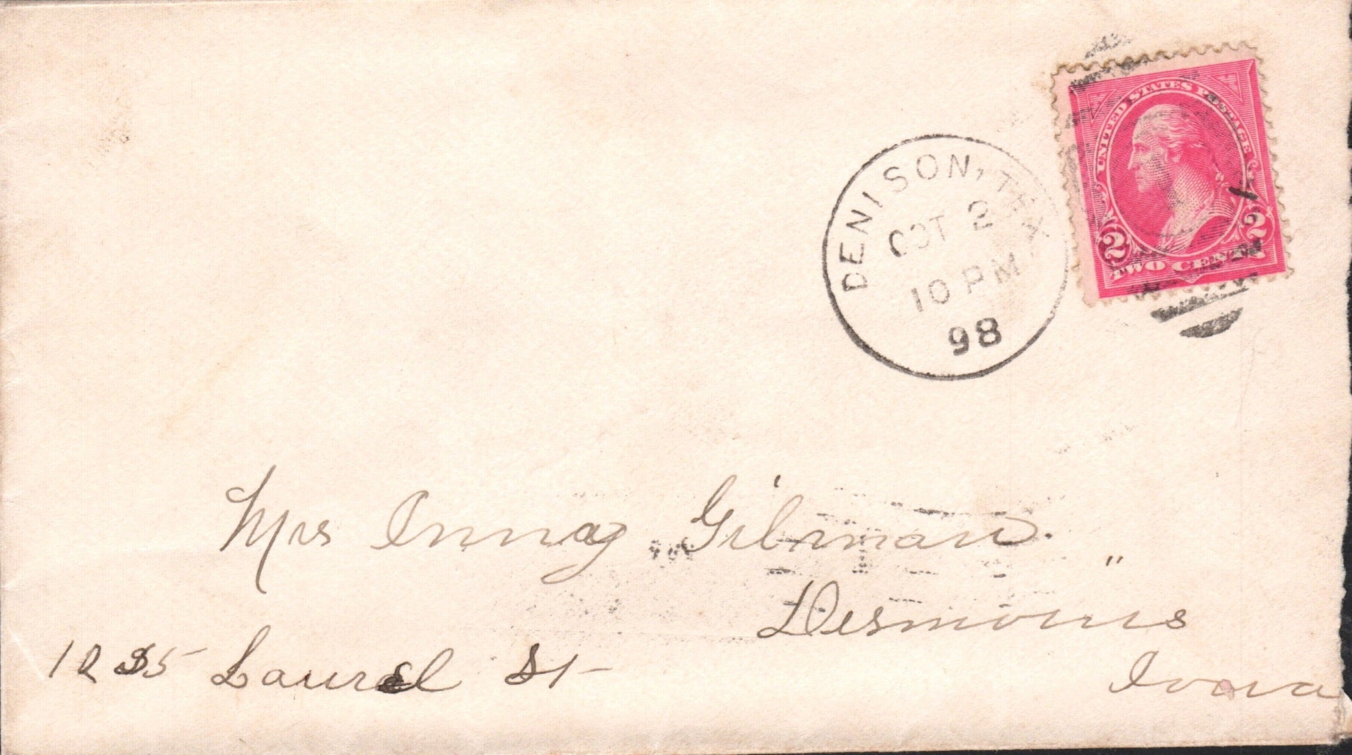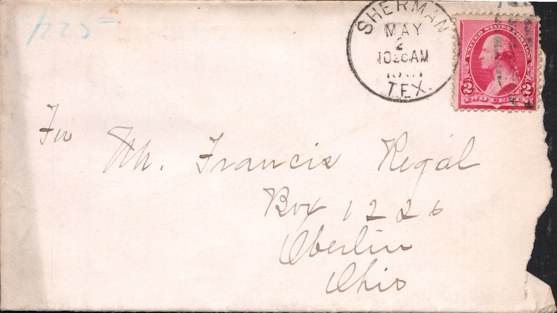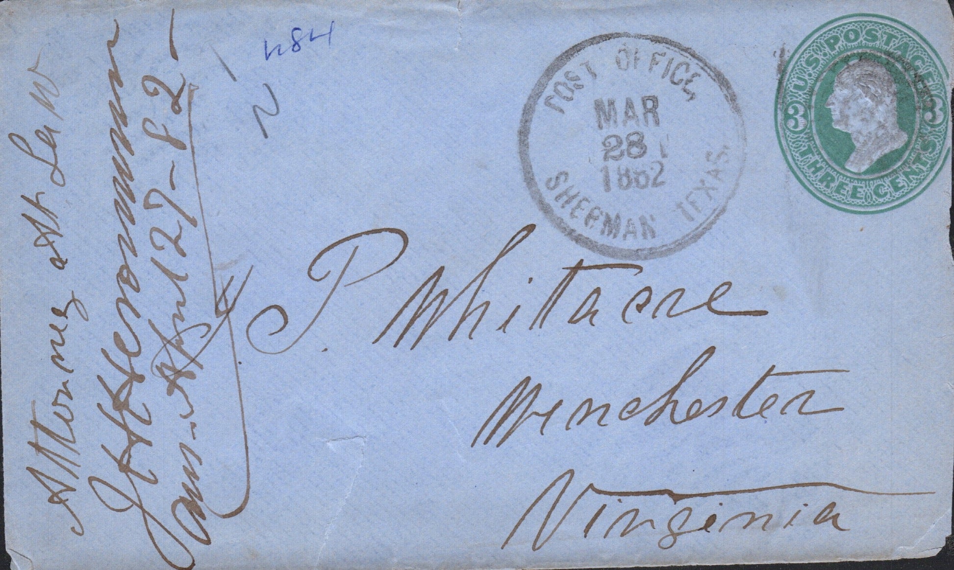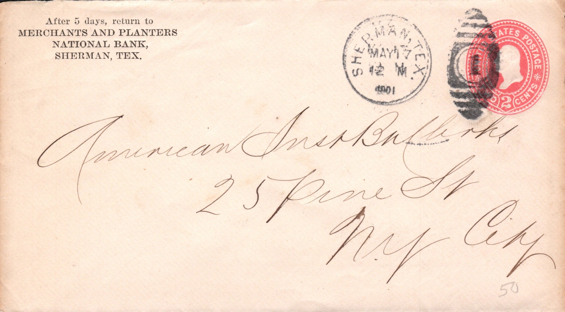 - Sherman 1882 cds “Post Office Sherman Texas” on blue cover; 1890s cds on cover, slightly off top; 1901 duplex on cover, “Merchants and Planters National Bank” corner; 1923 machine cancel on cover, includes original letter