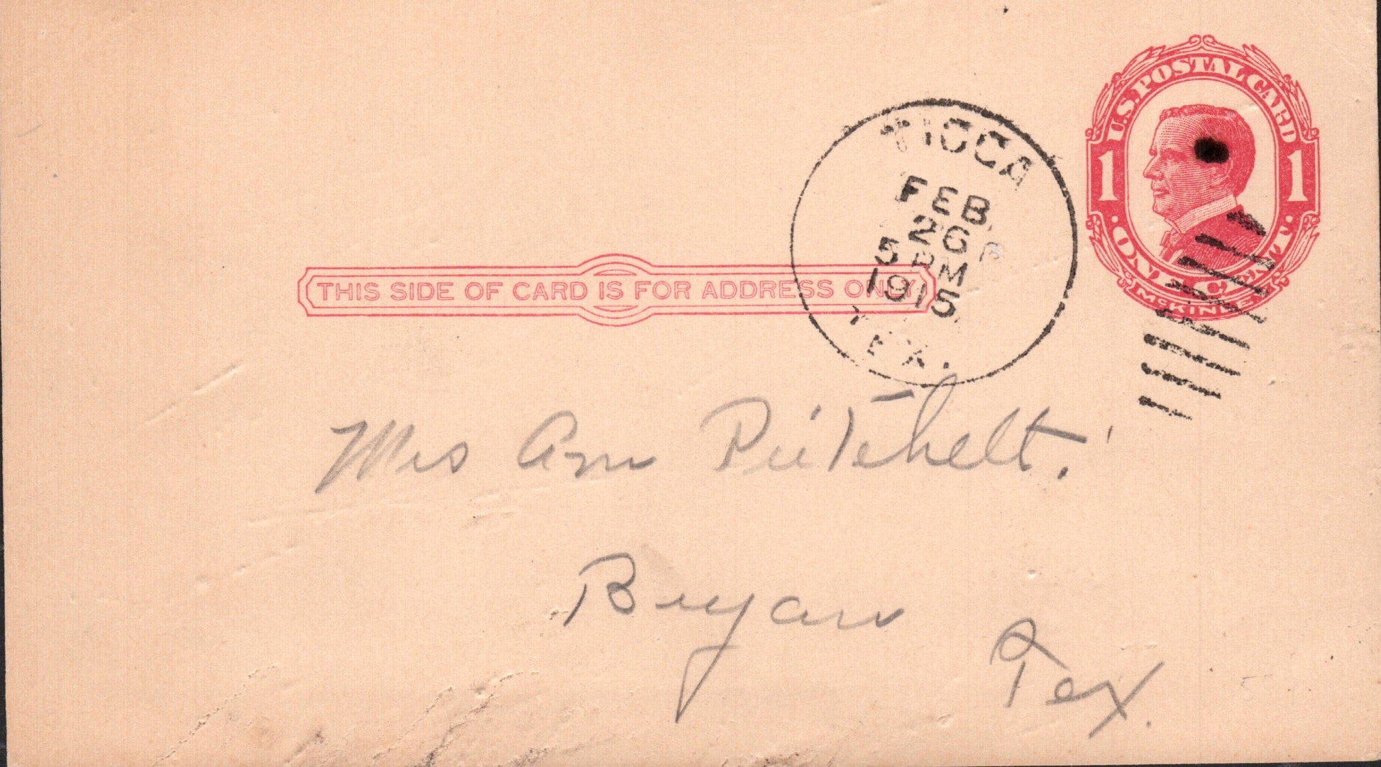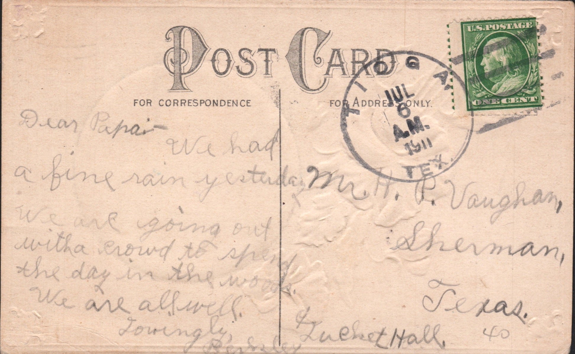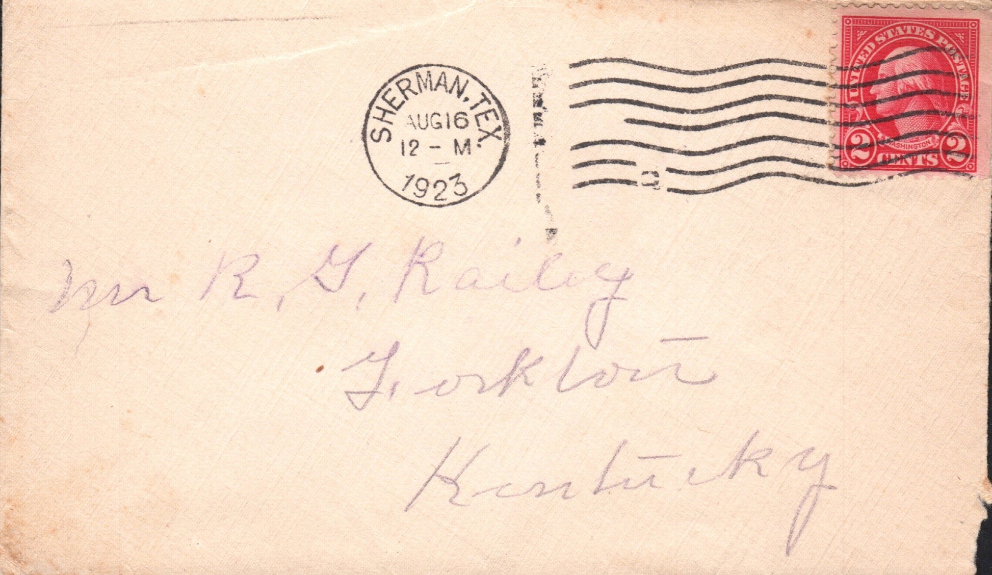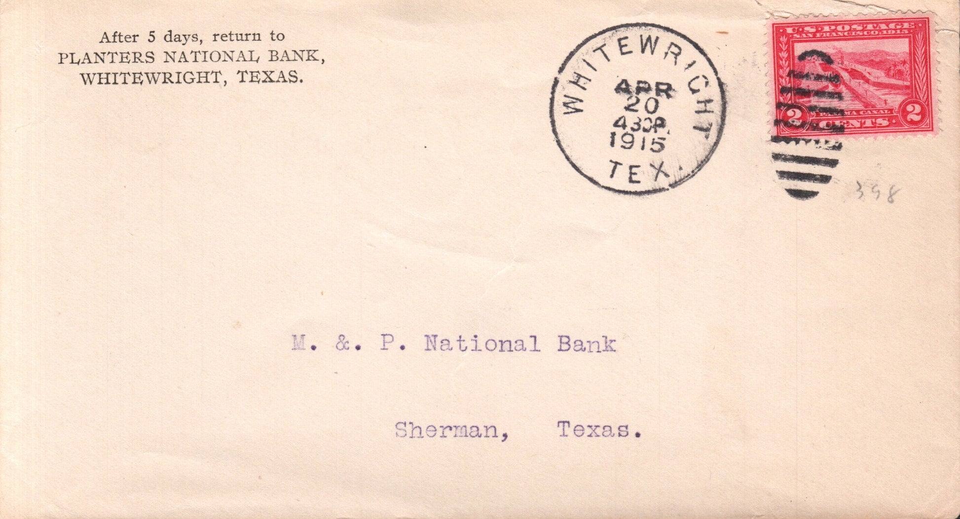 - Whitewright 1905 duplex on cover, “Missouri, Kansas & Texas Railway System” corner, damaged through stamp; 1915 duplex on cover, “Planters National Bank” corner