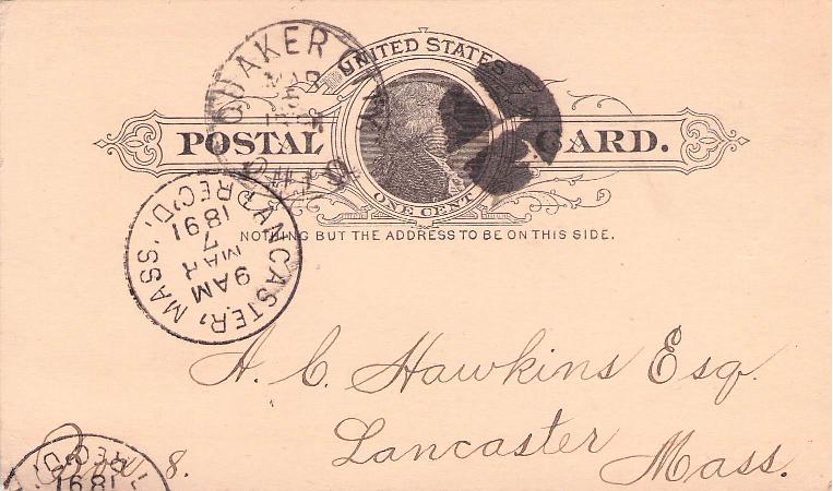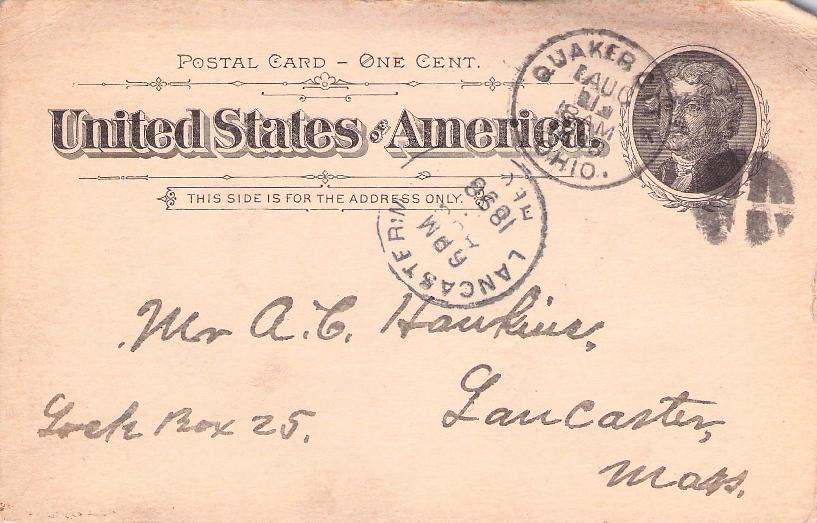 - Quaker City 1891 cds and Lancaster, Mass. Rec’d on Postal card [message requests poultry catalog]; 1898 cds [diff. lettering] and Lancaster, Mass. Rec’d on Postal card from Quaker City Planing Mills requesting poultry catalog; 1907 duplex on cover; 1967 machine cancel on cover, “Southern Ohio Covered Bridge Association” cachet