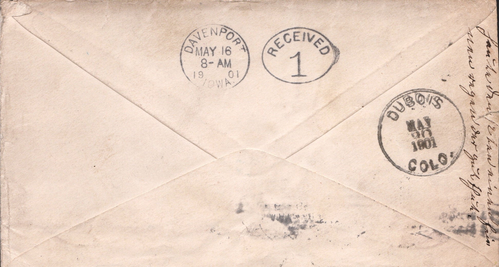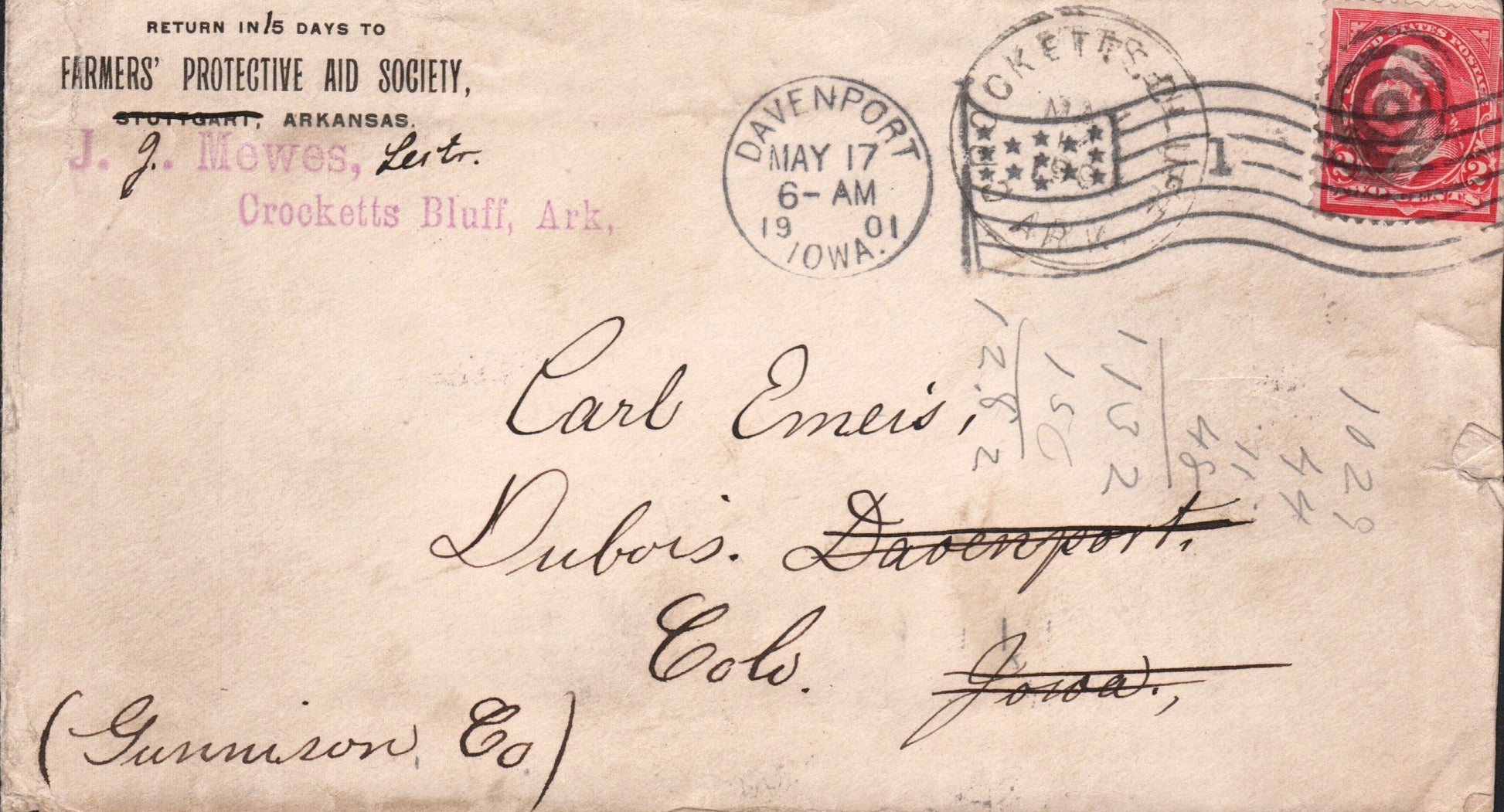 Dubois (1894-1910) 1901 cds as backstamp receiving mark on cover, insurance correspondence originating in Crocketts Bluff, Ark. and sent via Davenport, Iowa