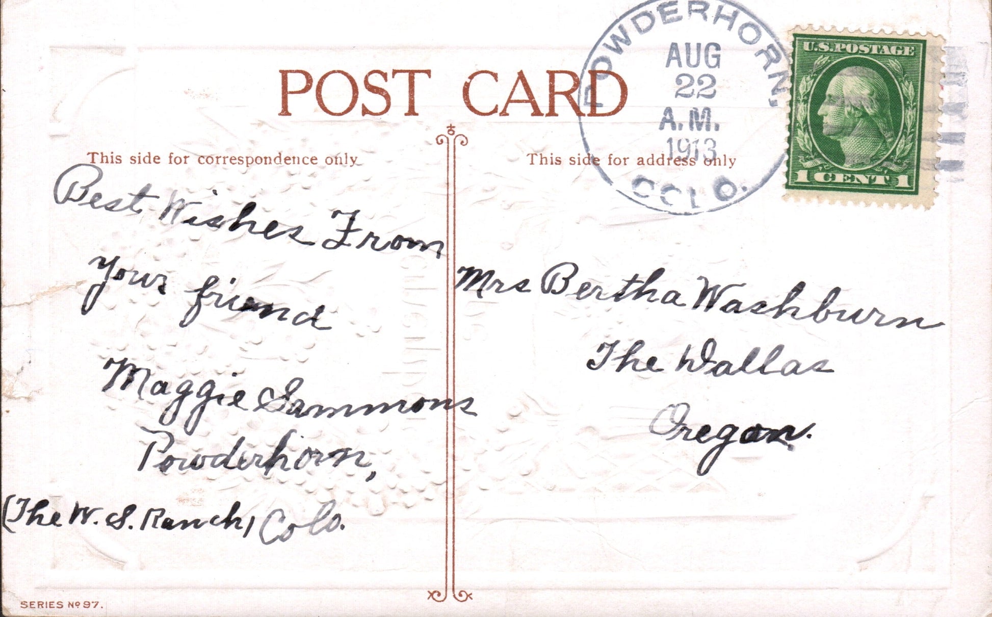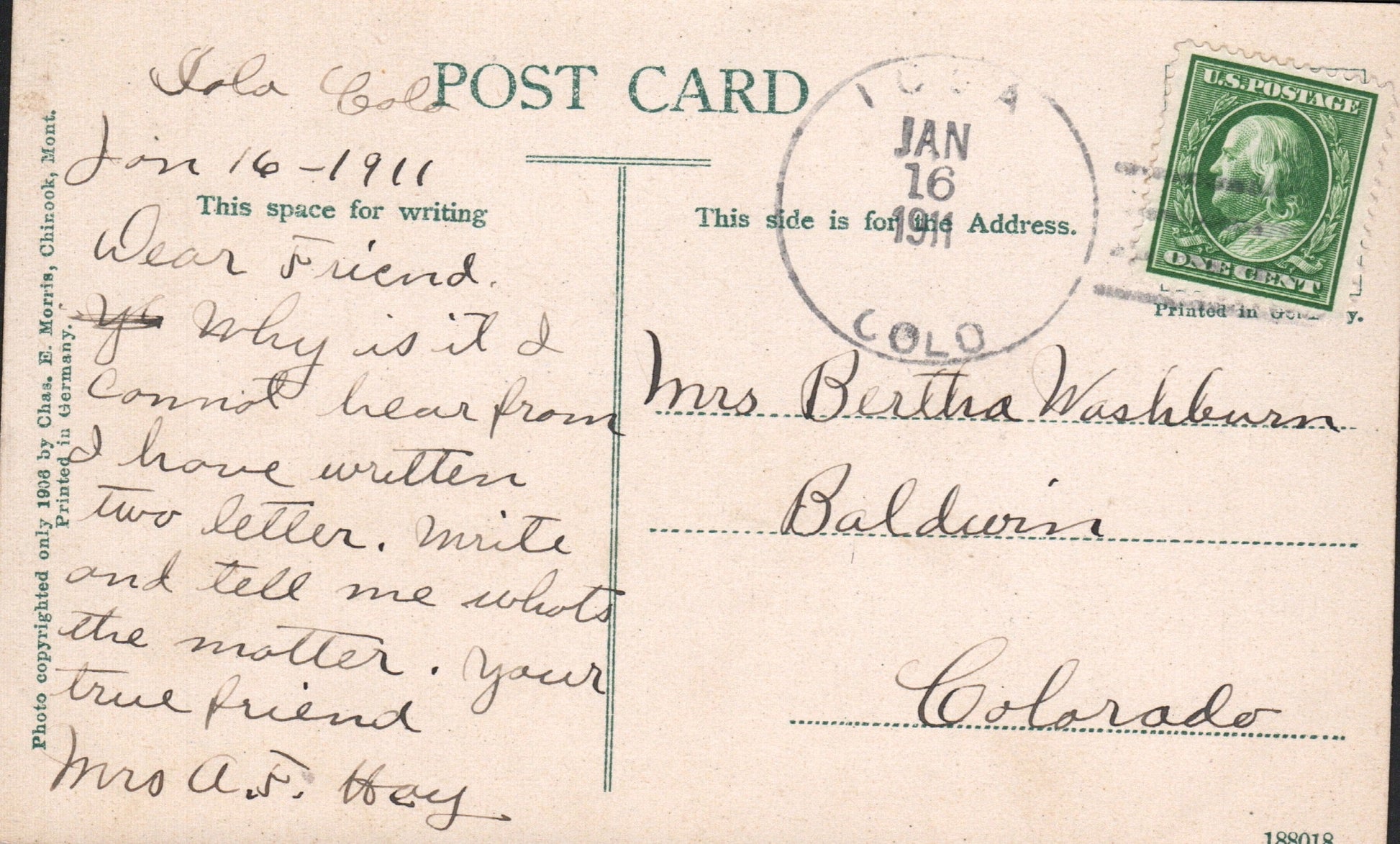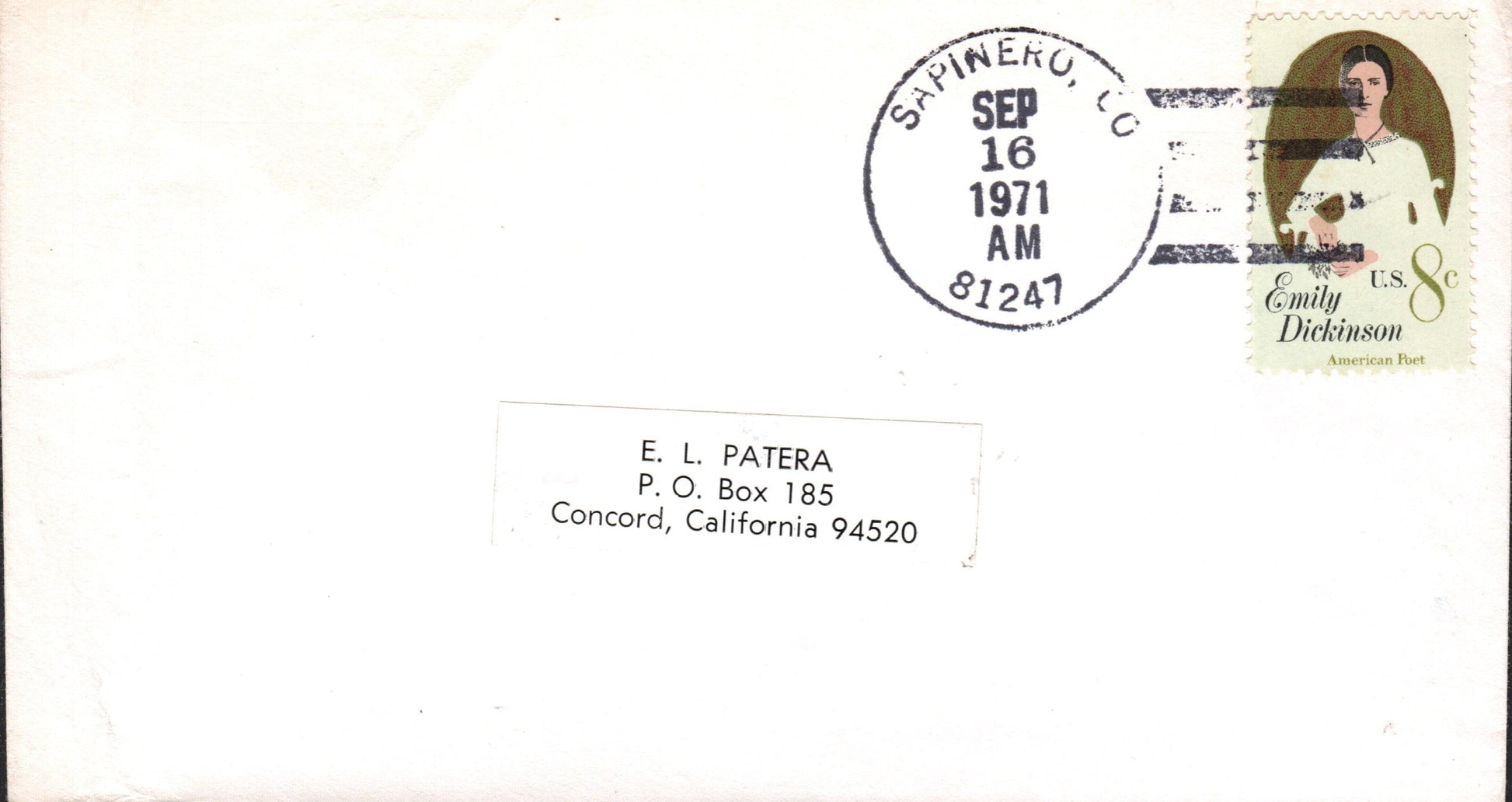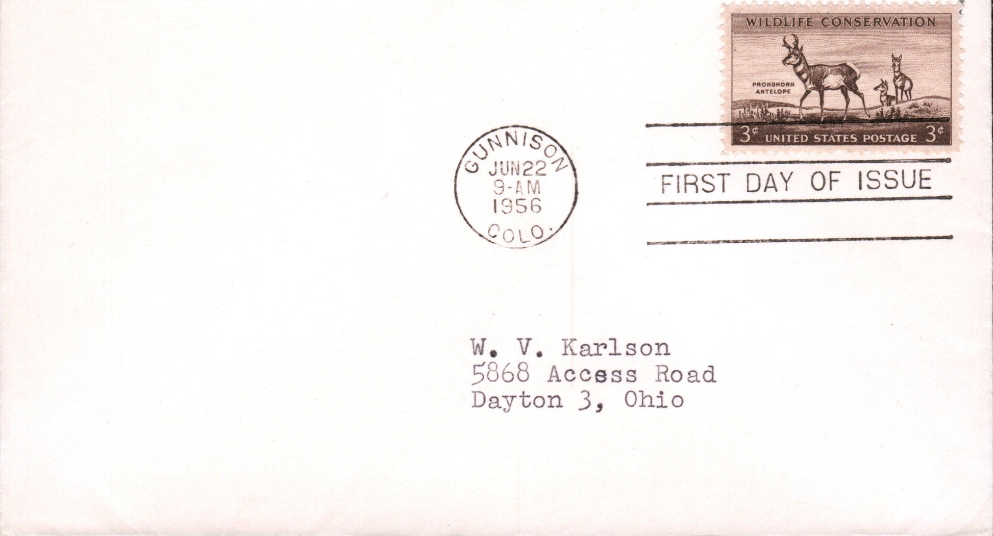 Gunnison 1944 machine cancel on post card (Sanborn #2359); 1956 machine FD cancel of 3¢ Wildlife Conservation stamp; 1976 machine cancel on Centennial cover cacheted with map