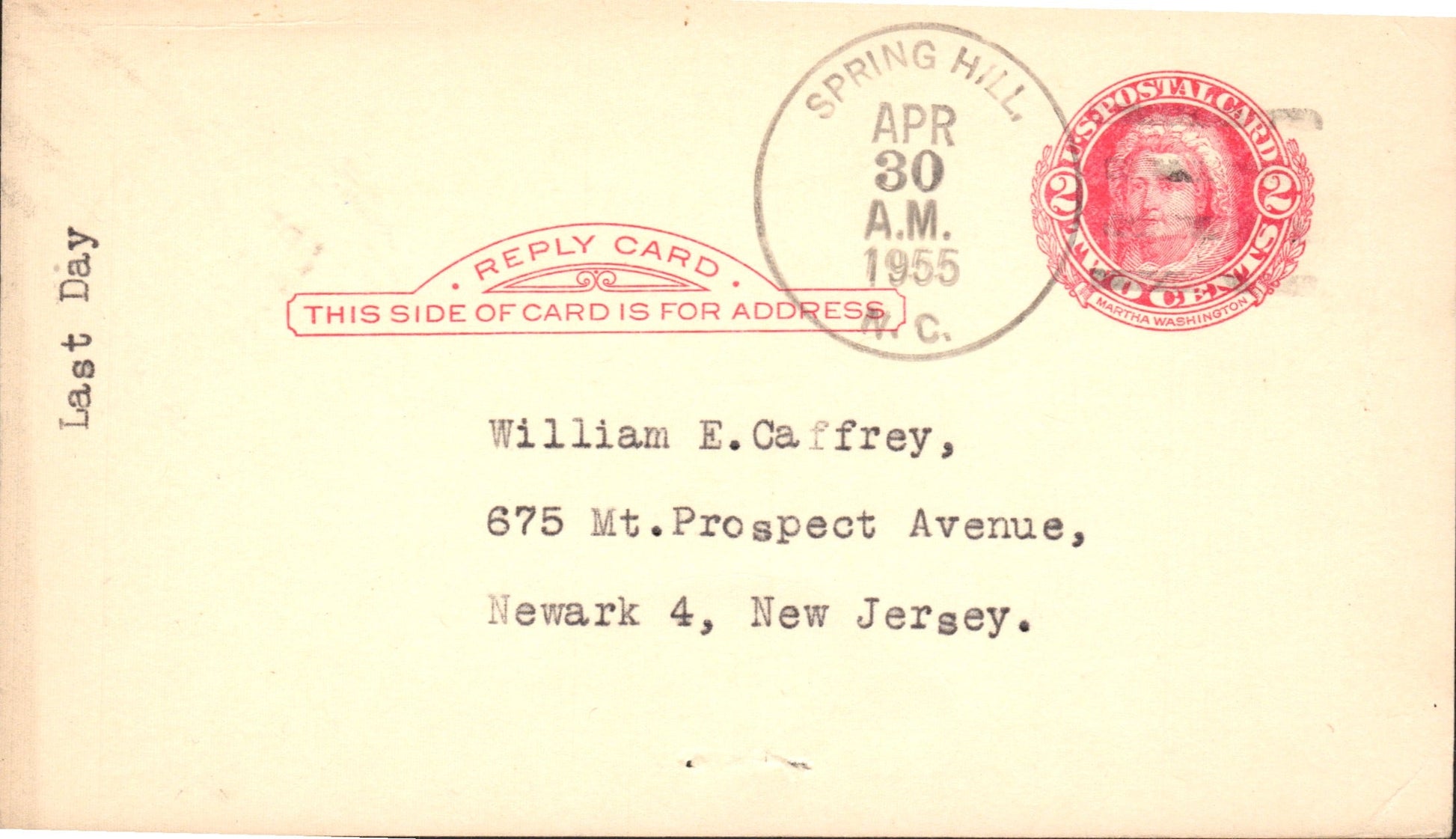 Spring Hill (1853/1955) 1955 4-bar on LD Postal card