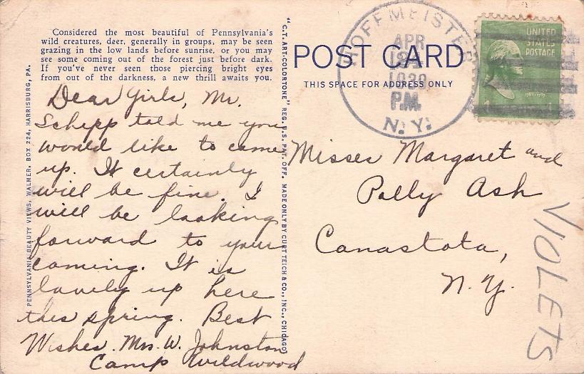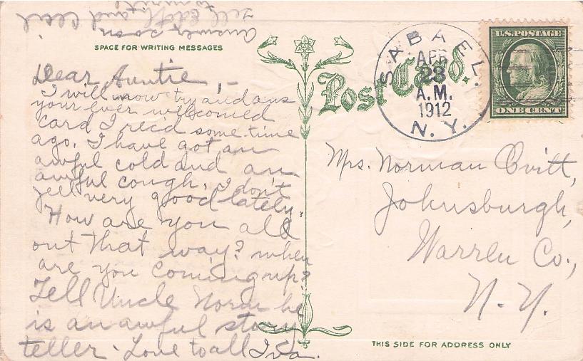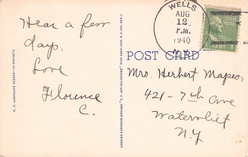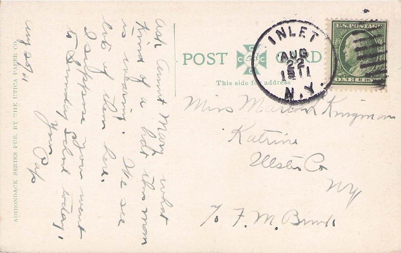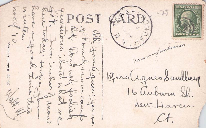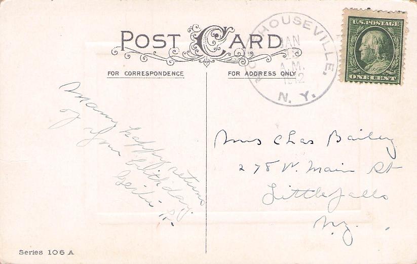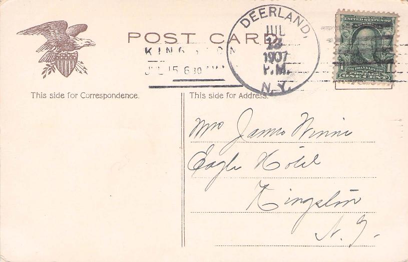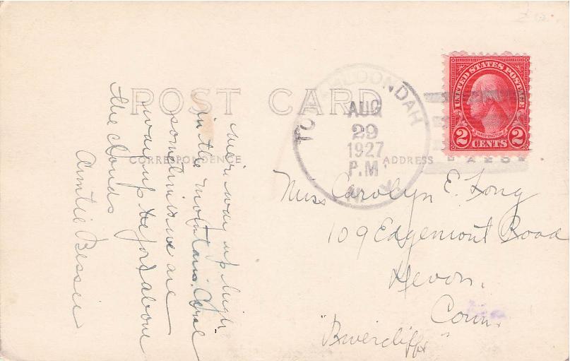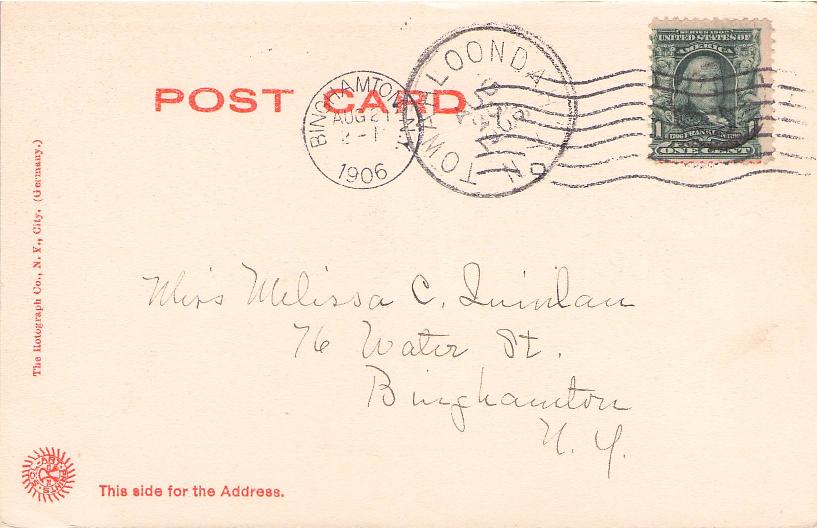 - Towahloondah (1902-1937) 1906 cds on post card; c.1910, cds, target killer on post card with missing lower right corner, overstruck Binghamton; 1927 4-bar on B&W post card