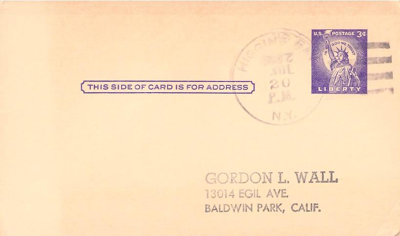 - Nehasane (1893-1954) 1954 4-bar on LD Postal Card