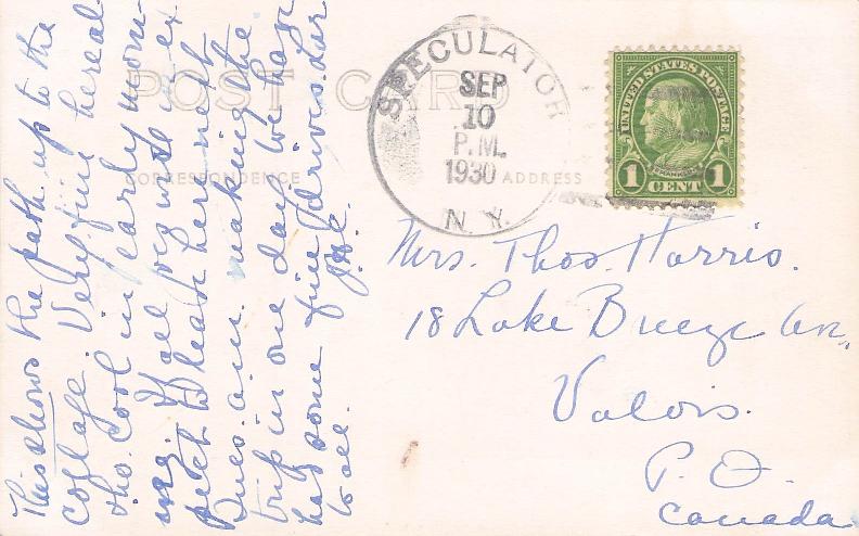 - Speculator 1930 4-bar on post card; 1959 duplex on chrome post card; 1971 machine cancel on cover.