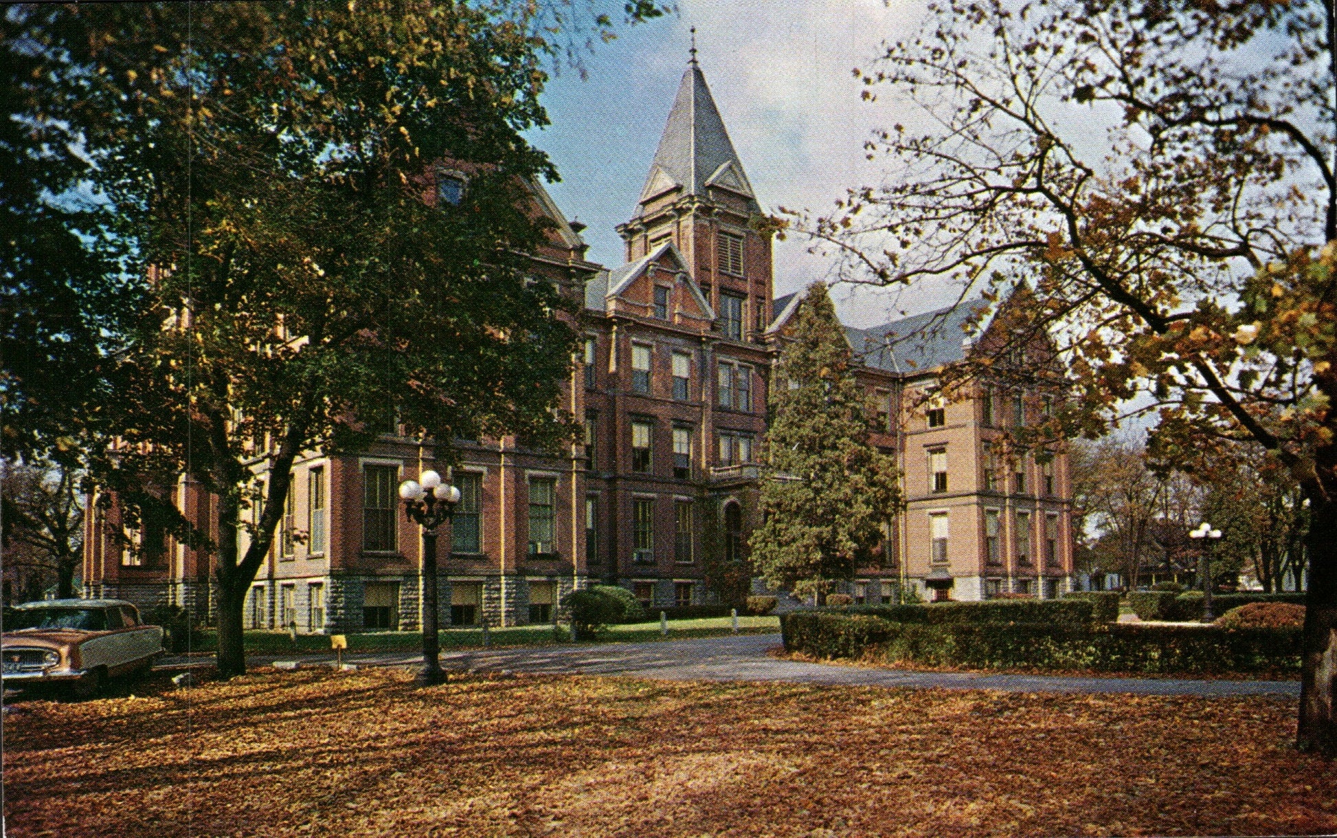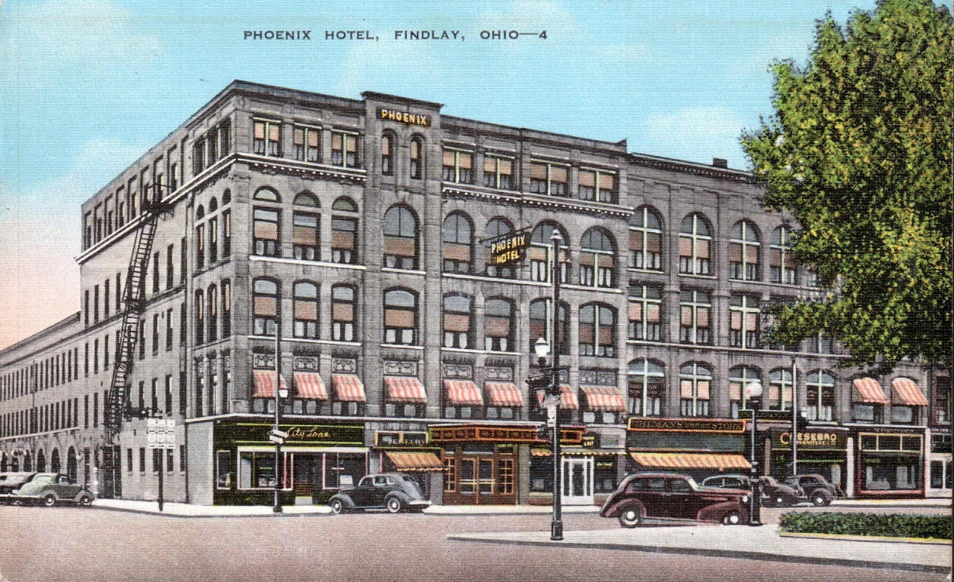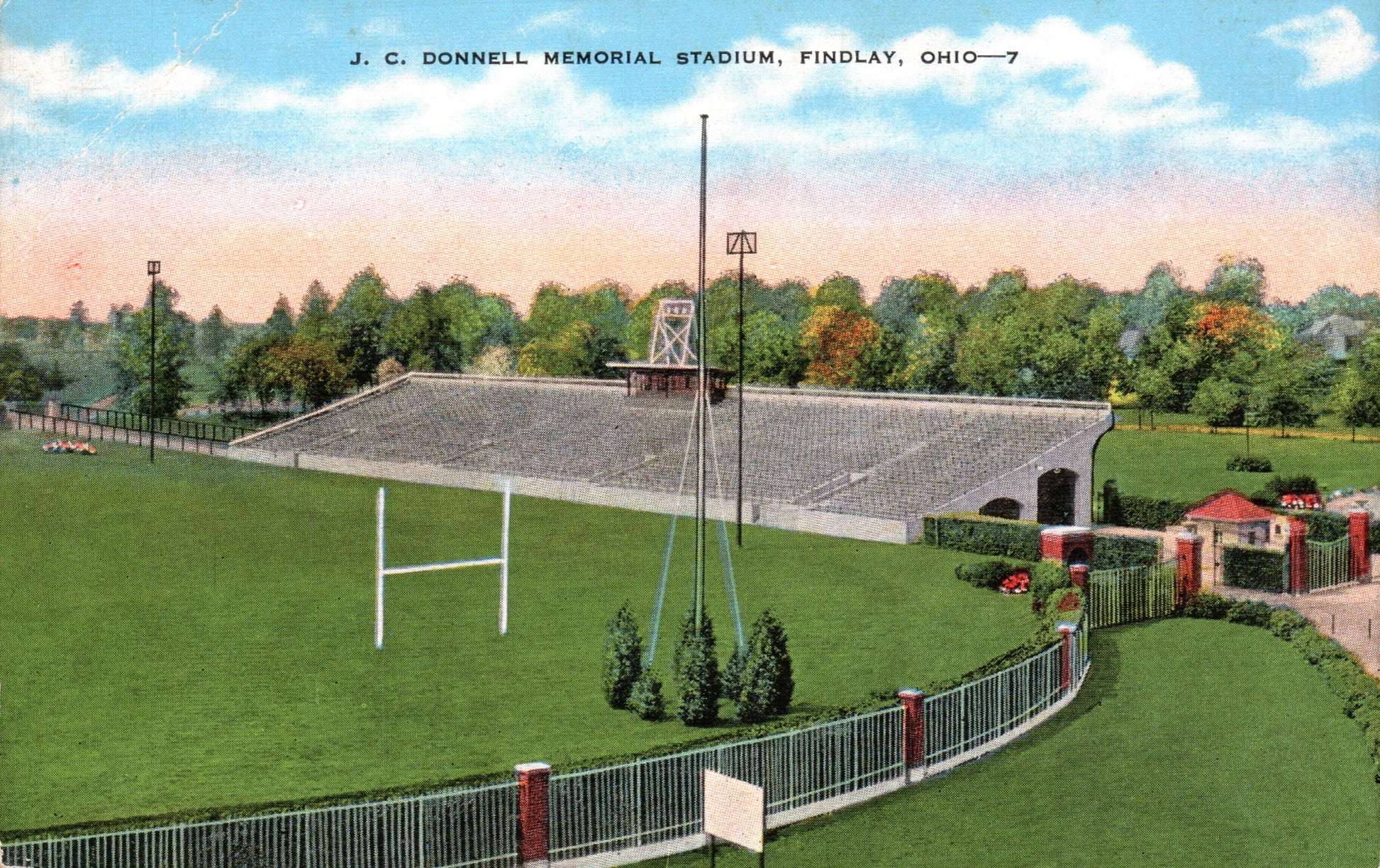Post cards: Phoenix Hotel [linen]; Bel-Aire Motel [B&W]; Donnell Memorial Stadium [linen]; High School [chrome]; Findlay College [chrome]; Tell Taylor Memorial [chrome]