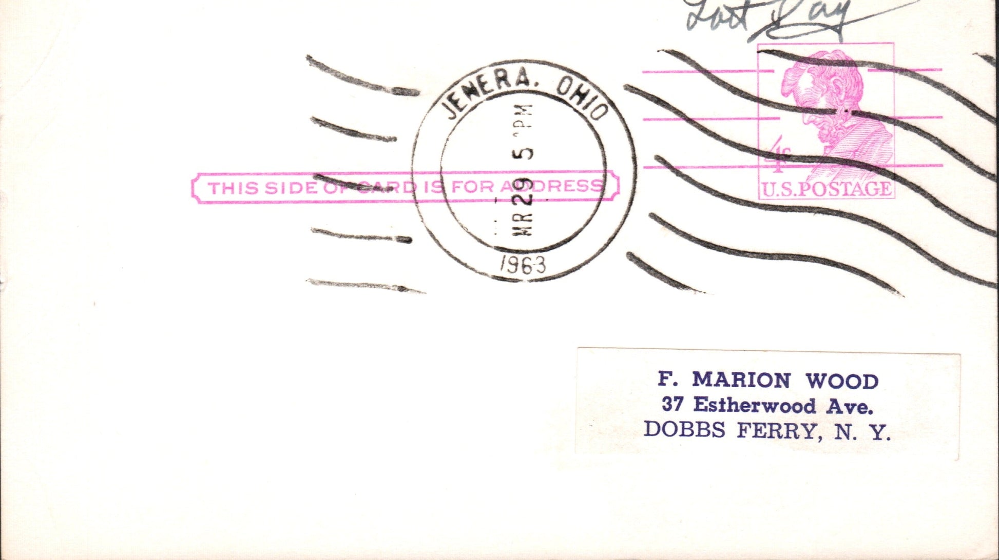 Jenera (1883-1963) 1963 roller on LD Postal Card, Clerk-in-charge autograph on back