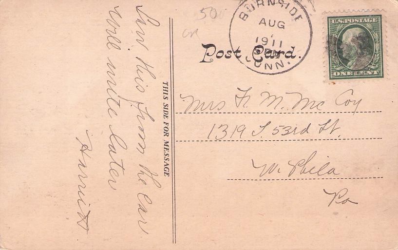 Burnside (1863-1930) 1911 cds on post card view of Harriet Beecher Stow house