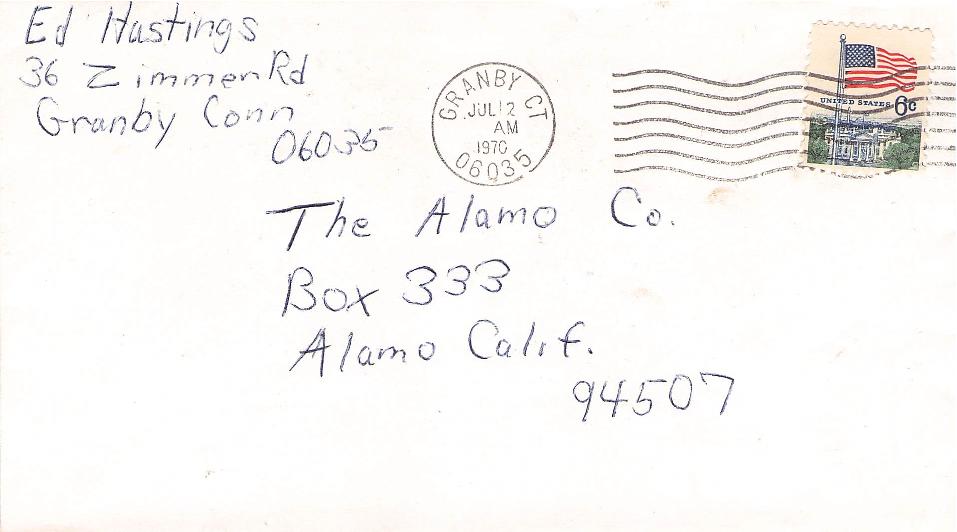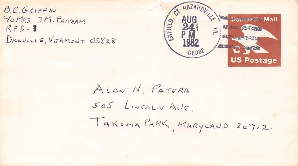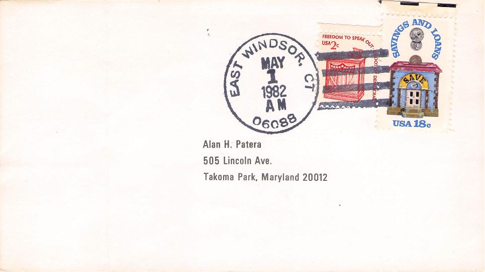 Hazardville Sta. 1982 4 bar on cover, tear through postmark.