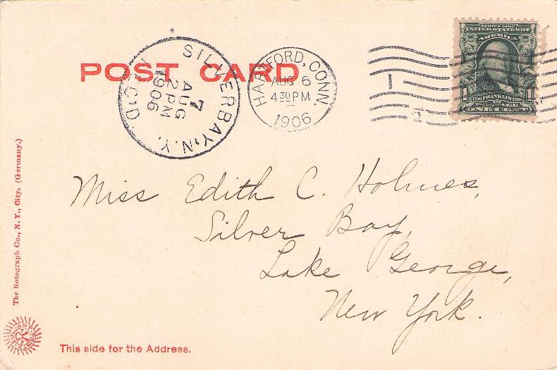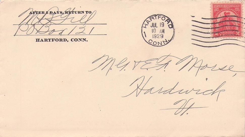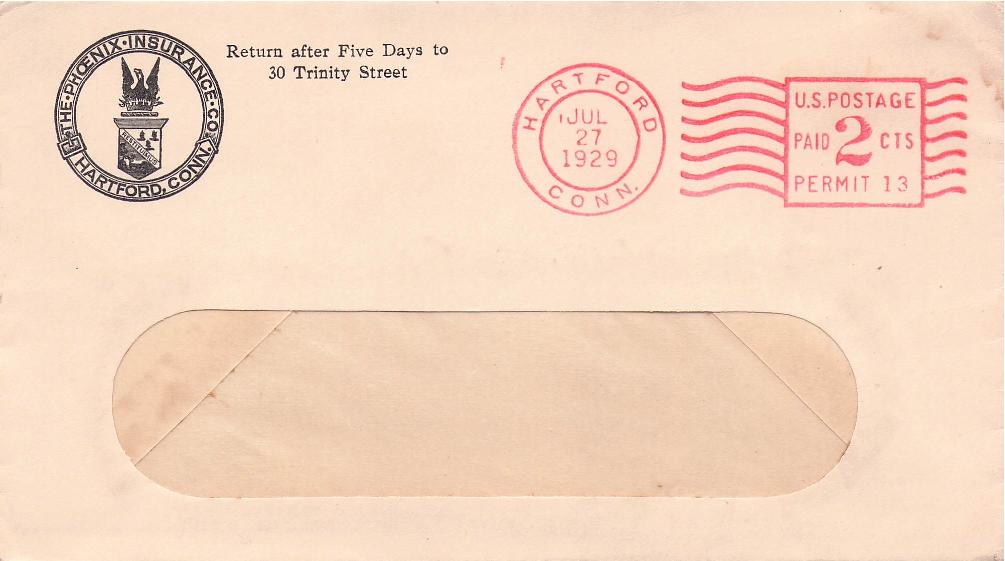 Hartford 1856 cds on cover; c.1880 duplex on cover; 1906 machine cancel on post card, also Silver Bay N.Y. Rec’d; 1929 machine cancel on cover; 1929 double circle Postage Permit on cover, “Phoenix Insurance C.” corner; 1972 machine cancel on cover