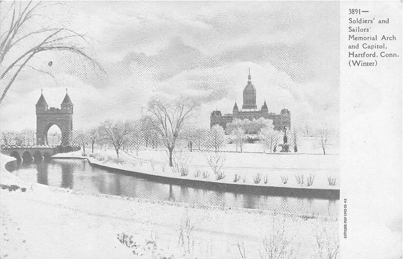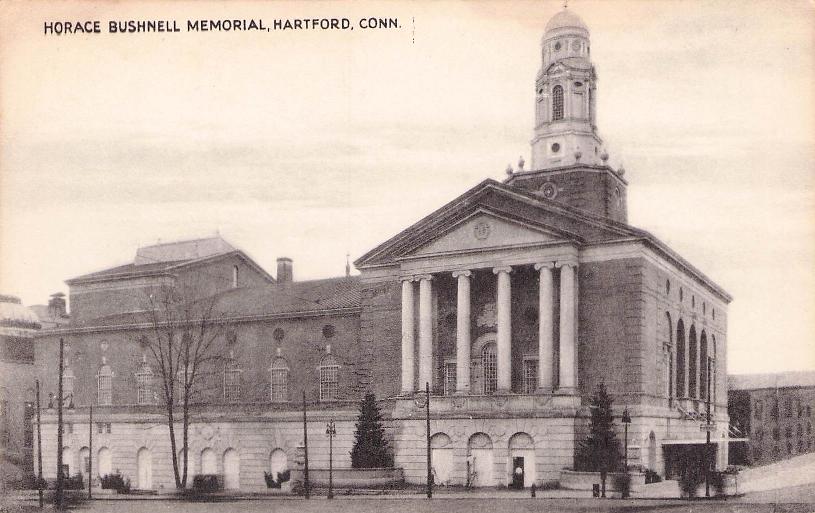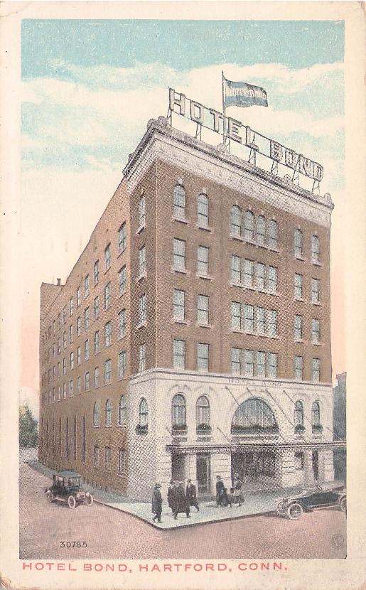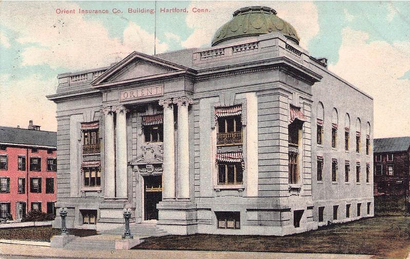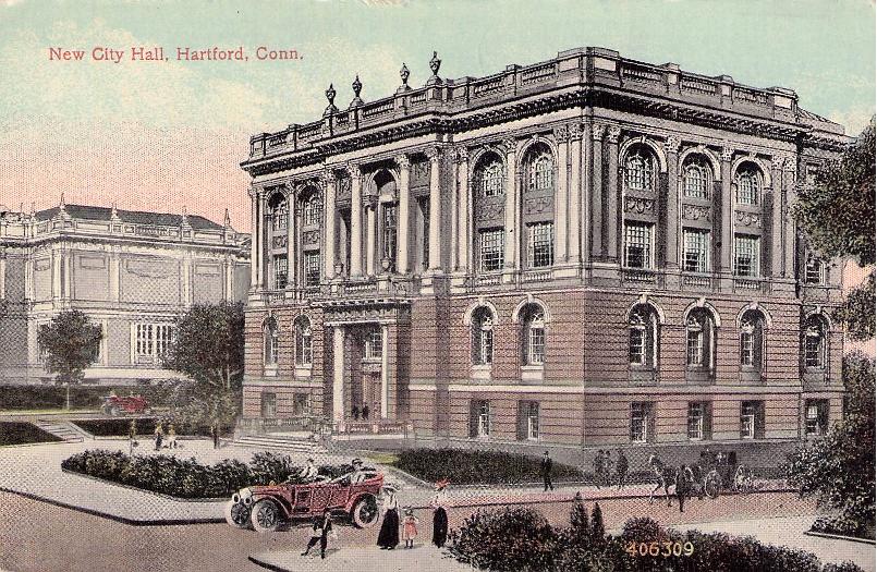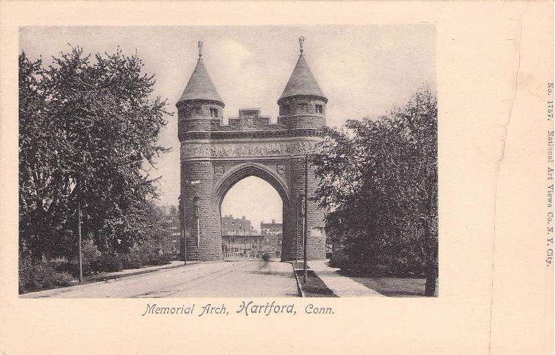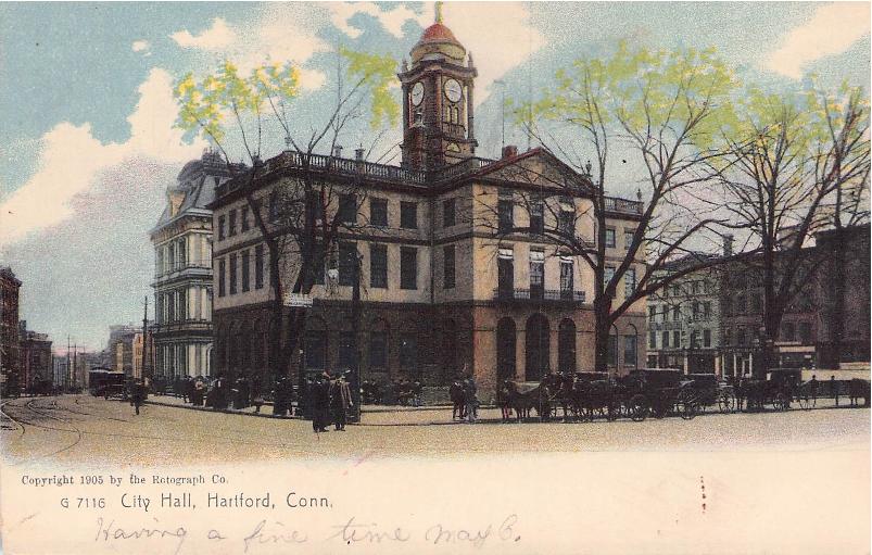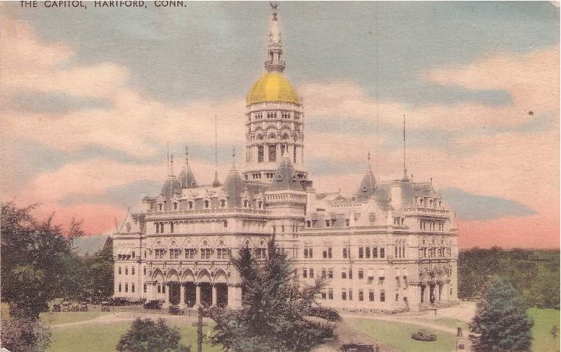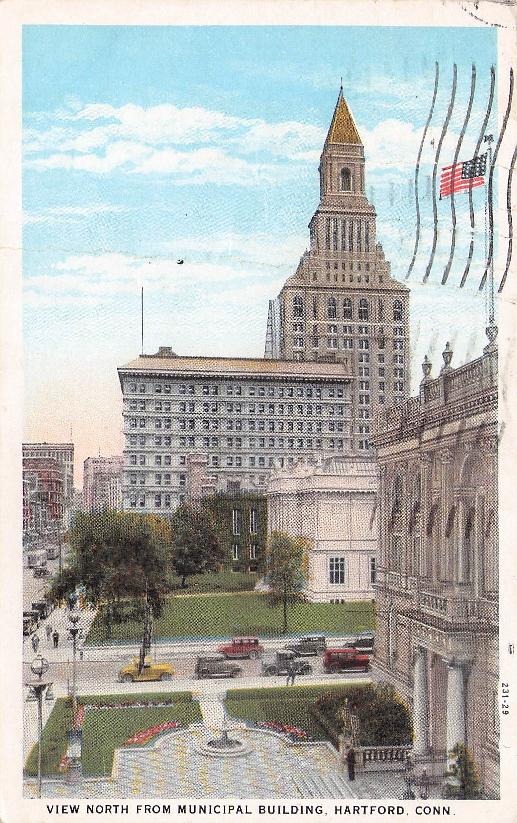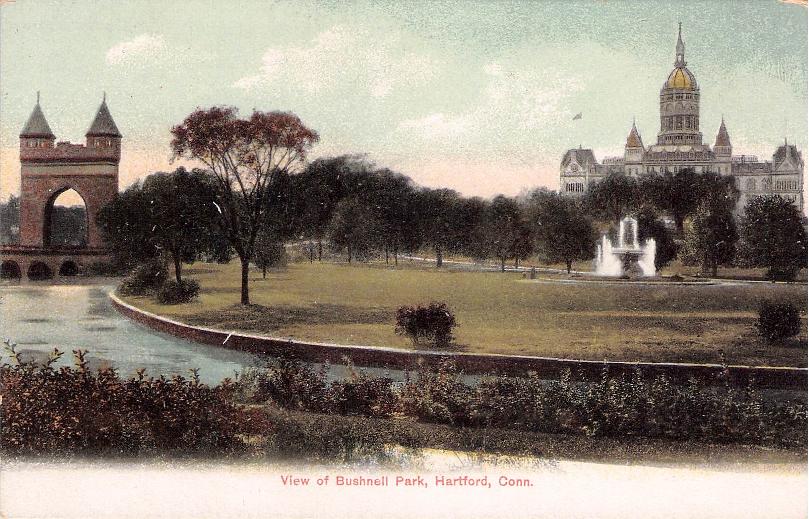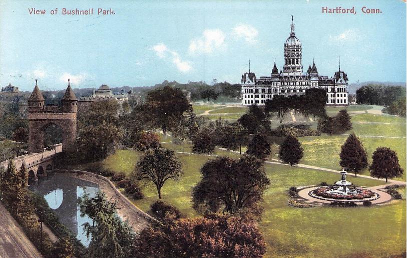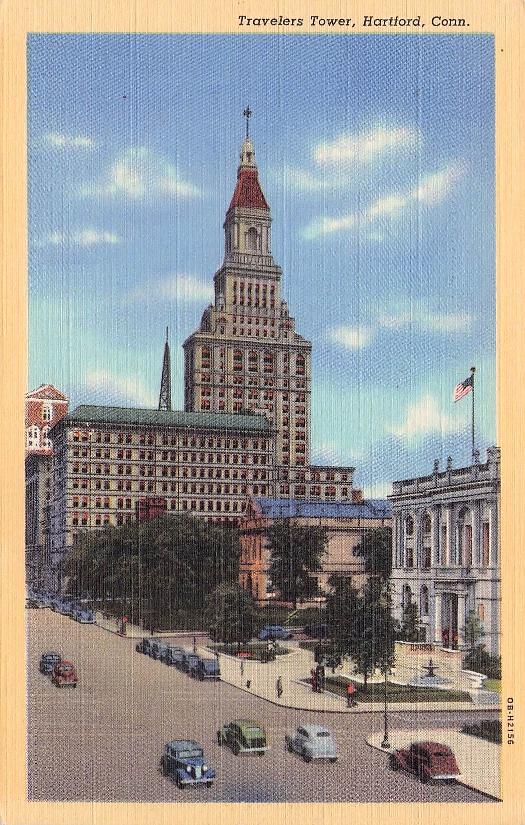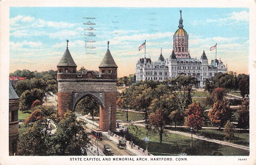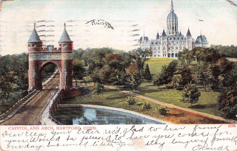 Post cards: Traveler’s Tower [linen]; “View North from Municipal Building” [linen, postal markings on front]; “Orient Insurance Co. Building” [1908]; Hotel America [chrome]; Hotel Bond [1919]; City Hall [1906]; “New City Hall” [c.1915]; Trinity College [linen]; Mark Twain Memorial [3 views, one linen, two chrome]; Aetna Insurance Co. Building [hand colored]; “Horace Bushnell Memorial” [B&W]; St. Joseph Cathedral [chrome]; Harriet Beecher Stowe house [2 views, one linen, one chrome]; ”View of Bushnell Park” with Memorial Arch [7 similar but different views, c.1910]; Colt Memorial [c.1910]; Elizabeth Park [2 linen views]; State Capitol [hand colored]