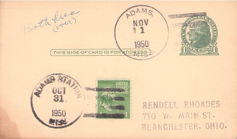 - Adams Station (1886-1950) and Adams (1950-1953), each a 4-bar on Postal Card on the occasion of the name change