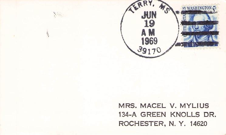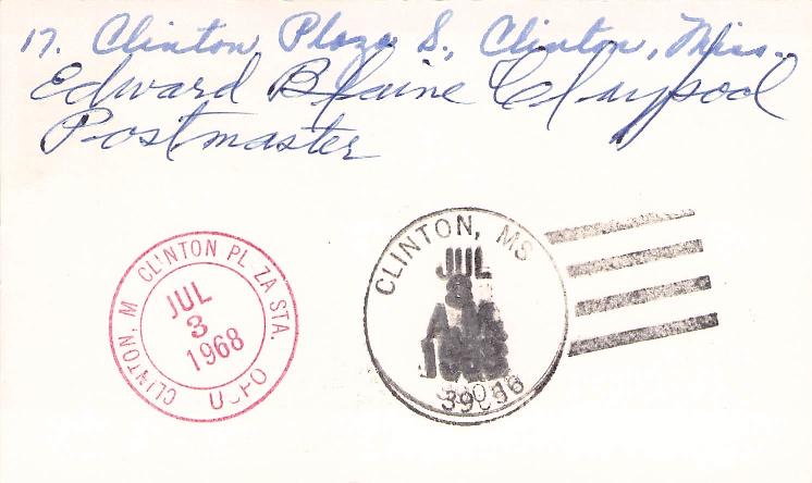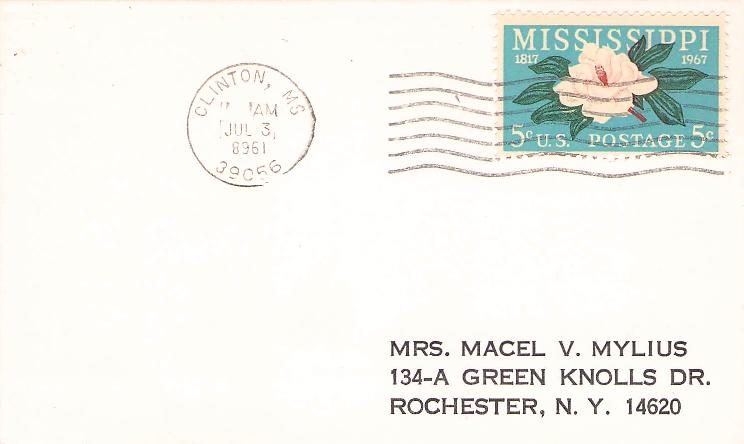 - Clinton 1961 machine cancel on 3x5 card, 5¢ Mississippi stamp