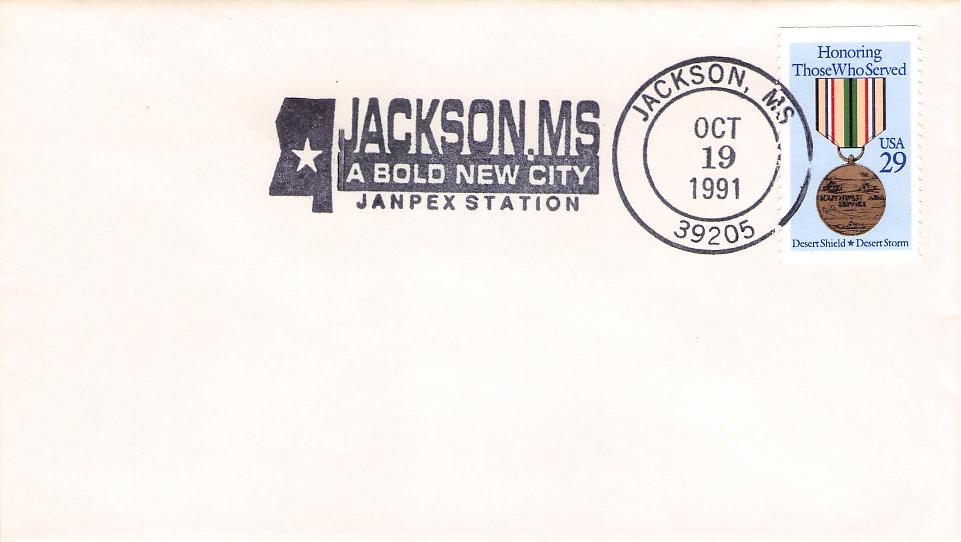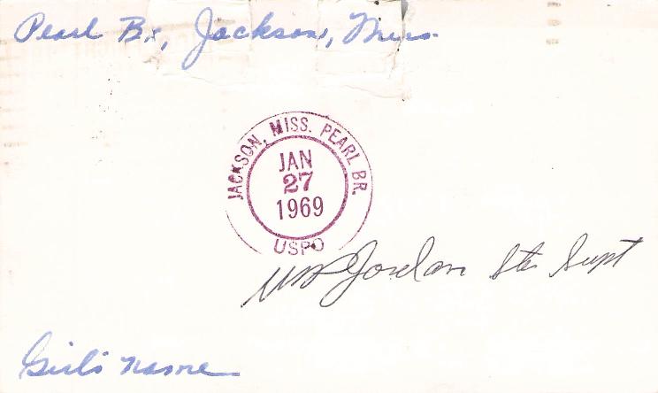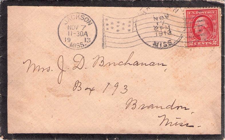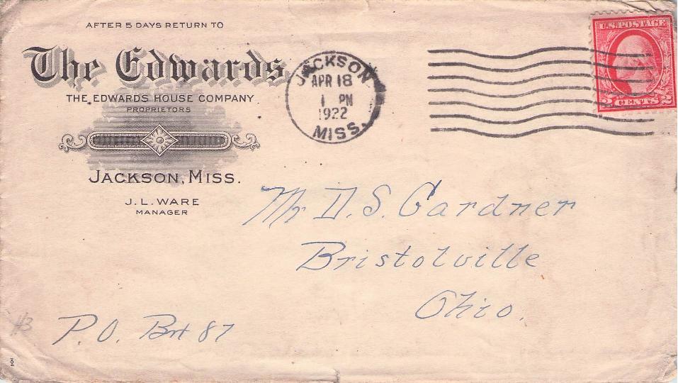 - Jackson 1913 Flag cancel on mourning cover; 1922 machine cancel on cover, “The Edwards” Hotel corner; 1956 machine Red Cross slogan on post card; 1978 machine cancel on cover; 1994 Janpex S double circle & slogan; 1998 machine cancel on cover