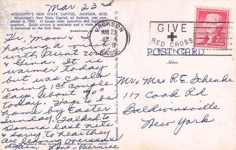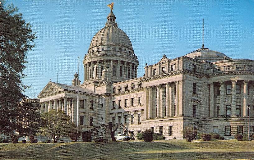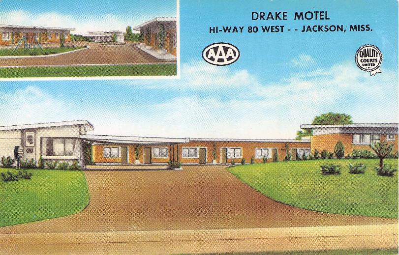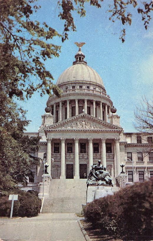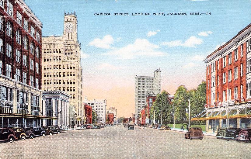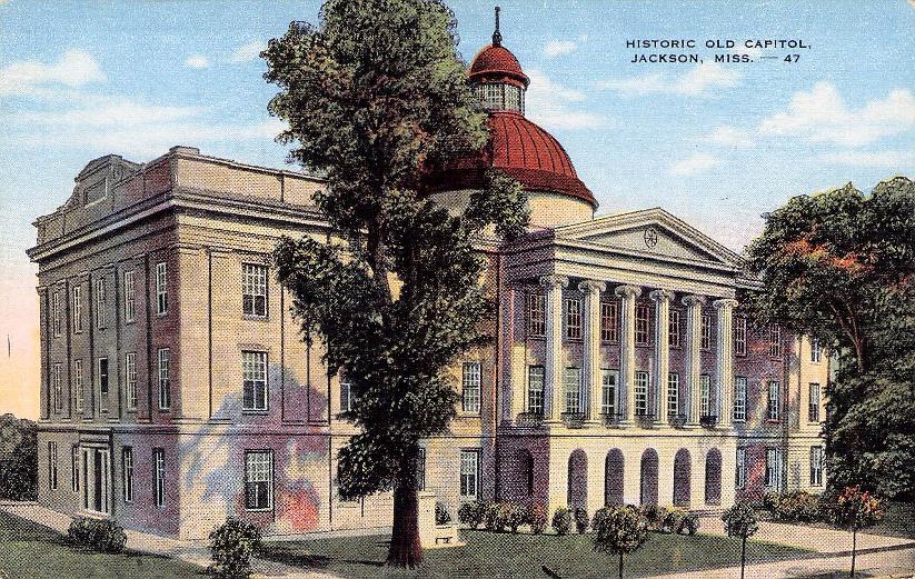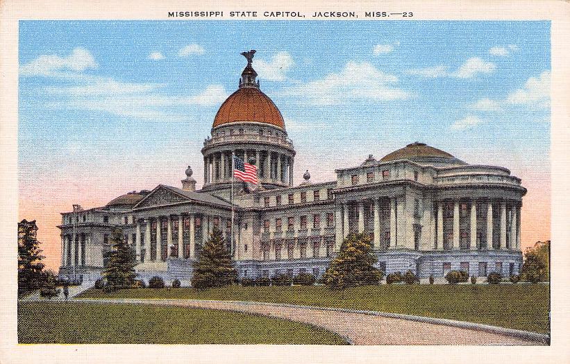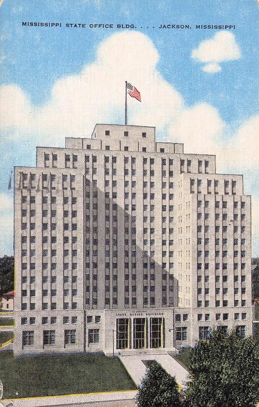 - Post cards: Capitol Street [linen]; Standard Life Insurance Co. Building [linen]; Robert E. Lee Hotel [linen]; Drake Motel [chrome, 1950s]; The Little Theatre [chrome]; University Medical Center aerial view [chrome]; Hinds Junior College [chrome]; Belhaven College [chrome]; The Oaks [“Oldest House in Jackson,” Continental]; Old State Capitol [linen, 1940)] State Capitol, 3 views [1 linen, 1 chrome, 1 Continental]; State Office Building [linen, 1952]