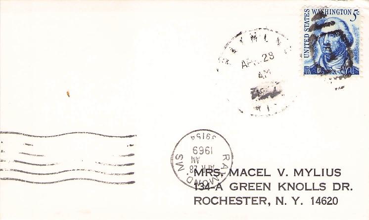 - Pearl Br. 1969 round dater as sample on back of 3x5 card, also PM autograph, card has tears