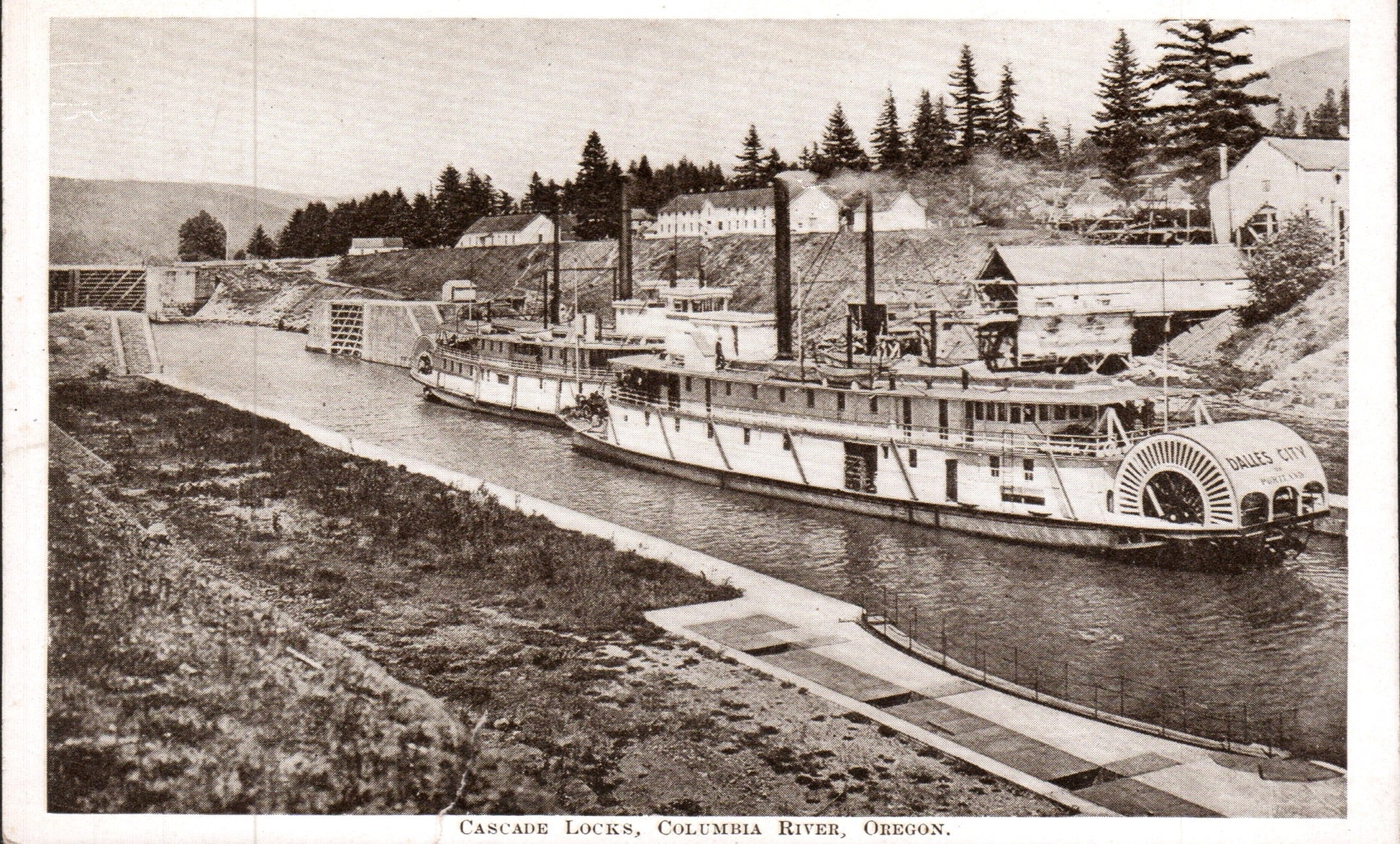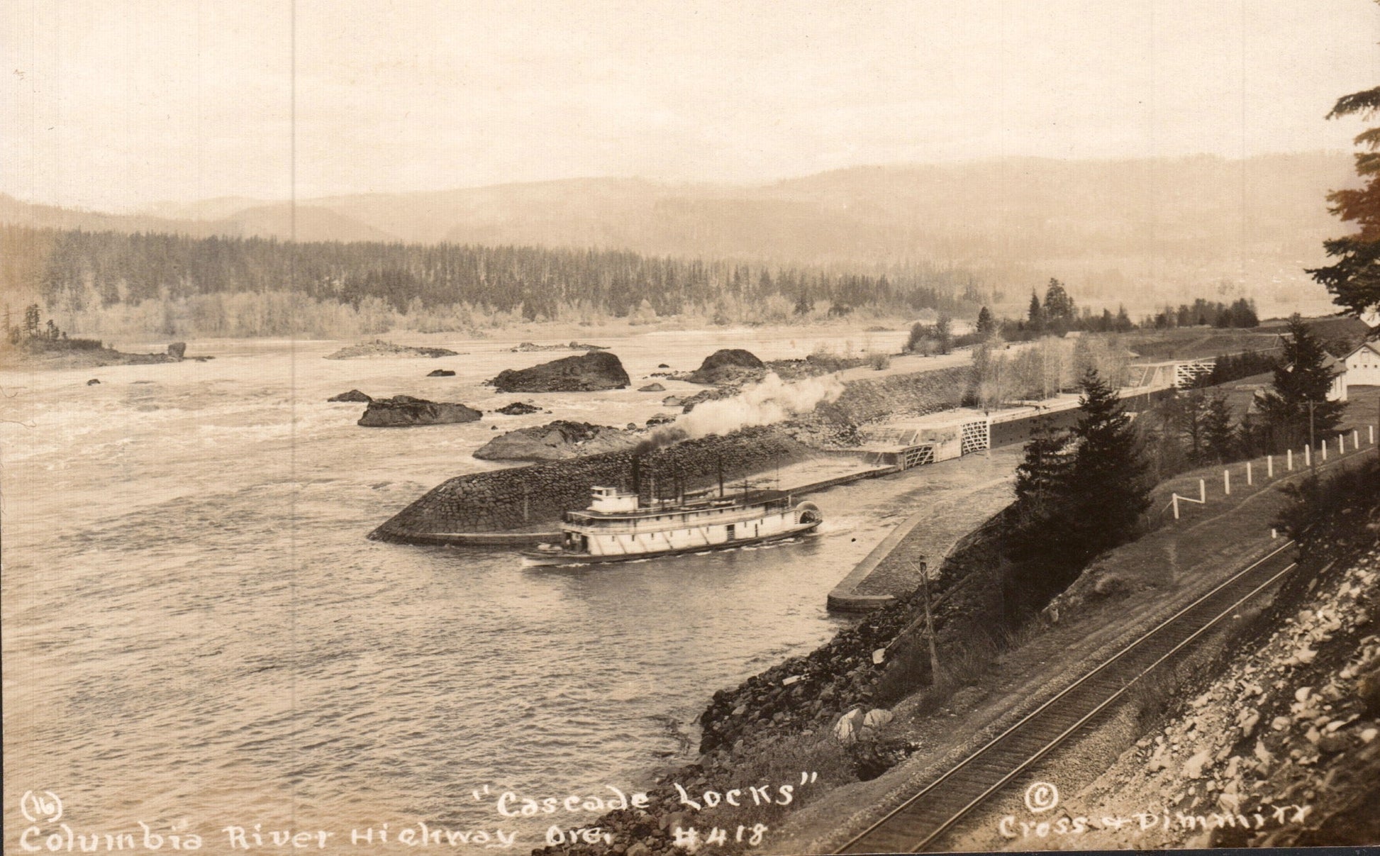 Post cards: Aerial view [linen]; Boat entering locks [real photo], Cross & Dimmitt; Sternwheeler in locks; B&W; Bridge of the Gods before highway bridge [linen]