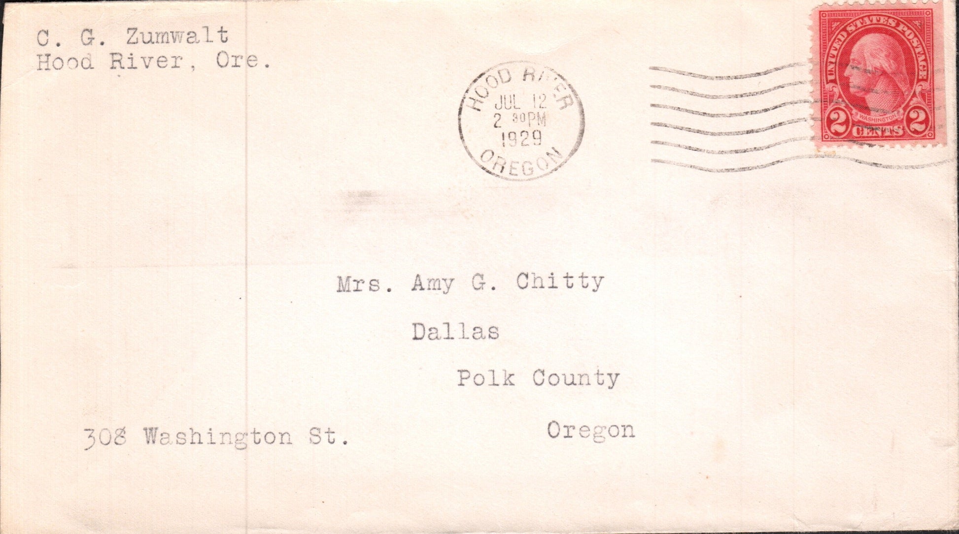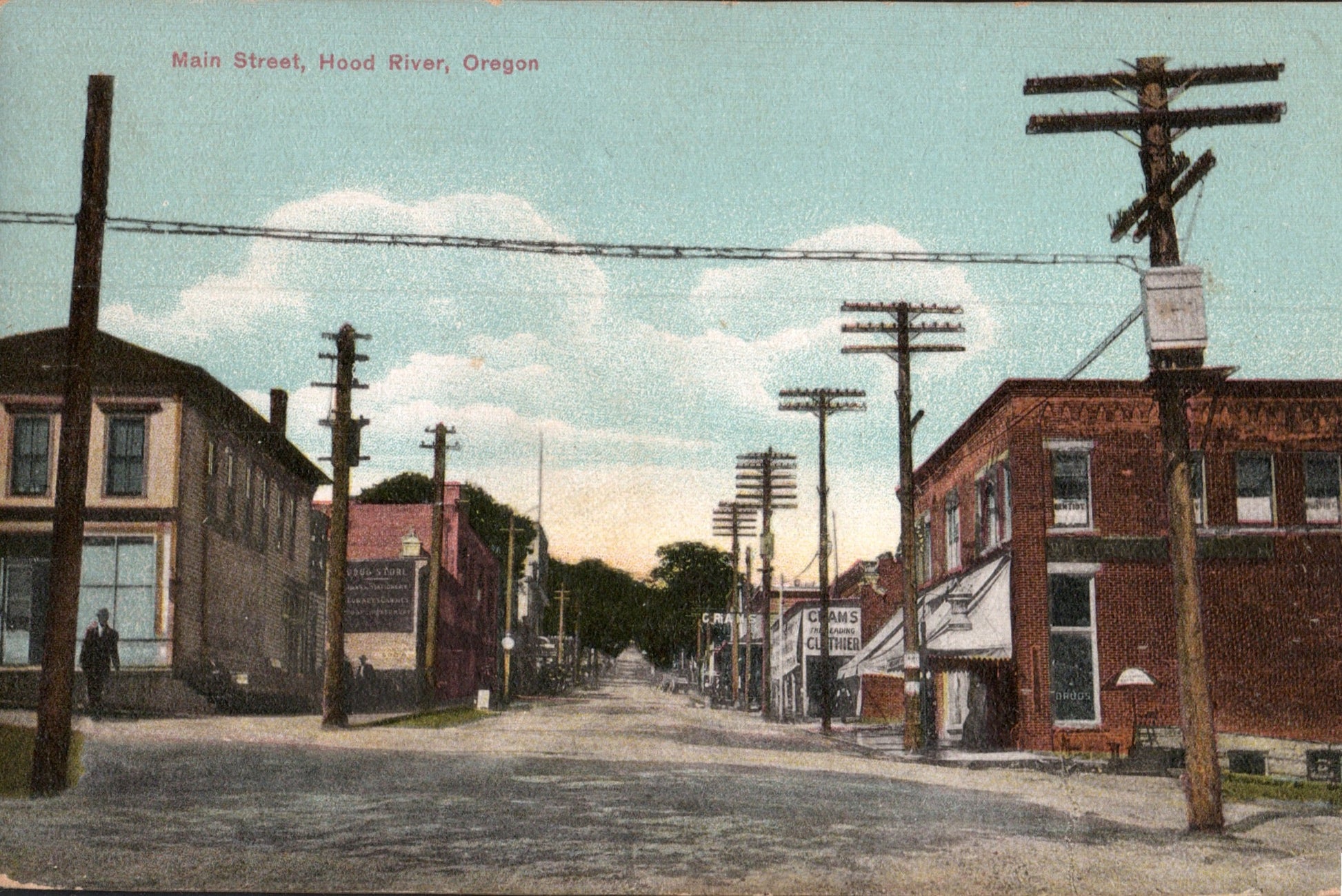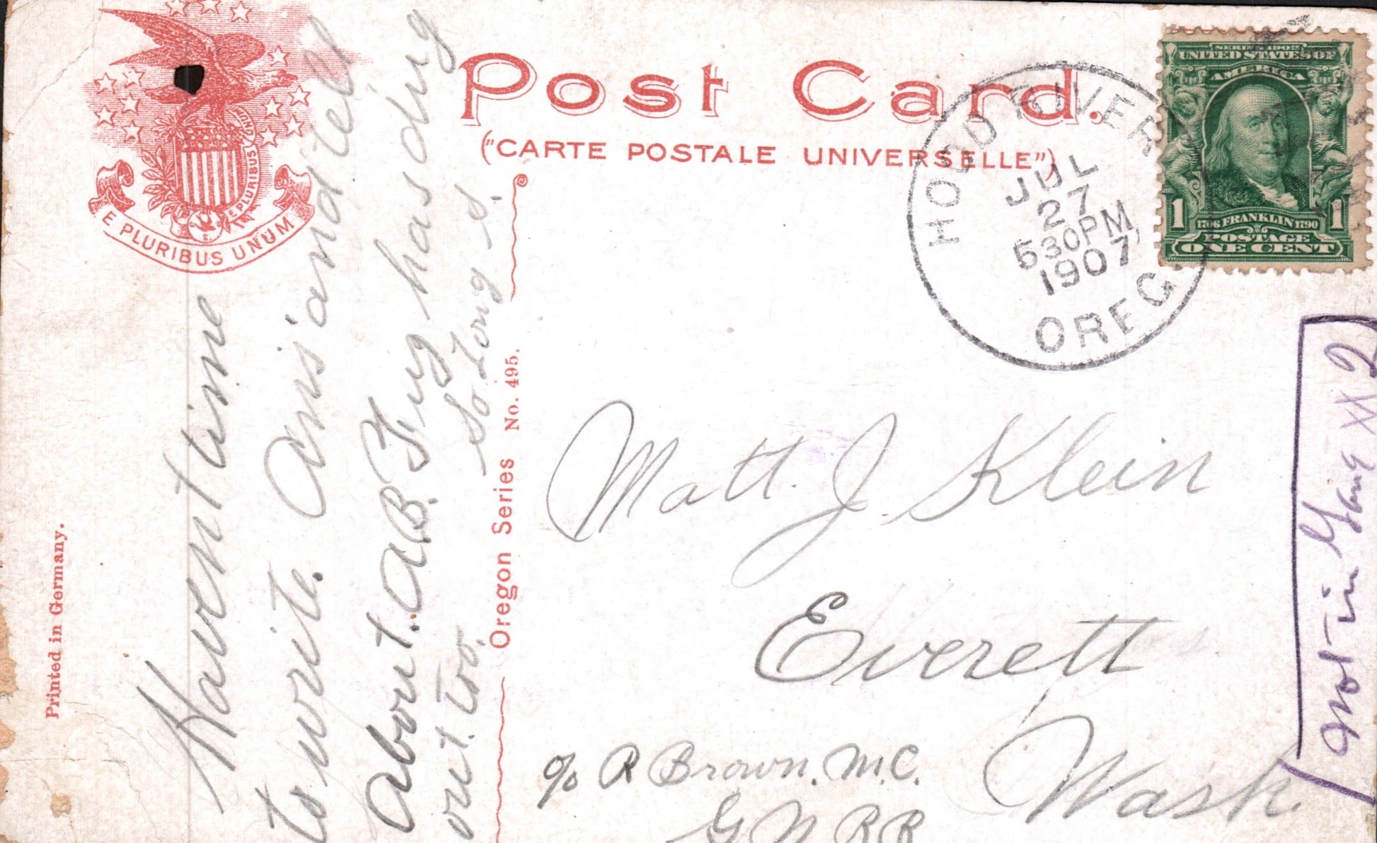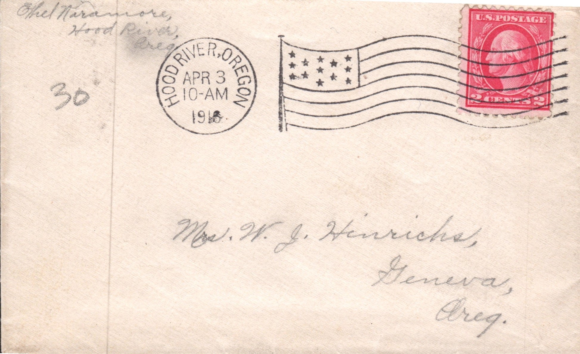 Hood River 1907 duplex on post card; 1916 Flag cancel on small cover; 1929 machine cancel on cover; 2009 Oregon Sesquicentennial pictorial cancel on cover