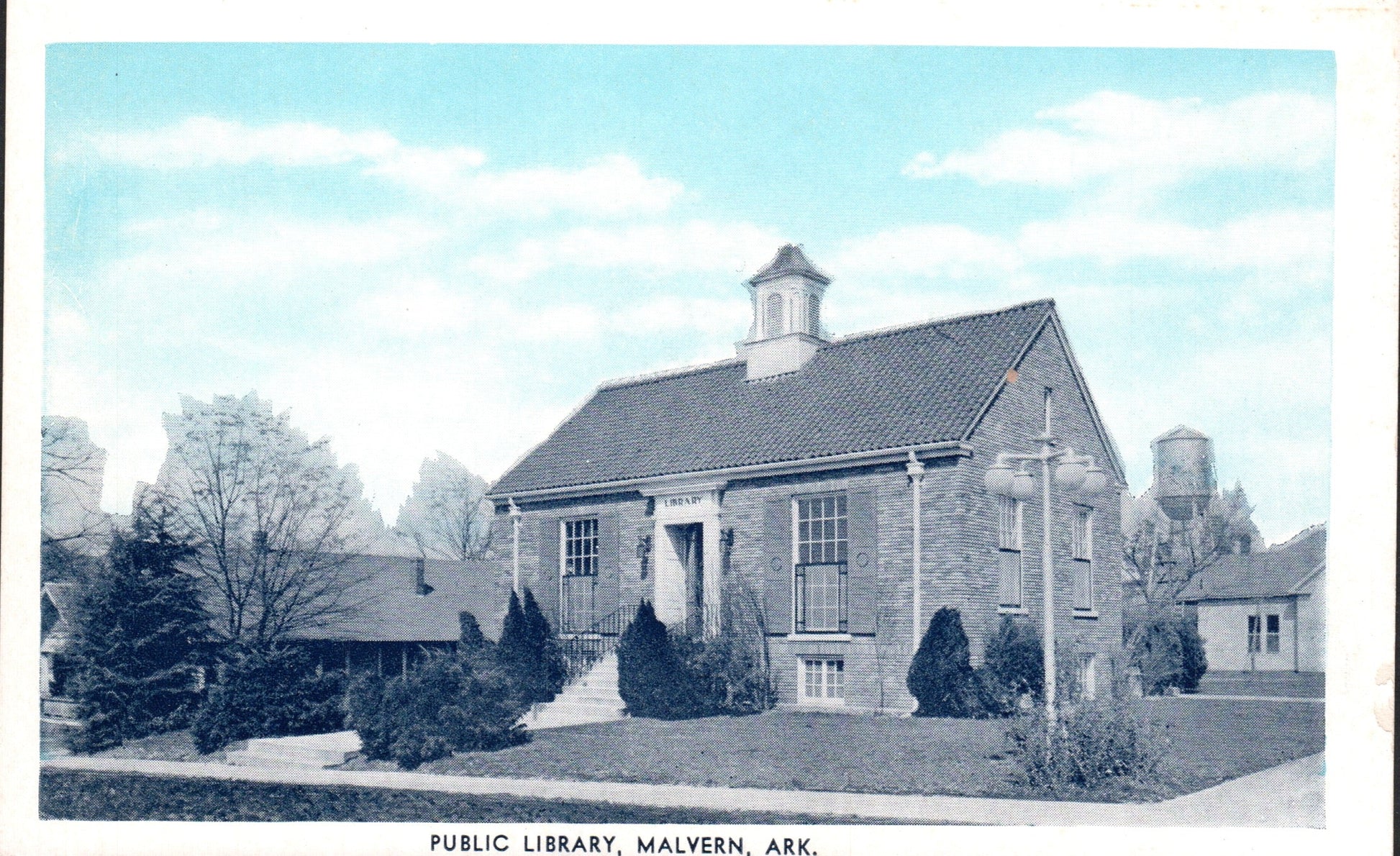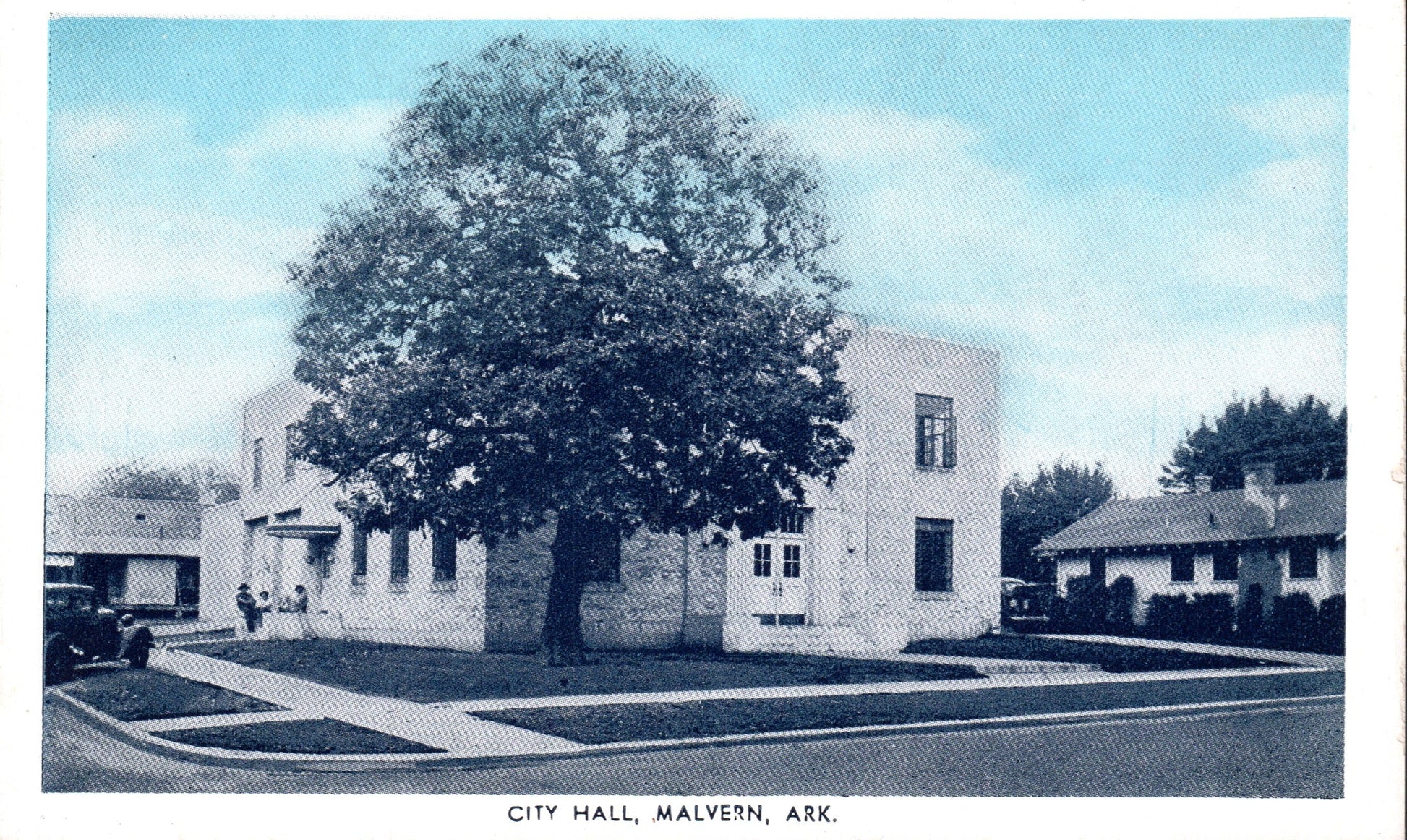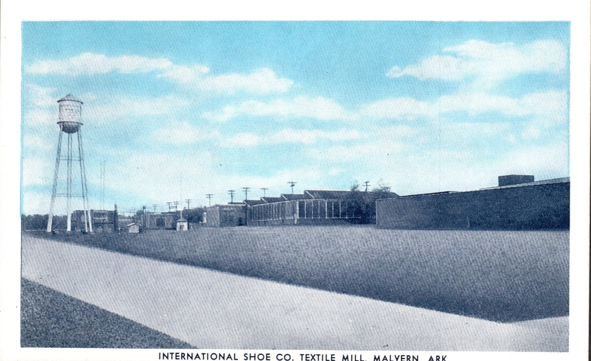 - Malvern Post cards: Malvern Motel [1956]; The following cards are B&W with sky colored blue: International Shoe Co. Textile Plant [2 views, one of the same series but no blue sky]; City Hall; Public Library; Malvern High School; First Methodist Church