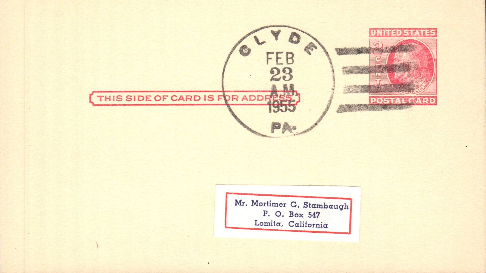 Clyde (1882-1955) 1955 4-bar on LD Postal Card
