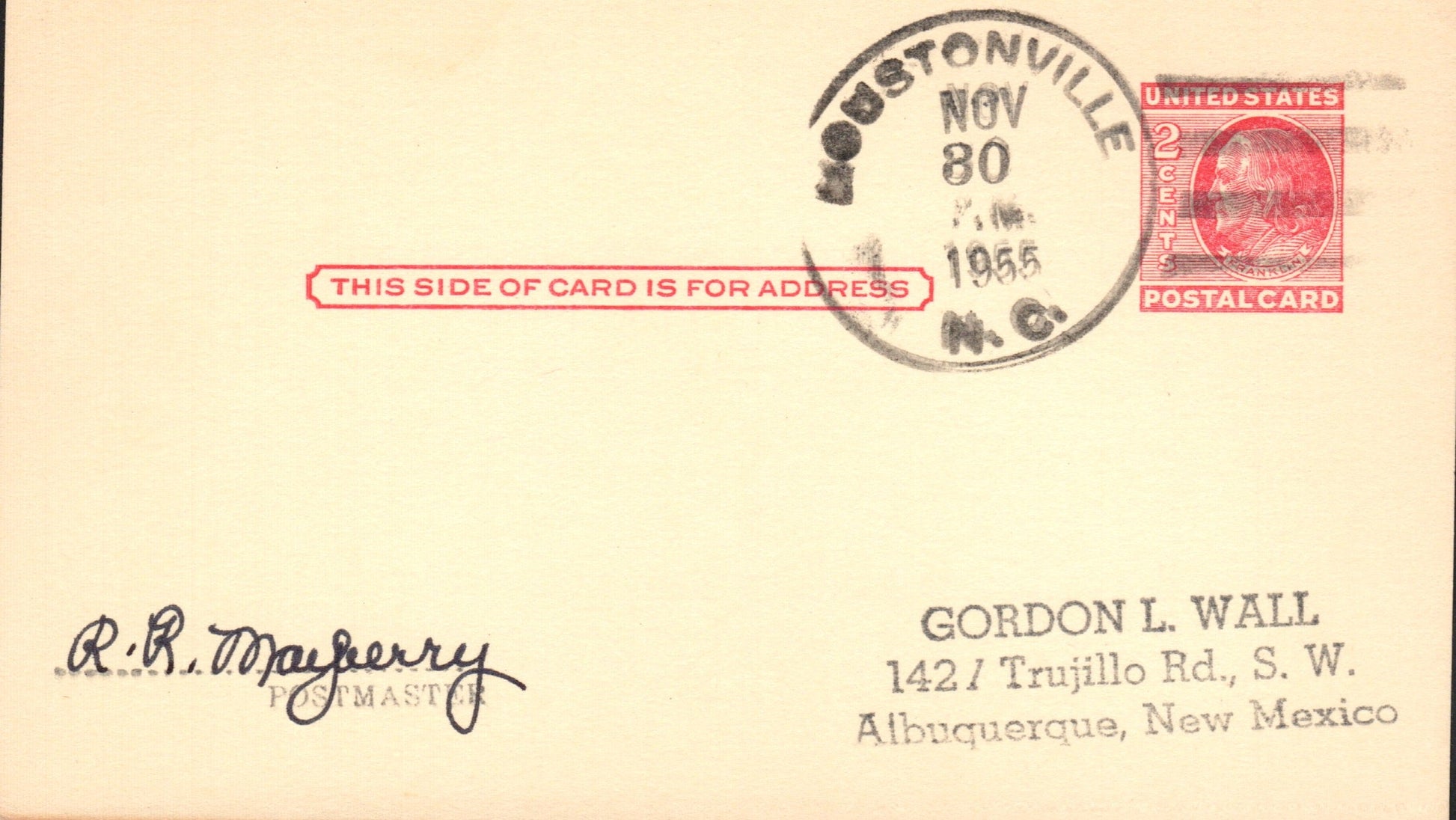 Houstonville (1813/1955) 1955 4-bar 4-bar on LD Postal Card, PM autograph