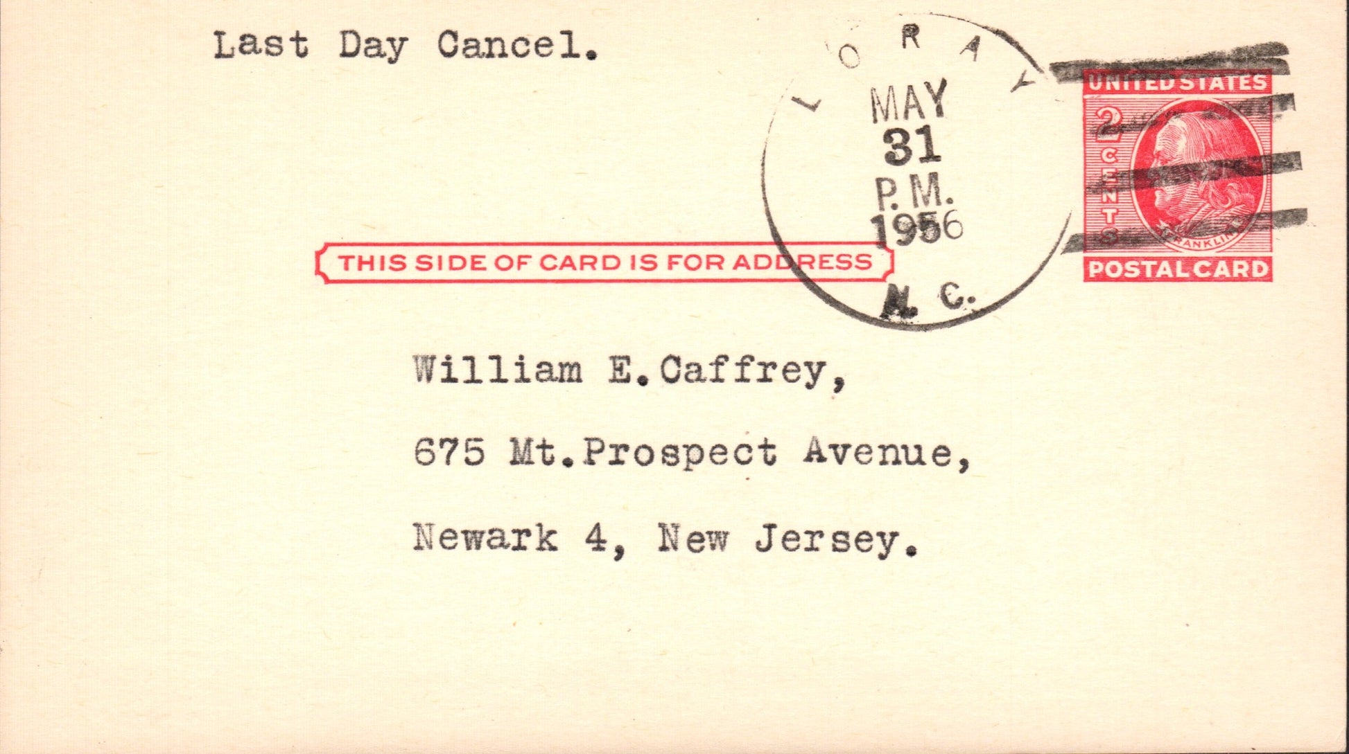 Loray (1903-1956) 1956 4-bar on LD Postal Card