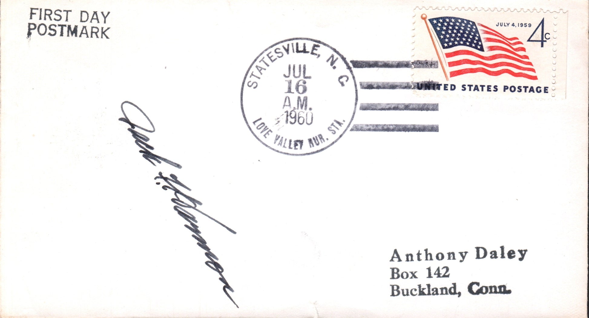 Love Valley RS (Statesville)1960 4-bar on FD cover, autographed