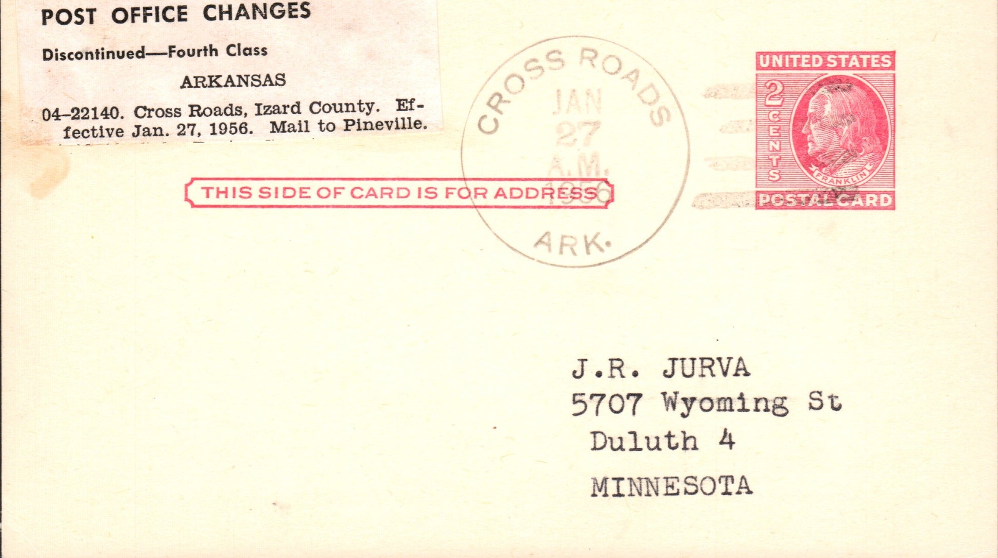 Cross Roads (1911/1956) 1956 4-bar on LD Postal Card
