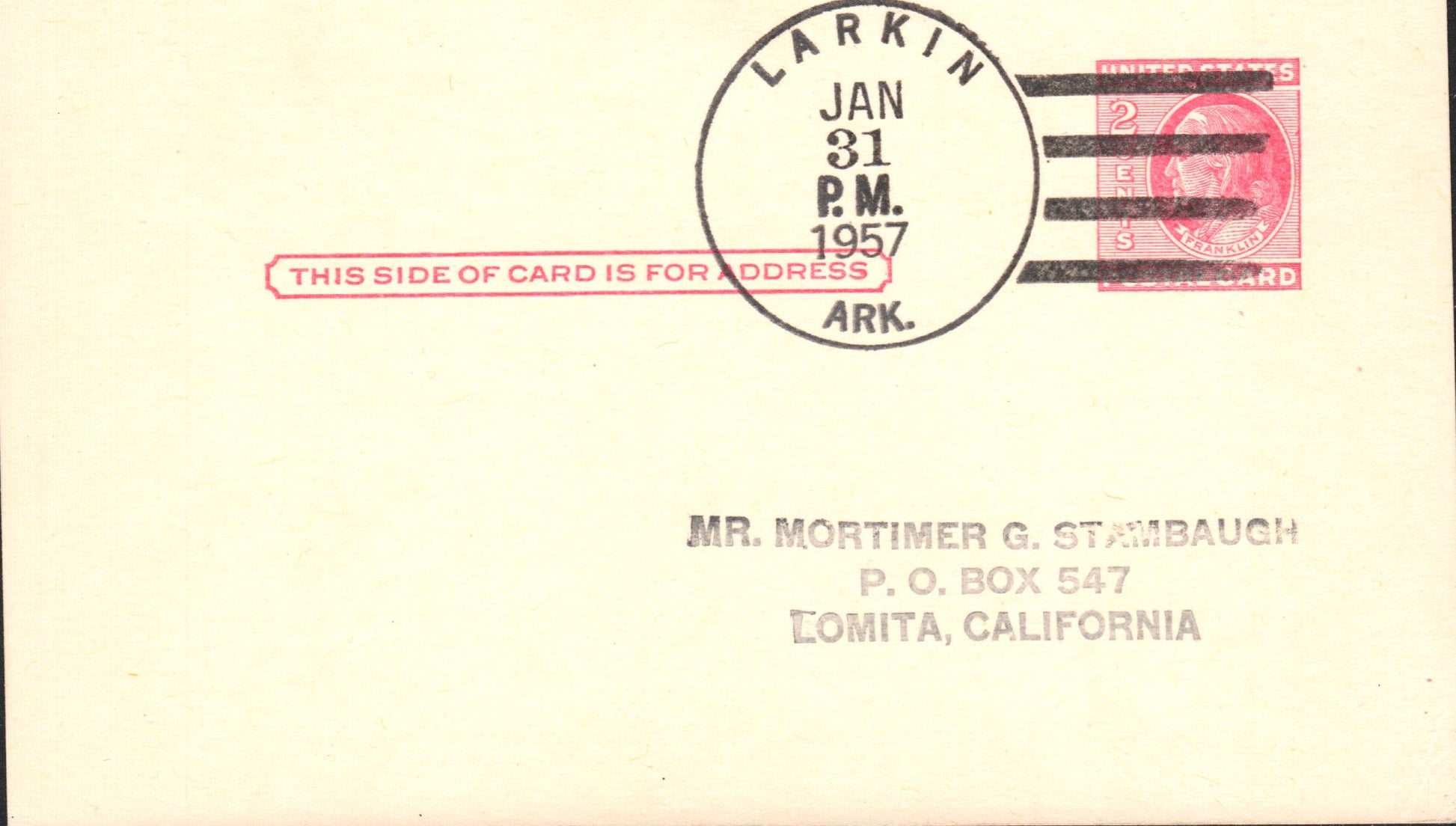 Larkin (1894-1957) 1957 4-bar on LD Postal Card