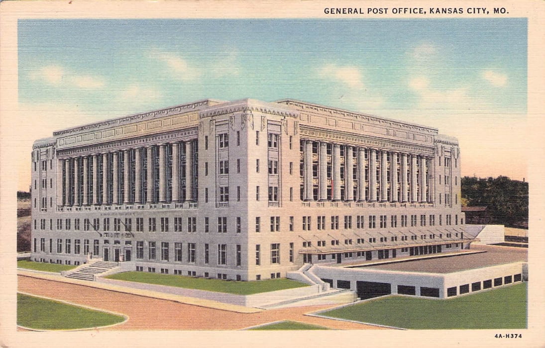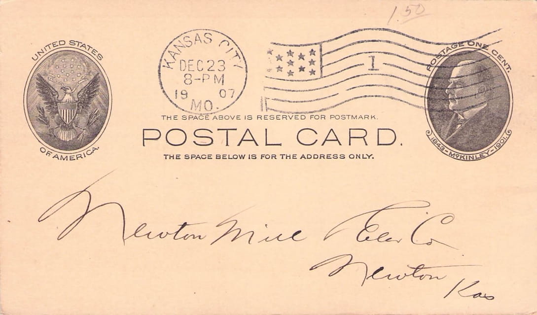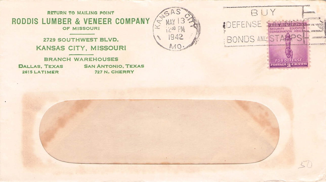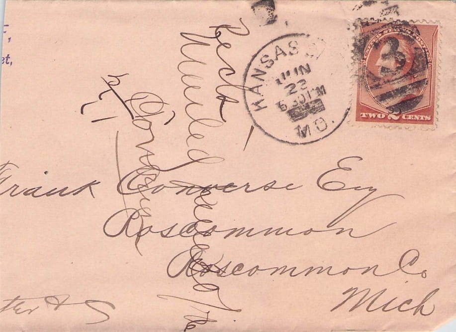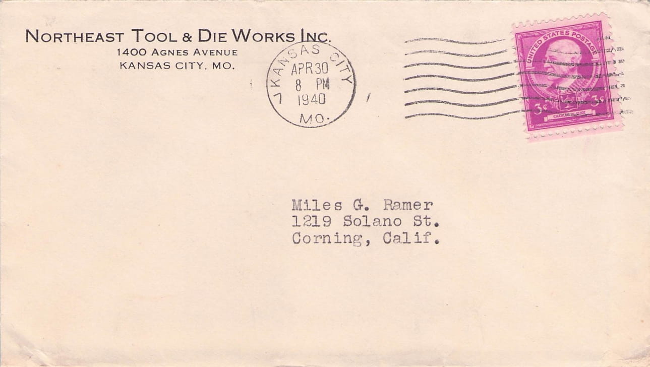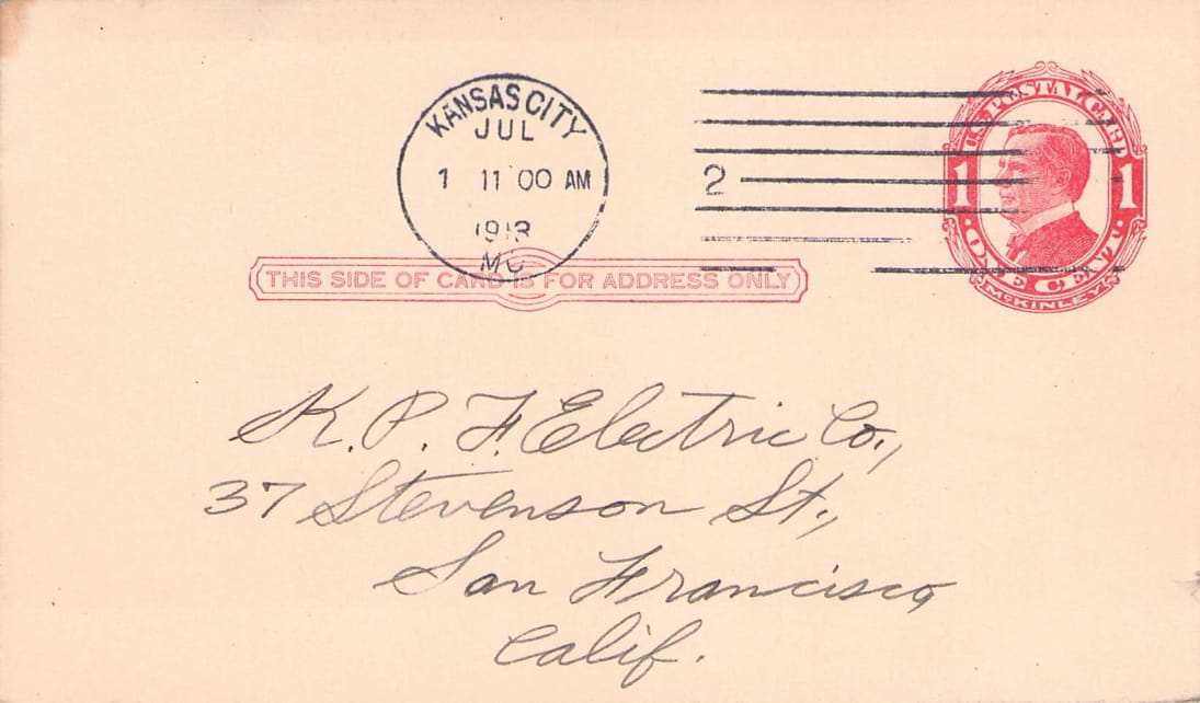 Kansas City 1870s cds on cover; 1880s duplex “3” on trimmed cover, 1896 duplex on postal envelope; 1902 straight-line machine with Goldfield, Colo. (DPO) backstamp on cover opened ragged right; 1907 Flag cancel on Postal Card, Nickel Plate Fast Freight Line rate card; 1907 Flag cancel on Postal Card, Kanawha Dispatch Routes and rates; 1913 7-bar machine on Postal Card; 1914 machine cancel on Postal Card, advertising for Domestic Flour Co.; 1930 duplex on heart-cacheted Air Mail cover; 1933 “Kansas City Smelting Co.” corner; 1934 machine cancel on cover, 8¢ Air Mail stamp; 1940 corner “Northeast Tool & Die Works”; 1940 corner 1940 duplex “2” corner “Aluminum Goods Mfg.” [Wisc.]; 1942 “Roddis Lumber & Veneer Co. corner”; 1946 corner “Electra Products”; 1950 cacheted cover First Day Kans.-Mo. stamp; 1956 “Pray for Peace slogan askew & off top of postal card; 1971 machine on cover; 1971 “Always Use Zip Code” slogan on cover; 19?? machine on cover; 1992 FD of issue of 23¢ Presorted First Class coil stamp on cover.