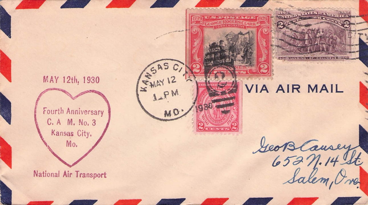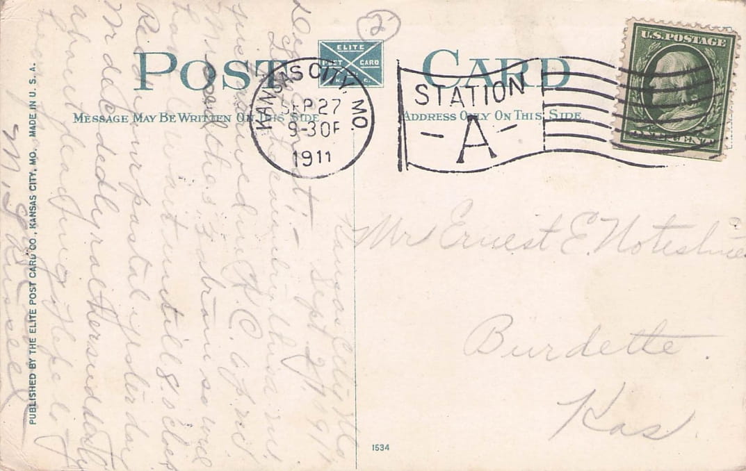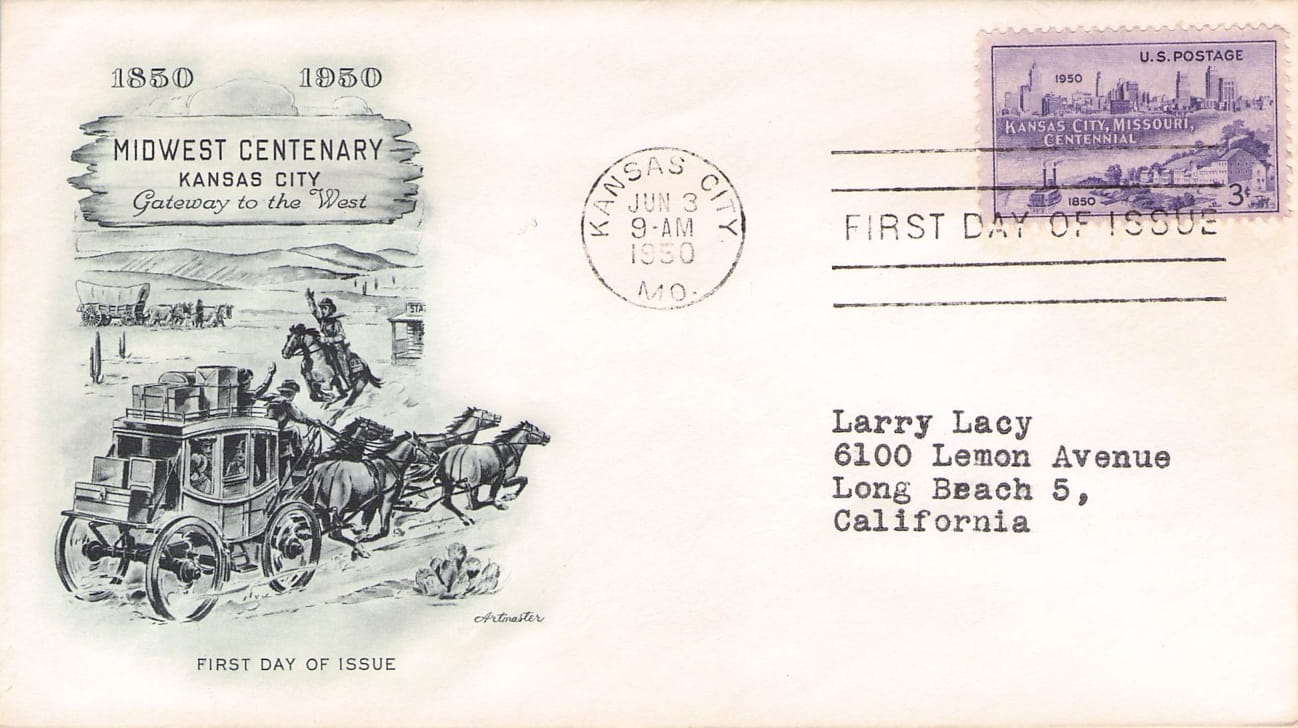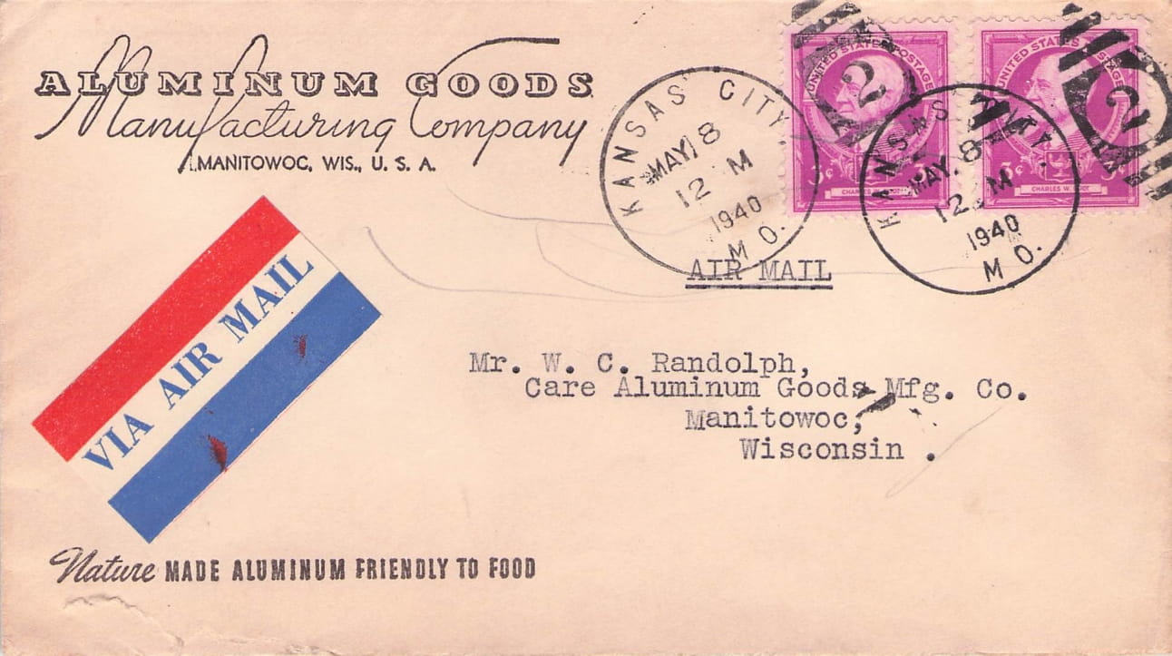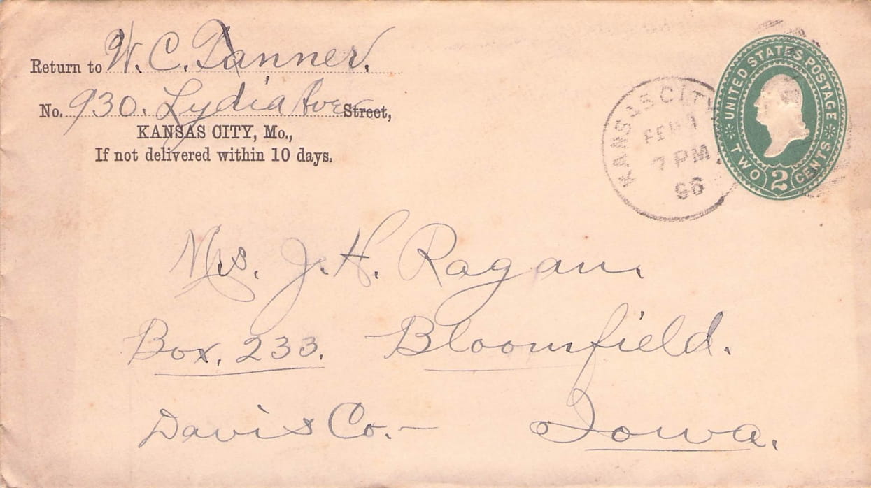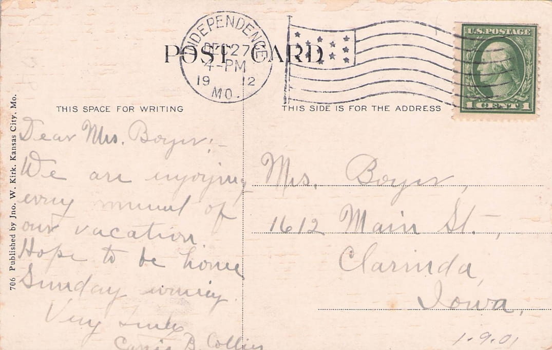 Kansas City 1870s cds on cover; 1880s duplex “3” on trimmed cover, 1896 duplex on postal envelope; 1902 straight-line machine with Goldfield, Colo. (DPO) backstamp on cover opened ragged right; 1907 Flag cancel on Postal Card, Nickel Plate Fast Freight Line rate card; 1907 Flag cancel on Postal Card, Kanawha Dispatch Routes and rates; 1913 7-bar machine on Postal Card; 1914 machine cancel on Postal Card, advertising for Domestic Flour Co.; 1930 duplex on heart-cacheted Air Mail cover; 1933 “Kansas City Smelting Co.” corner; 1934 machine cancel on cover, 8¢ Air Mail stamp; 1940 corner “Northeast Tool & Die Works”; 1940 corner 1940 duplex “2” corner “Aluminum Goods Mfg.” [Wisc.]; 1942 “Roddis Lumber & Veneer Co. corner”; 1946 corner “Electra Products”; 1950 cacheted cover First Day Kans.-Mo. stamp; 1956 “Pray for Peace slogan askew & off top of postal card; 1971 machine on cover; 1971 “Always Use Zip Code” slogan on cover; 19?? machine on cover; 1992 FD of issue of 23¢ Presorted First Class coil stamp on cover.