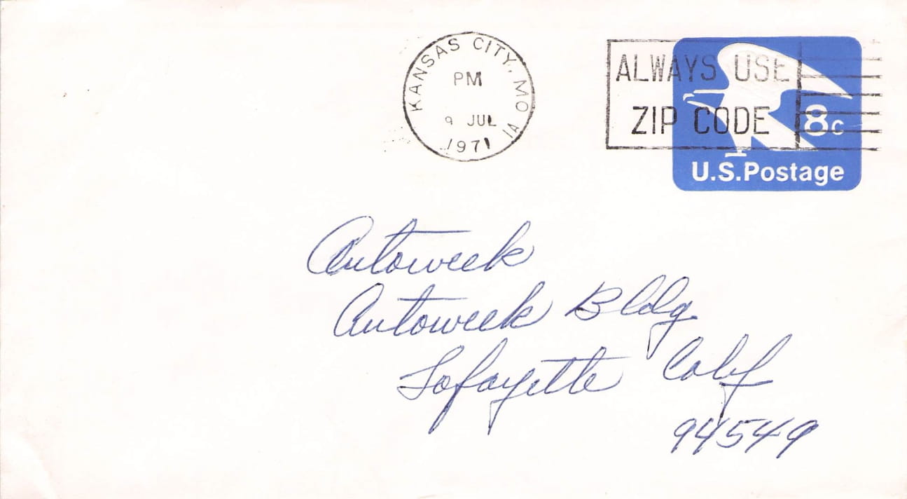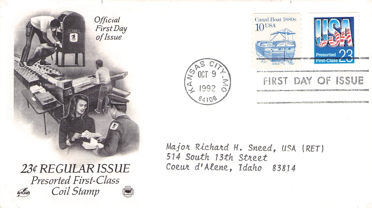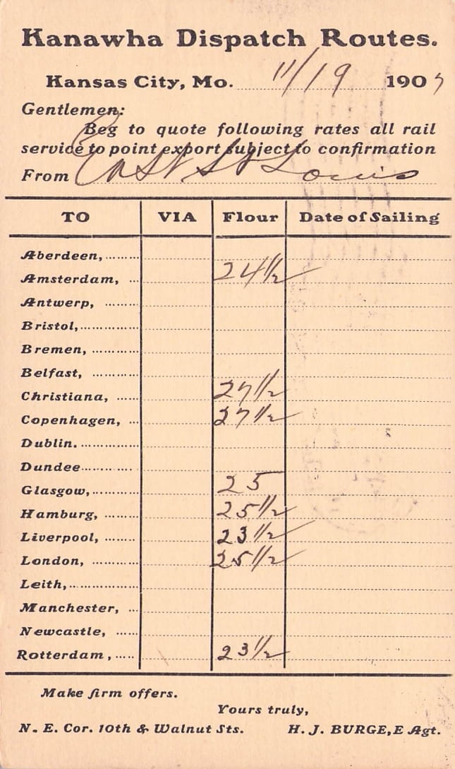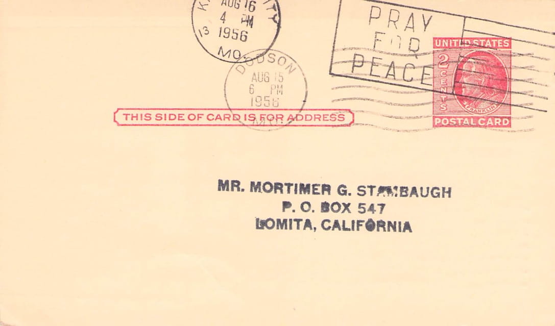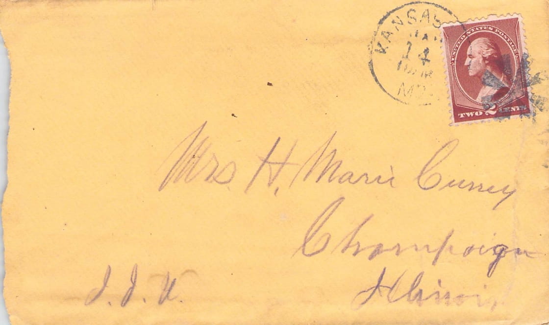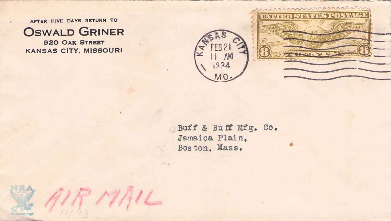 Kansas City 1870s cds on cover; 1880s duplex “3” on trimmed cover, 1896 duplex on postal envelope; 1902 straight-line machine with Goldfield, Colo. (DPO) backstamp on cover opened ragged right; 1907 Flag cancel on Postal Card, Nickel Plate Fast Freight Line rate card; 1907 Flag cancel on Postal Card, Kanawha Dispatch Routes and rates; 1913 7-bar machine on Postal Card; 1914 machine cancel on Postal Card, advertising for Domestic Flour Co.; 1930 duplex on heart-cacheted Air Mail cover; 1933 “Kansas City Smelting Co.” corner; 1934 machine cancel on cover, 8¢ Air Mail stamp; 1940 corner “Northeast Tool & Die Works”; 1940 corner 1940 duplex “2” corner “Aluminum Goods Mfg.” [Wisc.]; 1942 “Roddis Lumber & Veneer Co. corner”; 1946 corner “Electra Products”; 1950 cacheted cover First Day Kans.-Mo. stamp; 1956 “Pray for Peace slogan askew & off top of postal card; 1971 machine on cover; 1971 “Always Use Zip Code” slogan on cover; 19?? machine on cover; 1992 FD of issue of 23¢ Presorted First Class coil stamp on cover.