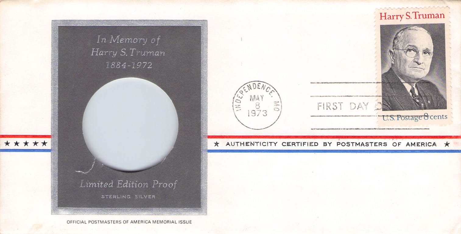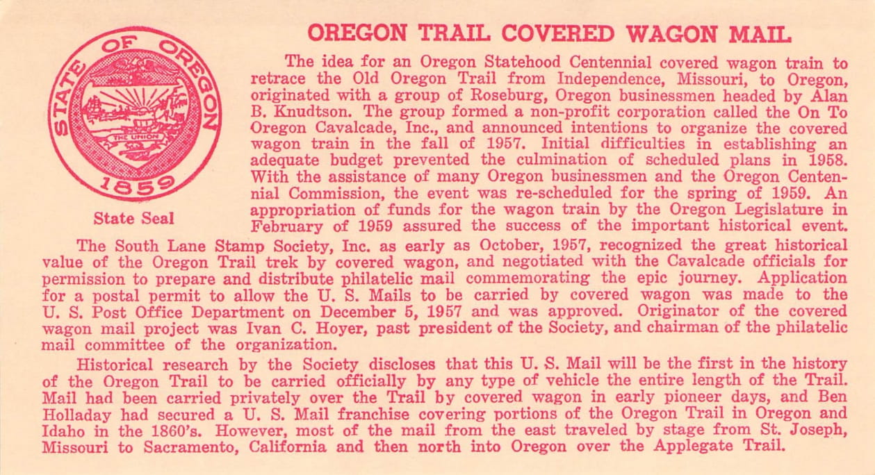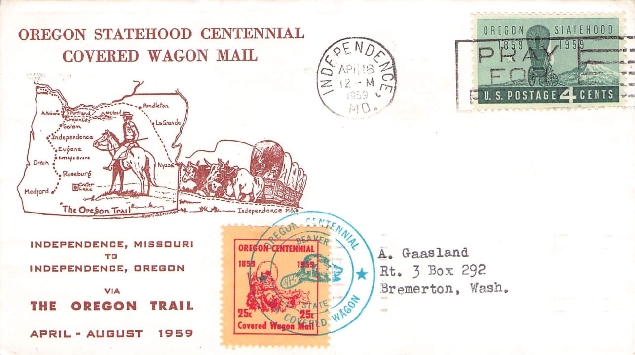 Independence 1912 Flag cancel on post card; 1959 “Pray for Peace” slogan on cacheted cover “Oregon Statehood Centennial Covered Wagon Mail” and separate label and cancel; 1973 FD of Truman stamp on large cover with space for medallion.