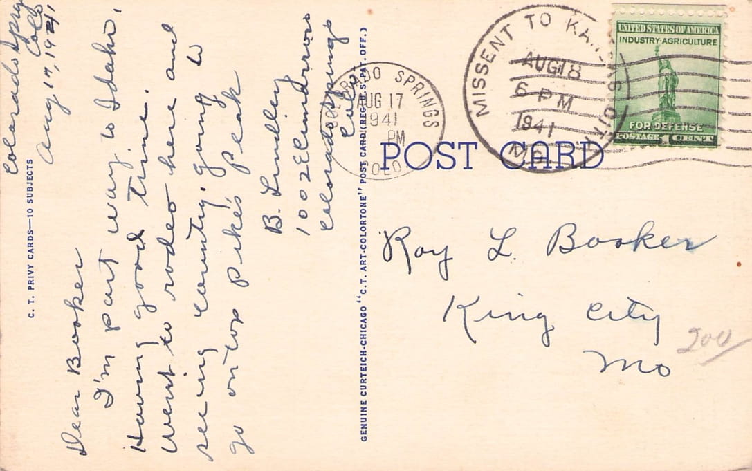 “Missent to Kansas City” 1941 cds on post card from Colo. Springs