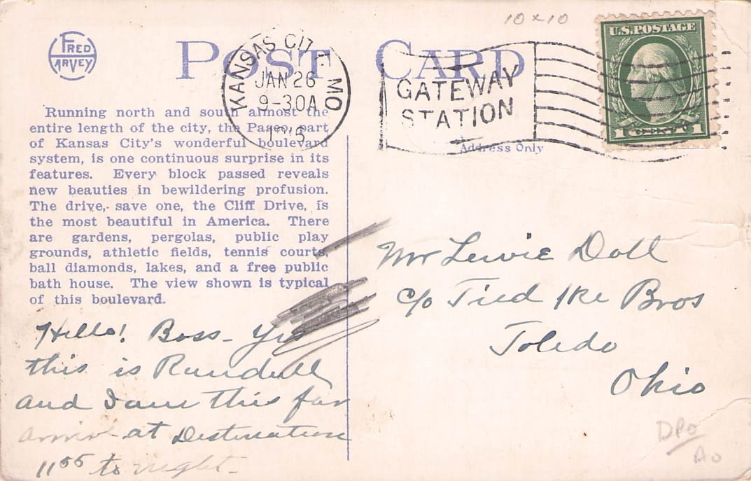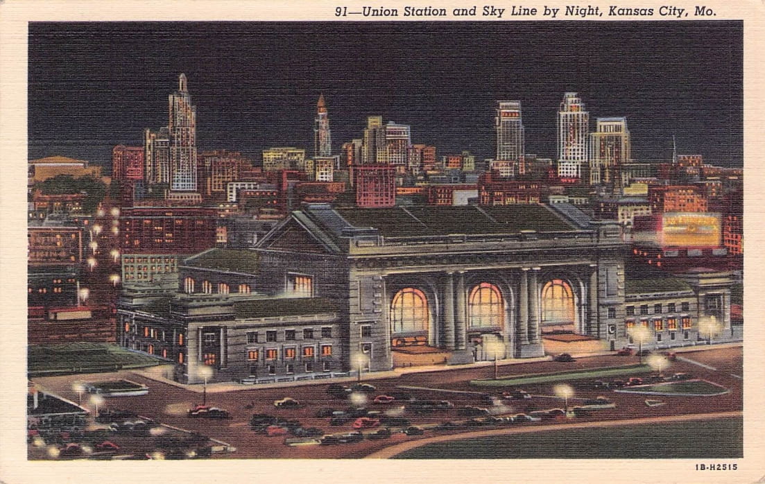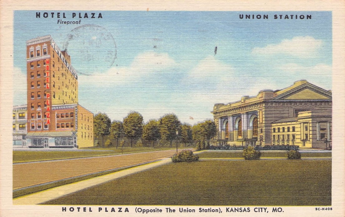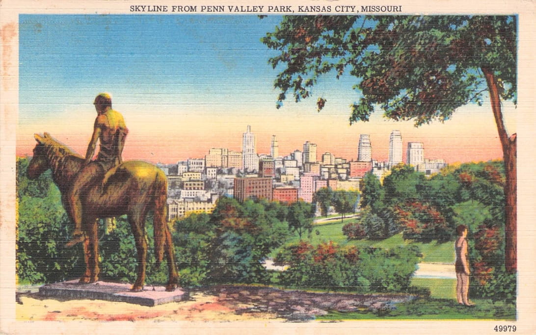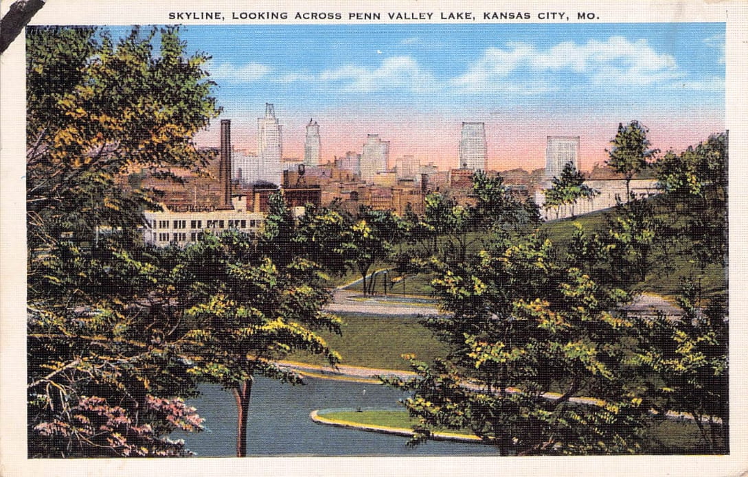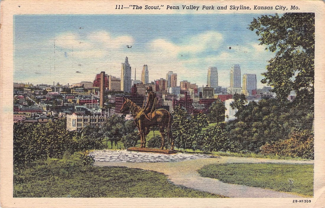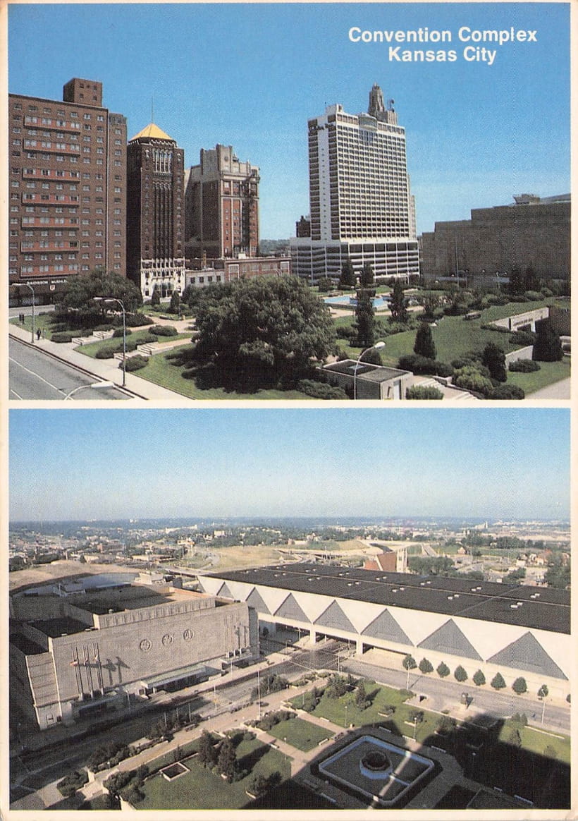 POST CARDS: “Greetings from Kansas City” downtown scene, chrome; 2 downtown views [chrome]; “Skyline, looking across Penn Valley Lake”[linen, 1939, mounting mark]; “Penn Valley Park and Skyline” [linen, 1947]; “Skyline from Penn Valley Park” [linen]; Telephone Building and City Hall [chrome]; Main Street, Macy’s [chrome]; Baltimore Ave.[chrome]; First National Bank building [c.1910]; R.A. Long building [1909]; Power and Light building [chrome]; Auditorium and Plaza; Missouri River, K.C. in background [linen]; Bell Telephone Bldg.; Professional Bldg.; Scarritt Bldg. [1914]; Hotel Baltimore [c.1930]; Baltimore Hotel dining room [c.1910]; Hotel Bellevue “El Casbah Room” linen]; Hotel Continental [1947]; Hotel Muehlenbach [2 views, one 1942 linen, one chrome]; Hotel Phillips lobby [1910]; Hotel President [linen; 1947]; City Market [1912, with horse-drawn]; American Royal Bldg.; Crown Center complex [Continental-size]; Hiway Inn [chrome]; Union Station interior [1920]; Country Club Plaza [two linen views]; Unity Motel aerial view [chrome]; Hotel Plaza & Union Station [linen]; Union Station [linen, 1935, postal smudges on front]; “Union Station and Sky Line by Night” [linen, 1946]; Intercity Viaduct [c.1910]; Court House [1910]; Court House and City Hall [linen]; City Hall [1912]; Post office [linen]; Court House [1909]; Library [1909]; Library [chrome, 1969]; Convention Hall [five views, all pre-1914]; Convention Complex [chrome]; Auditorium [1907]; Municipal Auditorium [4 views, one chrome, 3 linen, one is interior]; Convention Complex [Continental, dual view, 1983]; Nelson Gallery of Art [linen]; Elks Club [1909]; Armour Memorial Home [chrome]; Calvary Baptist church c.1910; Church of Christ c.1910; Museum [linen]; Benedictine Sanctuary [1961]; Catholic Cathedral [linen]; Methodist Church c.1910; First Baptist Church c.1910; Christian Church [1911]; Westminster Congregational Church [c.1910]; “Pergola on the Paseo” [1906]; “Paseo Looking North” [c.1910]; Armour Boulevard [1911]; “The Spring on Cliff Drive [1908, horse-drawn]; Independence Boulevard [1905]; “Santa Fe Trail Through Penn Valley Park” [c.1910]; Miniature Steam Railway [B&W]; 26 diff. Parks and Monuments. most early, the best of which is a Sunday School picnic game; 5 Drives & Bridges; Armour-Swift Bridge [c.1910]; Burlington Bridge [1911]