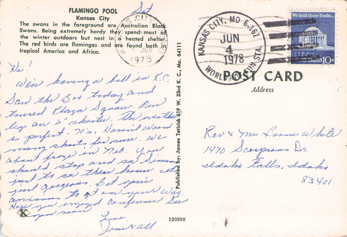 Worlds of Fun Sta. 1978 4-bar overstruck on zoo post card